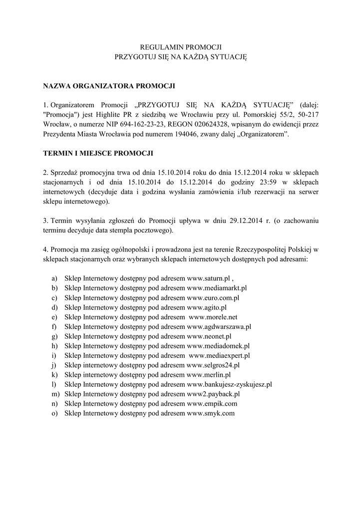 REGULAMIN PROMOCJI PRZYGOTUJ SIĘ NA KAŻDĄ SYTUACJĘ NAZWA ORGANIZATORA PROMOCJI 1. Organizatorem Promocji „PRZYGOTUJ SIĘ NA KAŻDĄ SYTUACJĘ” (dalej: "Promocja") jest Highlite PR z siedzibą we Wrocławiu przy ul. Pomorskiej 55/2, 50-217 Wrocław, o numerze NIP 694-162-23-23, REGON 020624328, wpisanym do ewidencji przez Prezydenta Miasta Wrocławia pod numerem 194046, zwany dalej „Organizatorem”. TERMIN I MIEJSCE PROMOCJI 2. Sprzedaż promocyjna trwa od dnia 15.10.2014 roku do dnia 15.12.2014 roku w sklepach stacjonarnych i od dnia 15.10.2014 do 15.12.2014 do godziny 23:59 w sklepach internetowych (decyduje data i godzina wysłania zamówienia i/lub rezerwacji na serwer sklepu internetowego). 3. Termin wysyłania zgłoszeń do Promocji upływa w dniu 29.12.2014 r. (o zachowaniu terminu decyduje data stempla pocztowego). 4. Promocja ma zasięg ogólnopolski i prowadzona jest na terenie Rzeczypospolitej Polskiej w sklepach stacjonarnych oraz wybranych sklepach internetowych dostępnych pod adresami: a) b) c) d) e) f) g) h) i) j) k) l) m) n) o) Sklep Internetowy dostępny pod adresem www.saturn.pl , Sklep Internetowy dostępny pod adresem www.mediamarkt.pl Sklep Internetowy dostępny pod adresem www.euro.com.pl Sklep Internetowy dostępny pod adresem www.agito.pl Sklep Internetowy dostępny pod adresem www.morele.net Sklep Internetowy dostępny pod adresem www.agdwarszawa.pl Sklep Internetowy dostępny pod adresem www.neonet.pl Sklep Internetowy dostępny pod adresem www.mediadomek.pl Sklep Internetowy dostępny pod adresem www.mediaexpert.pl Sklep internetowy dostępny pod adresem www.selgros24.pl Sklep internetowy dostępny pod adresem www.merlin.pl Sklep Internetowy dostępny pod adresem www.bankujesz-zyskujesz.pl Sklep Internetowy dostępny pod adresem www2.payback.pl Sklep Internetowy dostępny pod adresem www.empik.com Sklep Internetowy dostępny pod adresem www.smyk.com PRODUKTY OBJĘTE SPRZEDAŻĄ PROMOCYJNĄ 5. Sprzedażą promocyjną objęte są wybrane produkty spośród golarek, trymerów i maszynek do włosów sprzedawane pod marką „Remington” (dalej: "Produkty promocyjne"). Lista produktów promocyjnych stanowi Załącznik nr 3 UCZESTNICY PROMOCJI 6. Uczestnikami Promocji mogą być wyłącznie pełnoletnie osoby fizyczne. 7. W Promocji nie mogą brać udziału pracownicy Organizatora, Loyal Concept i Spectrum Brands Poland Sp. z o.o. oraz członkowie ich rodzin. Przez członków rodziny rozumie się: rodziców, dzieci, małżonków i rodzeństwo, przy czym zastrzeżenie dotyczy osób, które brały bezpośredni udział przy realizacji Promocji oraz tych, które pracowały nad projektem i wdrożeniem Promocji. DANE OSOBOWE 8. Dane osobowe Uczestników będą przetwarzane w celu przeprowadzenia niniejszej Promocji oraz wydania Gratisów przez Highlite PR z siedzibą we Wrocławiu przy ul. Pomorskiej 55/2, 50-217 Wrocław i Loyal Concept Sp. z o.o. z siedzibą w Warszawie przy ul. Tużyckiej 8 lok. 6, 03-683 Warszawa. Administratorem danych osobowych jest Spectrum Brands Poland sp. z o.o. z siedzibą w Warszawie, przy ul. Bitwy Warszawskiej 1920r. 7a, 02366 Warszawa. Podanie danych jest dobrowolne, lecz niezbędne dla potrzeb przeprowadzenia Promocji i wydania Gratisów. Dane osobowe Uczestników – po wyrażeniu przez nich zgody, będą również przetwarzane do celów marketingowych przez Spectrum Brands Poland oraz Highlite PR zgodnie z ustawą z dn. 29.08.1997 r. o ochronie danych osobowych (tekst jedn. Dz.U. z 2002, Nr 101, poz. 926 z późn. zm.). Podanie danych jest dobrowolne. Uczestnikom Promocji przysługuje prawo dostępu do treści swoich danych oraz ich poprawiania. NAGRODY W PROMOCJI 9. W Promocji przewidziano gratisy (dalej: „Gratisy”) za zakup produktu Remington objętego Promocją: Latarkę VARTA INDESTRUCTIBLE o wartości rynkowej 99 PLN każdy Gratis. WARUNKI UCZESTNICTWA W PROMOCJI 10. Podstawą do wzięcia udziału w Promocji może być jedynie zakup produktów nowych, dostępnych tylko i wyłącznie w sklepach określonych w punkcie 4 niniejszego Regulaminu, w stosunku do których gwarantem jest Spectrum Brands Poland Sp. z o.o., oraz w terminie, o którym jest mowa w punkcie 2 niniejszego Regulaminu. 11. Aby wziąć udział w Promocji Uczestnik zobowiązany jest spełnić łącznie następujące warunki: 11.1. Dokonać w terminie od dnia 15.10.2014 r. do dnia 15.12.2014 r. zakupu produktu spośród wybranych golarek, trymerów i maszynek do włosów marki Remington. Listę Produktów Promocyjnych stanowi Załącznik nr 3. Zakup Produktów Promocyjnych musi być udokumentowany jednym dowodem zakupu (paragon lub faktura VAT), upoważniającym do wysłania jednego Zgłoszenia do Promocji, 11.2. W ciągu 14 dni od daty wskazanej na dowodzie zakupu, ale nie później niż do 29.12.2014 roku (o zachowaniu terminu decyduje data stempla pocztowego) przekazać swoje zgłoszenie w jednej z dwóch form: a.) wysłać wypełniony i podpisany formularz rejestracyjny dostępny na ulotce wraz z kopią dowodu zakupu i oryginalnym kodem kreskowym EAN wyciętym z opakowania Produktu Promocyjnego na adres: Loyal Concept „PRZYGOTUJ SIĘ NA KAŻDĄ SYTUACJĘ” ul. Tużycka 8 lok. 6, 03-683 Warszawa, lub b.) wypełnić i zapisać formularz rejestracyjny w wersji elektronicznej na stronie www.kazdasytuacja.pl, a samą kopię dowodu zakupu i oryginalny kod kreskowy EAN wycięty z opakowania Produktu Promocyjnego wysłać na adres: Loyal Concept „PRZYGOTUJ SIĘ NA KAŻDĄ SYTUACJĘ” ul. Tużycka 8 lok. 6, 03-683 Warszawa. 12. W skład prawidłowego Zgłoszenia do Promocji wchodzi: a.) Kopia dowodu zakupu Produktu Promocyjnego (faktura VAT lub paragon fiskalny), oraz b.) Oryginalny kod kreskowy wycięty z opakowania Produktu Promocyjnego, oraz c.) Kompletnie wypełniony, w formie papierowej lub elektronicznej, formularz rejestracyjny w Promocji „PRZYGOTUJ SIĘ NA KAŻDĄ SYTUACJĘ”, który dostępny jest na ulotce i na stronie www.kazdasytuacja.pl, 