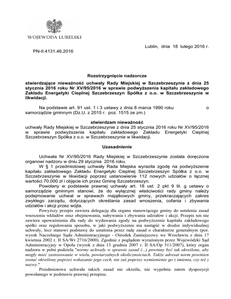 Lublin, dnia 18 lutego 2016 r. PN-II.4131.46.2016 Rozstrzygnięcie nadzorcze stwierdzające nieważność uchwały Rady Miejskiej w Szczebrzeszynie z dnia 25 stycznia 2016 roku Nr XV/95/2016 w sprawie podwyższenia kapitału zakładowego Zakładu Energetyki Cieplnej Szczebrzeszyn Spółka z o.o. w Szczebrzeszynie w likwidacji. Na podstawie art. 91 ust. 1 i 3 ustawy z dnia 8 marca 1990 roku samorządzie gminnym (Dz.U. z 2015 r. poz. 1515 ze zm.) o stwierdzam nieważność uchwały Rady Miejskiej w Szczebrzeszynie z dnia 25 stycznia 2016 roku Nr XV/95/2016 w sprawie podwyższenia kapitału zakładowego Zakładu Energetyki Cieplnej Szczebrzeszyn Spółka z o.o. w Szczebrzeszynie w likwidacji. Uzasadnienie Uchwała Nr XV/95/2016 Rady Miejskiej w Szczebrzeszynie została doręczona organowi nadzoru w dniu 29 stycznia 2016 roku. W § 1 przedmiotowej uchwały Rada Miejska wyraziła zgodę na podwyższenie kapitału zakładowego Zakładu Energetyki Cieplnej Szczebrzeszyn Spółka z o.o. w Szczebrzeszynie w likwidacji poprzez ustanowienie 112 nowych udziałów o łącznej wartości 70.000 zł i objęcie ich przez Gminę Szczebrzeszyn. Powołany w podstawie prawnej uchwały art. 18 ust. 2 pkt 9 lit. g ustawy o samorządzie gminnym stanowi, że do wyłącznej właściwości rady gminy należy podejmowanie uchwał w sprawach majątkowych gminy, przekraczających zakres zwykłego zarządu, dotyczących określania zasad wnoszenia, cofania i zbywania udziałów i akcji przez wójta. Powyższy przepis zawiera delegację dla organu stanowiącego gminy do ustalenia zasad wnoszenia wkładów oraz obejmowania, nabywania i zbywania udziałów i akcji. Przepis ten nie zawiera upoważnienia dla rady do wydawania zgody na podwyższenie kapitału zakładowego spółki oraz regulowania sposobu, w jaki podwyższenie ma nastąpić w drodze indywidualnej uchwały, lecz stanowi podstawę do ustalenia przez radę zasad o charakterze generalnym (por. wyrok Naczelnego Sądu Administracyjnego - Ośrodek Zamiejscowy we Wrocławiu z dnia 17 kwietnia 2002 r. II SA/Wr 2716/2000). Zgodnie z poglądem wyrażonym przez Wojewódzki Sąd Administracyjny w Opolu (wyrok z dnia 13 grudnia 2007 r. II SA/Op 511/2007), który organ nadzoru w pełni podziela "normy uchwały w sprawie zasad (...) powinny być tak określone, aby mogły mieć zastosowanie w wielu, powtarzalnych okolicznościach. Także adresat norm powinien zostać określony poprzez wskazanie jego cech, nie zaś poprzez wymienienie go z imienia, czy też z nazwy." Przedmiotowa uchwała takich zasad nie określa, nie wypełnia zatem dyspozycji powołanego w podstawie prawnej przepisu. W świetle przepisów ustawy o samorządzie gminnym wymagane jest zatem uprzednie uregulowanie przez radę gminy zasad wnoszenia, cofania i zbywania udziałów i akcji w akcie o charakterze generalnym. Tymi zasadami – określonymi w uchwale stanowiącej akt prawa miejscowego – organ wykonawczy gminy będzie mógł kierować się przy wnoszeniu, cofaniu i zbywaniu udziałów i akcji (por. wyrok NSA z dnia 6 września 2002 r. sygn. II SA/Wr 797/02, OwSS 2003/1/12). Z ustaleń organu nadzoru wynika, iż Rada Miejska w Szczebrzeszynie nie podjęła dotychczas uchwały określającej zasady, o których mowa w art. 18 ust. 2 pkt 9 lit. g ustawy. Określenie zasad wnoszenia, cofania i zbywania udziałów i akcji w uchwale rady gminy może dotyczyć konkretnych sytuacji, jednakże powinno mieć charakter generalny, ponieważ uchwała o charakterze indywidualnym narusza przepis art. 18 ust. 2 pkt 9 lit. g ustawy. Ustalenia, o których mowa wyżej, mogą nakładać na organ wykonawczy takie wymogi, jak: obowiązek uzyskania wstępnej opinii rady w sprawach dotyczących wnoszenia, cofania i zbywania udziałów i akcji (por. wyrok NSA z dnia 6 września 2002 r. II SA/Wr 797/02, OwSS 2003, Nr 1, poz. 12), obowiązek uzyskania zgody rady na wnoszenie, cofanie i zbywanie udziałów i akcji o określonej wartości (por. wyrok NSA z dnia 9 lutego 2005 r. GSK 144/04); obowiązek dokonywania analiz przed objęciem lub nabyciem udziałów lub akcji spółki określających, czy spełnione są przesłanki uczestnictwa gminy w takiej spółce; obowiązek uzyskania pozytywnej opinii właściwej merytorycznie komisji rady gminy odnośnie do przedmiotu działalności spółki. Przedmiotowa uchwała dotyczy podwyższenia kapitału zakładowego i objęcia nowych udziałów przez Gminę Szczebrzeszyn Zakładu Energetyki Cieplnej Szczebrzeszyn Spółka z o.o. w likwidacji. Jest to więc niewątpliwie akt o charakterze indywidualnym, któremu nie można przypisać waloru uchwały w sprawie zasad wnoszenia, cofania i zbywania udziałów i akcji przez Burmistrza. Sformułowania zawarte w uchwale przesądzają o jej indywidualnym charakterze i pojedynczym zastosowaniu. Biorąc powyższe pod uwagę orzeczono jak w sentencji rozstrzygnięcia. Na niniejsze rozstrzygnięcie nadzorcze przysługuje skarga do Wojewódzkiego Sądu Administracyjnego, złożona za moim pośrednictwem w terminie 30 dni od dnia doręczenia rozstrzygnięcia nadzorczego. w/z WOJEWODY LUBELSKIEGO Robert Gmitruczuk WICEWOJEWODA /podpisano elektronicznie/ Otrzymują: 1)Przewodniczący Rady Miejskiej w Szczebrzeszynie 2) Burmistrz Szczebrzeszyna Potwierdzam zgodność kopii z dokumentem elektronicznym: Identyfikator dokumentu 1022740.1940292.1619539 RN-Szczebrzeszyn-podwyższenie kapitału Nazwa dokumentu zakładowego.pdf RN-Szczebrzeszyn-podwyższenie kapitału Tytuł dokumentu zakładowego doc.doc Sygnatura dokumentu PN-II.4131.46.2016 Data dokumentu 2016-02-18 14:16:50 1B1F5A9CB61BF4D23CCF370B8B9C1B3B60 Skrót dokumentu E201B7 Wersja dokumentu 1.6 Data podpisu 2016-02-18 14:15:33 Podpisane przez Robert Gmitruczuk wicewojewoda lubelski EZD 3.17.1457.1936.6022 Data wydruku: Autor wydruku: 2016-02-25 13:57:13 Staroch Marta inspektor wojewódzki