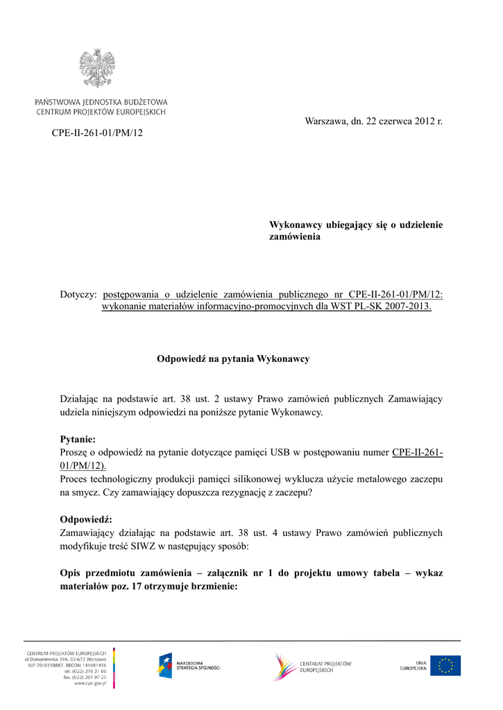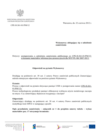 Warszawa, dn. 22 czerwca 2012 r. CPE-II-261-01/PM/12 Wykonawcy ubiegający się o udzielenie zamówienia Dotyczy: postępowania o udzielenie zamówienia publicznego nr CPE-II-261-01/PM/12: wykonanie materiałów informacyjno-promocyjnych dla WST PL-SK 2007-2013. Odpowiedź na pytania Wykonawcy Działając na podstawie art. 38 ust. 2 ustawy Prawo zamówień publicznych Zamawiający udziela niniejszym odpowiedzi na poniższe pytanie Wykonawcy. Pytanie: Proszę o odpowiedź na pytanie dotyczące pamięci USB w postępowaniu numer CPE-II-26101/PM/12). Proces technologiczny produkcji pamięci silikonowej wyklucza użycie metalowego zaczepu na smycz. Czy zamawiający dopuszcza rezygnację z zaczepu? Odpowiedź: Zamawiający działając na podstawie art. 38 ust. 4 ustawy Prawo zamówień publicznych modyfikuje treść SIWZ w następujący sposób: Opis przedmiotu zamówienia – załącznik nr 1 do projektu umowy tabela – wykaz materiałów poz. 17 otrzymuje brzmienie: 17. Pendrive materiał: twardy silikon, kształt składający się z flagi Unii Europejskiej oraz logo Programu. Kolorystyka - pełen kolor. Pojemność 8 GB. Szerokość 30mm (+/-5mm), wysokość 50mm (+/- 5mm), grubość 8mm (+/-1mm) Kość pamięci umiejscowiona „we fladze EU”, zaś logo Programu jest ściągane, w jego wnętrzu chowa się końcówka USB. Gwiazdki na fladze EU oraz napis PL-SK 2007-2013 przy logo Programu tłoczone na zewnątrz. Pakowane jednostkowo w zbiorczym opakowaniu. 300 sztuk