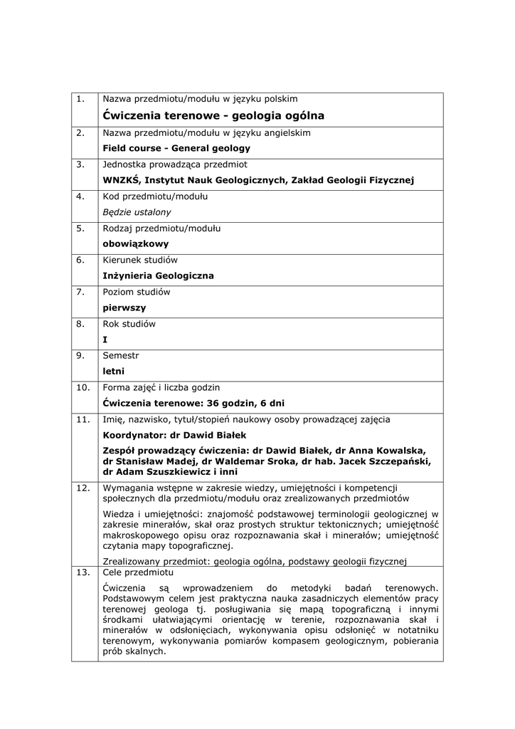 1. Nazwa przedmiotu/modułu w języku polskim Ćwiczenia terenowe - geologia ogólna 2. Nazwa przedmiotu/modułu w języku angielskim Field course - General geology 3. Jednostka prowadząca przedmiot WNZKŚ, Instytut Nauk Geologicznych, Zakład Geologii Fizycznej 4. Kod przedmiotu/modułu Będzie ustalony 5. Rodzaj przedmiotu/modułu obowiązkowy 6. Kierunek studiów Inżynieria Geologiczna 7. Poziom studiów pierwszy 8. Rok studiów I 9. Semestr letni 10. Forma zajęć i liczba godzin Ćwiczenia terenowe: 36 godzin, 6 dni 11. Imię, nazwisko, tytuł/stopień naukowy osoby prowadzącej zajęcia Koordynator: dr Dawid Białek Zespół prowadzący ćwiczenia: dr Dawid Białek, dr Anna Kowalska, dr Stanisław Madej, dr Waldemar Sroka, dr hab. Jacek Szczepański, dr Adam Szuszkiewicz i inni 12. Wymagania wstępne w zakresie wiedzy, umiejętności i kompetencji społecznych dla przedmiotu/modułu oraz zrealizowanych przedmiotów Wiedza i umiejętności: znajomość podstawowej terminologii geologicznej w zakresie minerałów, skał oraz prostych struktur tektonicznych; umiejętność makroskopowego opisu oraz rozpoznawania skał i minerałów; umiejętność czytania mapy topograficznej. 13. Zrealizowany przedmiot: geologia ogólna, podstawy geologii fizycznej Cele przedmiotu Ćwiczenia są wprowadzeniem do metodyki badań terenowych. Podstawowym celem jest praktyczna nauka zasadniczych elementów pracy terenowej geologa tj. posługiwania się mapą topograficzną i innymi środkami ułatwiającymi orientację w terenie, rozpoznawania skał i minerałów w odsłonięciach, wykonywania opisu odsłonięć w notatniku terenowym, wykonywania pomiarów kompasem geologicznym, pobierania prób skalnych. 14. 15. Zakładane efekty kształcenia Symbole kierunkowych efektów kształcenia U_1 Potrafi rozpoznać i opisać makroskopowo (w warunkach terenowych) podstawowe minerały i skały. Dostrzegać zmienność strukturalną i teksturalną w obrębie odsłonięcia. Potrafi określić charakter kontaktu między różnymi odmianami skał, określić ich relacje przestrzenne i czasowe. K1_U01, InżK_U01, InżK_U04 U_2 Potrafi prowadzić dokumentację terenową (opis, szkice, profile i przekroje robocze) i pobierać próbki. Określać stopień zwietrzenia skały i wybierać próbki reprezentatywne. Kreślić szkice i profile odsłonięć. K1_U04, InżK_U01, InżK_U04 U_3 Potrafi odczytywać i analizować treść map topograficznych i geologicznych. Potrafi zlokalizować odsłonięcie w terenie i na mapie topograficznej. K1_U05, InżK_U01, InżK_U04 K_1 Potrafi współpracować w zespołach 2-3 osobowych oraz w grupie kilkunastoosobowej w terenie przy rozwiązywaniu zadań merytorycznych i organizacyjnych. K1_K01, InżK_K02 K_2 Rozumie zagrożenia występujące w trakcie pracy w terenie i dostosowuje swoje zachowanie do warunków pracy terenowej K1_K01, K1_K03, InżK_K03 K_3 Wykazuje odpowiedzialność za powierzony sprzęt Treści programowe K1_K04 Ćwiczenia terenowe: Ćwiczenia terenowe prowadzone są głównie w Sudetach i na bloku przedsudeckim oraz na monoklinie śląsko-krakowskiej i zapadlisku przedkarpackim. 16. Zagadnienia z zakresu metod polowych w geologii: - wykonywanie makroskopowych opisów skał osadowych, magmowych i metamorficznych; - pomiary orientacji struktur tektonicznych (foliacja, lineacja, osie i powierzchnie osiowe fałdów, spękania); - odtwarzanie następstwa procesów geologicznych w różnych typach skał; - wykonywanie szkicowego przekroju wzdłuż marszruty; - wykonywanie profili i szkiców wybranych odsłonięć; Zalecana literatura Literatura podstawowa: Roniewicz P. (red.), 1999, Przewodnik do ćwiczeń z geologii dynamicznej, Polska Agencja Ekologiczna S.A., W-wa Literatura uzupełniająca: 17. Dziedzic H., Oberc J., 1980, Makroskopowe oznaczanie skał, Ćwiczenia z geologii dynamicznej cz. I, skrypt, Uniwersytet Wrocławski, W-w Koziar J., 1982, Kompas geologiczny, Ćwiczenia z geologii dynamicznej cz. III, skrypt, Uniwersytet Wrocławski, W-w Forma zaliczenia poszczególnych komponentów przedmiotu/modułu, sposób sprawdzenia osiągnięcia zamierzonych efektów kształcenia (): Sprawdzian praktyczny - aktywne uczestnictwo we wszystkich 6 dniach terenowych i poprawne realizowanie zadań stawianych przez prowadzącego ćwiczenia, U_1, U_2, U_3, K_1, K_2, K_3 Sprawdzian teoretyczny, sprawdzian praktyczny – sprawdzający umiejętności w zakresie makroskopowego opisu skał, opisu odsłonięć, wykonywania szkiców oraz podstaw topografii i geologii regionu, U_1, U_2, U_3 Sprawozdanie pisemne - pełne i poprawne prowadzenie dokumentacji zajęć w notatniku terenowym, U_3 18. Język wykładowy polski 19. Obciążenie pracą studenta: Forma aktywności studenta Średnia liczba godzin na zrealizowanie aktywności Godziny zajęć (wg planu studiów) z nauczycielem: - ćwiczenia terenowe: 36 38 - konsultacje: 2 Praca własna studenta np.: - przygotowanie do zajęć: 4 - opracowanie wyników: 16 6 - przygotowanie do sprawdzianu: 6 Suma godzin Liczba punktów ECTS 54 2