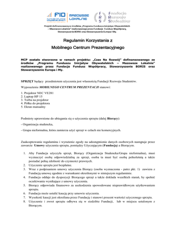 Regulamin Korzystania z Mobilnego Centrum Prezentacyjnego MCP zostało stworzone w ramach projektu: „Czas Na Rozwój” dofinansowanego ze środków „Programu Funduszu Inicjatyw Obywatelskich – Mazowsze Lokalnie” realizowanego przez Fundacje Fundusz Współpracy, Stowarzyszenie BORIS oraz Stowarzyszenie Europa i My. SPRZĘT będący przedmiotem użyczenia jest własnością Fundacji Rozwoju Studentów. Wyposażenie MOBILNEGO CENTRUM PREZENTACJI stanowi: 1. Projektor NEC VE281 2. Laptop HP 15 3. Torba na projektor 4. Półka do projektora 5. Ekran manualny Podmioty uprawnione do ubiegania się o użyczenia sprzętu (dalej Biorący): - Organizacja studencka, - Grupa nieformalna, która zamierza użyć sprzęt w celach nie komercyjnych. Zaakceptowanie regulaminu i wyrażenie zgody na udostępnienie danych osobowych następuje przez zawarcie Umowy użyczenia sprzętu, pomiędzy Użyczającym (Fundacją) a Biorącym. 1. Aby Fundacja użyczyła sprzęt, Biorący (Organizacja Studencka/Grupa nieformalna), musi wyznaczyć osobę odpowiedzialną za sprzęt, osoba ta musi być osobą pełnoletnią a także posiadać pełną zdolność do czynności prawnych. 2. Użyczenie sprzętu jest bezpłatne. 3. Wraz z podpisaniem umowy użyczenia Biorący (osoba wyznaczona - patrz pkt. 1) zawiera z Fundacją umowę zgodnie z warunkami określonymi w niniejszym regulaminie. 4. Fundacja oddaje do dyspozycji Biorącego sprzęt a także dokłada wszelkich starań, by spełnić oczekiwania wynikające z umowy użyczenia. 5. Biorący odpowiada finansowo za uszkodzenia spowodowane nieprawidłowym użytkowaniem sprzętu. 6. Fundacja może ustalić kaucję przy umowie użyczenia. 7. Wysokość kaucji jest określana przez Fundację i stanowi procent wartości użyczonego sprzętu. 8. Użyczenie i zwrot sprzętu odbywa się w siedzibie Fundacji, lub w miejscu ustalonym z Biorącym. 9. Na Biorącym spoczywa odpowiedzialność sprawdzenia stanu sprzętu a także jego kompletności. Wymienione działanie odbywa się w siedzibie Fundacji, przed zawarciem umowy użyczenia. 10. Biorący zawierając umowę użyczenia, potwierdza, że otrzymał sprzęt pozbawiony wad, zgodnie ze specyfikacją i w dobrym stanie technicznym. 11. Biorący zobowiązuje się zwrócić sprzęt w takim samym stanie w jakim go otrzymał a także w terminie ustalonym w umowie użyczenia. Zwrot sprzętu następuje w miejscu ustalonym z Biorącym. 12. Biorący zawierając umowę użyczenia oświadcza, że posiada niezbędną wiedzę na temat eksploatacji i obsługi sprzętu. 13. Zabrania się użyczania sprzętu osobom trzecim. 14. W przypadku zwrotu sprzętu po ustalonym terminie zwrotu Fundacja może naliczyć karę według stawki określonej w umowie użyczenia. 15. Biorący ponosi odpowiedzialność za zaginięcie sprzętu. W przypadku zaginięcia sprzętu lub innych okoliczności uniemożliwiających zwrot sprzętu w ustalonym terminie Biorący ma obowiązek niezwłocznego poinformowania Fundacji. 16. Jeżeli Biorący nie może zwrócić sprzętu w ustalonym terminie powinien przed upływem terminu zwrotu poinformować o tym telefonicznie lub mailowo Fundację. Przedłużenie okresu użyczenia wymaga uzyskania akceptacji Fundacji. W przypadku, kiedy Biorący nie zwróci sprzętu w umówionym terminie lub nie poinformuje o decyzji przedłużenia, lub nie uzyska akceptacji Fundacji, to sprawa zostaje zgłoszona jako przywłaszczenie do właściwych organów ścigania. 17. Biorący nie ponosi odpowiedzialności za normalne zużycie sprzętu zgodnie z jego przeznaczeniem. 18. Biorący ponosi odpowiedzialność za ponad normalne zużycie sprzętu, zniszczenie, lub zdekompletowanie sprzętu. Wysokość szkody ustala Fundacja w oparciu o wartość braków lub cenę naprawy. 19. W przypadku zwrócenia sprzętu uszkodzonego lub niekompletnego Biorący upoważnia Fundację do zatrzymania kaucji w części stosownej do uszkodzenia lub braku. 20. Miejscem wykonania umowy użyczenia sprzętu jest Warszawa. 21. Sądem właściwym dla rozstrzygania sporów jest sąd w Warszawie. 22. Inne nieujęte regulaminem kwestie, regulują stosowne akty prawne. Fundacja Rozwoju Studentów Mobilne Centrum Prezentacji ul. Adama Branickiego 11/32 02-972 Warszawa tel.: (22) 651 86 30 lub +48 665 826 173 | mail: [email protected]