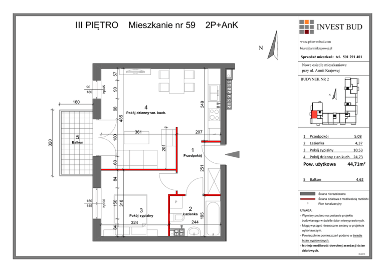 III PIĘTRO Mieszkanie nr 59 2P+AnK INVEST BUD www.pbinvestbud.com N [email protected] Sprzedaż mieszkań: tel. 501 291 401 0 0 90 BUDYNEK NR 2 +1 +1 160 98 4 N +2 +2 349 90 180 hp 45 57 Nowe osiedle mieszkaniowe przy ul. Armii Krajowej +3 +3 207 1 Przedpokój 2 Łazienka 1 3 Pokój sypialny Przedpokój 4 Pokój dzienny z an.kuch. 24,73 84 251 60 201 Balkon 361 L 180 5 Pow. użytkowa 5 5,08 4,37 10,53 44,71m2 Balkon 4,62 Ściana działowa z możliwością rozbiórki P Pion kanalizacyjny 2 Łazienka 244 324 +1 +3 0 +2 UWAGA: 195 3 Pokój sypialny 84 150 145 150 318 Ściana nierozbieralna hp 90 320 485 Pokój dzienny+an. kuch. - Wymiary podano na postawie projektu budowlanego w świetle ścian niewyprawionych. - Mogą wystąpić nieznaczne zmiany w projekcie wykonawczym. - Powierzchnie pomieszczeń podano w świetle ścian wyprawionych. - Istnieje możliwość dowolnej aranżacji ścian działowych. 09,2015