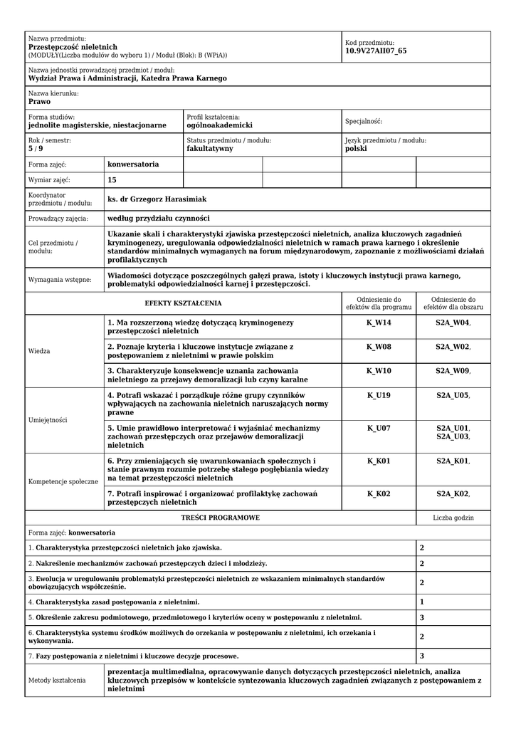 Nazwa przedmiotu: Kod przedmiotu: Przestępczość nieletnich (MODUŁY(Liczba modułów do wyboru 1) / Moduł (Blok): B (WPiA)) 10.9V27AII07_65 Nazwa jednostki prowadzącej przedmiot / moduł: Wydział Prawa i Administracji, Katedra Prawa Karnego Nazwa kierunku: Prawo Forma studiów: Profil kształcenia: jednolite magisterskie, niestacjonarne ogólnoakademicki Rok / semestr: 5/9 Status przedmiotu / modułu: Język przedmiotu / modułu: fakultatywny polski Specjalność: Forma zajęć: konwersatoria Wymiar zajęć: 15 Koordynator przedmiotu / modułu: ks. dr Grzegorz Harasimiak Prowadzący zajęcia: według przydziału czynności Cel przedmiotu / modułu: Ukazanie skali i charakterystyki zjawiska przestępczości nieletnich, analiza kluczowych zagadnień kryminogenezy, uregulowania odpowiedzialności nieletnich w ramach prawa karnego i określenie standardów minimalnych wymaganych na forum międzynarodowym, zapoznanie z możliwościami działań profilaktycznych Wymagania wstępne: Wiadomości dotyczące poszczególnych gałęzi prawa, istoty i kluczowych instytucji prawa karnego, problematyki odpowiedzialności karnej i przestępczości. Odniesienie do efektów dla programu Odniesienie do efektów dla obszaru 1. Ma rozszerzoną wiedzę dotyczącą kryminogenezy przestępczości nieletnich K_W14 S2A_W04, 2. Poznaje kryteria i kluczowe instytucje związane z postępowaniem z nieletnimi w prawie polskim K_W08 S2A_W02, 3. Charakteryzuje konsekwencje uznania zachowania nieletniego za przejawy demoralizacji lub czyny karalne K_W10 S2A_W09, 4. Potrafi wskazać i porządkuje różne grupy czynników wpływających na zachowania nieletnich naruszających normy prawne K_U19 S2A_U05, 5. Umie prawidłowo interpretować i wyjaśniać mechanizmy zachowań przestępczych oraz przejawów demoralizacji nieletnich K_U07 S2A_U01, S2A_U03, 6. Przy zmieniających się uwarunkowaniach społecznych i stanie prawnym rozumie potrzebę stałego pogłębiania wiedzy na temat przestępczości nieletnich K_K01 S2A_K01, 7. Potrafi inspirować i organizować profilaktykę zachowań przestępczych nieletnich K_K02 S2A_K02, EFEKTY KSZTAŁCENIA Wiedza Umiejętności Kompetencje społeczne TREŚCI PROGRAMOWE Liczba godzin Forma zajęć: konwersatoria 1. Charakterystyka przestępczości nieletnich jako zjawiska. 2 2. Nakreślenie mechanizmów zachowań przestępczych dzieci i młodzieży. 2 3. Ewolucja w uregulowaniu problematyki przestępczości nieletnich ze wskazaniem minimalnych standardów obowiązujących współcześnie. 2 4. Charakterystyka zasad postępowania z nieletnimi. 1 5. Określenie zakresu podmiotowego, przedmiotowego i kryteriów oceny w postępowaniu z nieletnimi. 3 6. Charakterystyka systemu środków możliwych do orzekania w postępowaniu z nieletnimi, ich orzekania i wykonywania. 2 7. Fazy postępowania z nieletnimi i kluczowe decyzje procesowe. 3 Metody kształcenia prezentacja multimedialna, opracowywanie danych dotyczących przestępczości nieletnich, analiza kluczowych przepisów w kontekście syntezowania kluczowych zagadnień związanych z postępowaniem z nieletnimi Nr efektu kształcenia z sylabusa Metody weryfikacji efektów kształcenia Forma i warunki zaliczenia * kolokwium 1,2,3,4,5,6, * praca pisemna/esej/recenzja 2,4,6,7, Na ocenę końcową składa się ocena z kolokwium w formie testu oraz ocena z pracy pisemnej z tekstu powierzonego do własnego opracowania. W sumie jest 15 pkt. Minimum na zaliczenie musi być 6 pkt. 40%-66% (6-10 pkt.) dost 67%-87% (11-13 pkt.) db 88%-100% (14-15 pkt) bdb Praca pisemna warunkuje dopuszczenie do testu i jest premiowana max. 2 pkt. dodatkowymi. Literatura podstawowa Korcyl-Wolska M. (2007): Postępowanie w sprawach nieletnich. Wolters Kluwer Harasimiak G. (2000): Ewolucja zasad odpowiedzialności, traktowania i postępowania z nieletnimi. Ottonianum Literatura uzupełniająca Błachut J., Gaberle A., Krajewski K. (2007): Kryminologia. Arche Siemaszko A. (red.) (2008): Atlas przestępczości. Oficyna Naukowa Gaberle A., Korcyl-Wolska M. (2002): Komentarz do ustawy o postępowaniu w sprawach nieletnich. Arche NAKŁAD PRACY STUDENTA: Liczba godzin Zajęcia dydaktyczne 15 Udział w konsultacjach 20 Zdawanie egzaminu lub/i zaliczenia 2 Przygotowanie się do zajęć 8 Studiowanie literatury 35 Przygotowanie się do egzaminu lub/i zaliczenia 20 ŁĄCZNY nakład pracy studenta w godz. 100 Liczba punktów ECTS 4