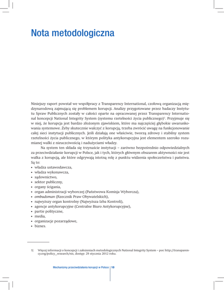 Nota metodologiczna Niniejszy raport powstał we współpracy z Transparency International, czołową organizacją międzynarodową zajmującą się problemem korupcji. Analizy przygotowane przez badaczy Instytutu Spraw Publicznych zostały w całości oparte na opracowanej przez Transparency International koncepcji National Integrity System (systemu rzetelności życia publicznego)1. Przyjmuje się w niej, że korupcja jest bardzo złożonym zjawiskiem, które ma najczęściej głębokie uwarunkowania systemowe. Żeby skutecznie walczyć z korupcją, trzeba zwrócić uwagę na funkcjonowanie całej sieci instytucji publicznych. Jeśli działają one właściwie, tworzą zdrowy i stabilny system rzetelności życia publicznego, w którym polityka antykorupcyjna jest elementem szeroko rozumianej walki z nieuczciwością i nadużyciami władzy. Na system ten składa się trzynaście instytucji – zarówno bezpośrednio odpowiedzialnych za przeciwdziałanie korupcji w Polsce, jak i tych, których głównym obszarem aktywności nie jest walka z korupcją, ale które odgrywają istotną rolę z punktu widzenia społeczeństwa i państwa. Są to: • władza ustawodawcza, • władza wykonawcza, • sądownictwo, • sektor publiczny, • organy ścigania, • organ administracji wyborczej (Państwowa Komisja Wyborcza), • ombudsman (Rzecznik Praw Obywatelskich), • najwyższy organ kontrolny (Najwyższa Izba Kontroli), • agencje antykorupcyjne (Centralne Biuro Antykorupcyjne), • partie polityczne, • media, • organizacje pozarządowe, • biznes. 1|Więcej informacji o koncepcji i założeniach metodologicznych National Integrity System – por. http://transparency.org/policy_research/nis, dostęp: 29 stycznia 2012 roku. Mechanizmy przeciwdziałania korupcji w Polsce 10 Są to tak zwane filary systemu rzetelności życia publicznego. Badacze Instytutu Spraw Publicznych przeprowadzili analizę tych obszarów, działając według wytycznych opracowanych przez Transparency International, wspólnych dla wszystkich dwudziestu pięciu państw uczestniczących w ogólnoeuropejskim projekcie. Każda z trzynastu wymienionych wyżej instytucji została oceniona według ściśle określonych wskaźników. Część z nich – „zasoby”, „niezależność”, „przejrzystość”, „rozliczalność”, „mechanizmy zapewniające rzetelność” – była wspólna dla wszystkich filarów i analizowana (w większości wypadków) w podziale na prawo i praktykę funkcjonowania. Dla każdej instytucji były również przyporządkowane specyficzne wskaźniki związane z jej rolą w systemie (na przykład „nadzór nad władzą wykonawczą” dla władzy ustawodawczej albo „ściganie korupcji” w wypadku sądownictwa). Fundamentami całego systemu są uwarunkowania polityczno-instytucjonalne, społeczno-polityczne, społeczno-ekonomiczne i społeczno-kulturowe, które także, jako jego istotny element, zostały poddane analizie i ocenie. Narzędzie analizy stworzone przez Transparency International zawierało wytyczne do opracowania wszystkich wskaźników, obejmujące między innymi zestaw szczegółowych pytań, na które badacze powinni odpowiedzieć, opisując dane zagadnienie. Na przykład opracowując wskaźnik „władza ustawodawcza – rozliczalność (prawo)”, obok pytania głównego: „Czy istniejące przepisy zobowiązują władzę ustawodawczą do informowania społeczeństwa o swoich działaniach i ponoszenia za nie odpowiedzialności?”, badacz powinien odnieść się do następujących kwestii: „Czy istnieje system kontroli konstytucyjnej nad działaniem władzy ustawodawczej?”, „Czy istnieją przepisy zobowiązujące do podjęcia konsultacji społecznych w określonych sprawach?”, „Czy istnieją mechanizmy umożliwiające złożenie skargi na decyzje (działania) władzy ustawodawczej albo jej poszczególnych przedstawicieli?”. Przy sporządzaniu analiz korzystano z dwóch rodzajów źródeł – z materiałów zastanych i wywiadów. Wśród tych pierwszych były zarówno akty prawne, jak i różne opracowania naukowe, raporty krajowe i międzynarodowe, a także materiały prasowe czy sprawozdania z posiedzeń Sejmu i jego komisji. Dla każdego filaru przeprowadzono średnio po dwa wywiady (łącznie trzydzieści dwa). Rozmówcami byli tak zwani kluczowi informatorzy – osoby dysponujące pogłębioną wiedzą dotyczącą analizowanych obszarów tematycznych. Jeden wywiad przeprowadzano zawsze z tak zwanym insiderem, czyli osobą mającą kilkuletnie doświadczenie pracy (działalności) w danej instytucji, drugi – z ekspertem zewnętrznym dysponującym specjalistyczną wiedzą na temat tej instytucji. W raporcie rozmówcy są anonimowi (kod wywiadu wskazuje jedynie na to, czy rozmówca należał do grupy insiderów – „I”, czy ekspertów – „E”), ich nazwiska zostały jednak podane na początku niniejszego opracowania (o ile nie zastrzegli sobie anonimowości). Każdy wskaźnik, oprócz opisu narracyjnego, zawiera także oceny punktowe w skali od 0 do 100. Należy traktować je wyłącznie pomocniczo, są bowiem wtórne wobec opisu jakościowego. Proces przyznawania punktów odbywał się według sformalizowanych reguł, na podstawie skali opracowanych przez Transparency International. Dla każdego wskaźnika stworzono kryteria opisowe, określające, za jaki stan rzeczy należy przyznać odpowiednią liczbę punktów. Opisy dotyczyły ocen: minimalnej (0), średniej (50) i maksymalnej (100), a oceny pośrednie (25, 75) były przez badaczy przyznawane, jeśli zdiagnozowany stan rzeczy plasował się między opisanymi wartościami. 11 Nota metodologiczna Na przykład dla opisywanego już wskaźnika „władza ustawodawcza – rozliczalność (prawo)” zaproponowane kryteria ocen były następujące: ocena minimalna (0) brakuje przepisów, których celem byłoby zobowiązanie władzy ustawodawczej do informowania społeczeństwa o swoich działan