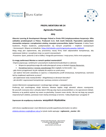 PROFIL MENTORA NR 24 Agnieszka Pawelec PPG Obecnie Learning & Development Manager Poland w firmie PPG (międzynarodowa korporacja. Kilka zakładów produkcyjnych w Polsce. Producent m.in. farb marki Dekoral). Poprzednio zajmowałam stanowiska związane z zarządzaniem wiedzą, rozwojem pracowników, byłam Trenerem. A także Team leaderem, Project leaderem, podejmowałam się różnych projektów i miękkich rozwojowych i biznesowych. Więcej na Linkedinie: https://pl.linkedin.com/in/agnieszka-pawelec-3ab4a22 Moją misją jest zapewnienie, aby pracownicy naszej firmy mieli odpowiednie kompetencje, aby wykonywać dobrze i szczęśliwie misje na swoich stanowiskach. -Prywatnie: Sport, jedzenie (i tak w kółko). Fotografia portretowa. I moja praca, która mnie pasjonuje. Co mogę zaoferować Mentee w ramach spotkań mentorskich? Chętnie popracuję z ambitnymi i pracowitymi studentami/studentkami w zakresie: • Wsparcia specjalistycznego dla osób planujących pracę w działach Human Resources. • Doradztwa kariery i rozwoju zawodowego (bez względu na kierunek) – np.: - gdy chcesz przygotować się jak najlepiej do wejścia na rynek pracy. - jak wybrać kierunek zawodowy w oparciu o indywidualny profil (motywacja, kompetencje, wartości) tak by znajdować spełnienie w pracy? - jak zaplanować swój rozwój (krótko- i długofalowy) w obranym kierunku? - jak określić i wypracować kompetencje i postawy cenione w biznesie? Jestem Mentorem zaangażowanym i oczekuję tego samego – zaangażowania. Preferuję styl coachingowy dzięki któremu Mentee będzie mógł odnaleźć własne rozwiązanie. Be yourself, everyone else is already taken! Oferuję więc bycie przewodnikiem a nie operatorem lektyki. Możemy w tę podróż wybrać się razem na piechotkę. Czasami znam skróty. Ale też nie boję się nowych nieprzetartych szlaków, ponieważ mam niezłą orientację w terenie. I lubię eksploracje i przygody ☺ Zapraszam do współpracy studentów wszystkich Wydziałów. Jeśli chcesz współpracować z tym Mentorem prześlij wypełniony formularz na adres: [email protected] w tytule maila wpisując: <zgłoszenie _mentor 24> Uniwersytet Wrocławski - Biuro Karier ul. Kuźnicza 49A, 50-138 Wrocław tel. 71 375 2134 www.careers.uni.wroc.pl