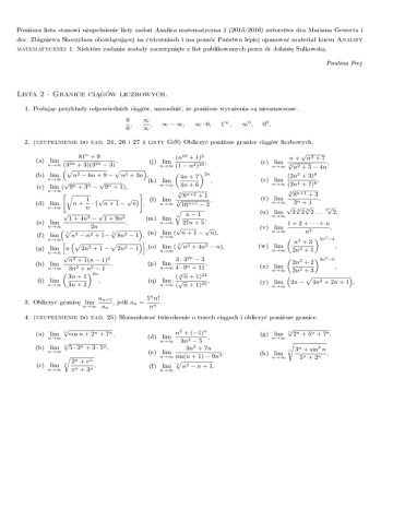 Poni»sza lista stanowi uzupeªnienie listy zada« Analiza matematyczna 1 (2015/2016) autorstwa dra Mariana Gewerta i doc. Zbigniewa Skoczylasa obowi¡zuj¡cej na ¢wiczeniach i ma pomóc Pa«stwu lepiej opanowa¢ materiaª kursu Analizy matematycznej 1. Niektóre zadania zostaªy zaczerpni¦te z list publikowanych przez dr Jolant¦ Sulkowsk¡. Paulina Frej Lista 2 - Granice ci¡gów liczbowych. 1. Podaj¡c przykªady odpowiednich ci¡gów, uzasadni¢, »e poni»sze wyra»enia s¡ nieoznaczone. 0 , 0 ∞ , ∞ ∞ − ∞, ∞ · 0, 1∞ , ∞0 , 00 , 2. (uzupeªnienie do zad. 24, 26 i 27 z listy GiS) Obliczy¢ poni»sze granice ci¡gów liczbowych. (a) (b) (c) (d) (e) (f ) (g) (h) (i) 81n + 9 , (j) n→∞ (32n + 3)(32n − 3) p p lim n2 − 6n + 9 − n2 + 3n , n→∞ (k) √ √ lim ( 9n + 3n − 9n + 1), n→∞ "r # √ 1 √ (l) lim n+ · n+1− n , n→∞ n √ √ 1 + 4n2 − 1 + 9n2 (m) , lim n→∞ 2n p p 3 3 lim n3 − n2 + 1− 8n3 − 1 , (n) n→∞ i h p p 2n2 + 1 − 2n2 − 1 , (o) lim n n→∞ √ n2 + 1(n − 1)2 (p) lim , n→∞ 3n2 + n2 − 1 6n 3n + 1 , lim (q) n→∞ 3n + 2 lim 3. Obliczy¢ granic¦ an+1 , n→∞ an lim je±li an = (n10 + 1)2 , n→∞ (1 − n2 )10 2n 4n + 7 lim , n→∞ 4n + 6 √ 3 8n+2 + 1 lim √ , n→∞ 4 16n+1 − 3 r n−1 lim 3 , n→∞ 27n + 5 √ √ lim ( n + 1 − n), n→∞ p 3 lim ( n3 + 4n2 − n), lim n→∞ 3 · 32n − 3 , n→∞ 4 · 9n + 11 √ ( 3 n + 1)33 , lim √ n→∞ ( n + 1)22 lim (r) (s) (t) (u) (v) (w) (x) (y) √ n + n3 + 7 lim √ , n→∞ 3 n2 + 5 − 4n (2n3 + 3)8 , lim n→∞ (2n4 + 7)6 √ 3 8n+1 + 3 lim , n→∞ 2n + 1 √ √ √ √ 4 8 2n lim 2 2 2 . . . 2, n→∞ 1 + 2 + ··· + n , n2 5n3 −4 3 n +3 lim , n→∞ 2n3 + 1 2 3n2 −5 2n + 2 lim , n→∞ 2n2 + 3 p lim 2n − 4n2 + 2n + 1 , lim n→∞ n→∞ 5n n! . nn 4. (uzupeªnienie do zad. 25) Sformuªowa¢ twierdzenie o trzech ci¡gach i obliczy¢ poni»sze granice. (a) (b) (c) lim n→∞ √ n √ n cos n + 2n + 7n , 5 · 3n + 3 · 5n , r 2n + en lim n n , n→∞ π + 3n lim n→∞ (d) (e) (f ) n2 + (−1)n , lim n→∞ 3n2 − 5 3 3n + 7n lim , n→∞ sin(n + 1) − 9n3 p n lim n2 − n + 1 , n→∞ (g) (h) √ n 2n + 5n + 7n , s n + sin2 n n 3 lim , n→∞ 5n + 2n lim n→∞