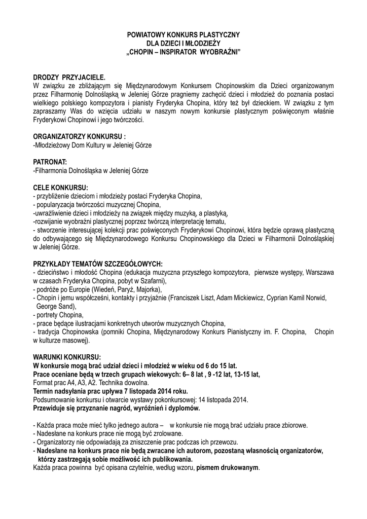 POWIATOWY KONKURS PLASTYCZNY DLA DZIECI I MŁODZIEŻY „CHOPIN – INSPIRATOR WYOBRAŹNI” DRODZY PRZYJACIELE. W związku ze zbliżającym się Międzynarodowym Konkursem Chopinowskim dla Dzieci organizowanym przez Filharmonię Dolnośląską w Jeleniej Górze pragniemy zachęcić dzieci i młodzież do poznania postaci wielkiego polskiego kompozytora i pianisty Fryderyka Chopina, który też był dzieckiem. W związku z tym zapraszamy Was do wzięcia udziału w naszym nowym konkursie plastycznym poświęconym właśnie Fryderykowi Chopinowi i jego twórczości. ORGANIZATORZY KONKURSU : -Młodzieżowy Dom Kultury w Jeleniej Górze PATRONAT: -Filharmonia Dolnośląska w Jeleniej Górze CELE KONKURSU: - przybliżenie dzieciom i młodzieży postaci Fryderyka Chopina, - popularyzacja twórczości muzycznej Chopina, -uwrażliwienie dzieci i młodzieży na związek między muzyką, a plastyką, -rozwijanie wyobraźni plastycznej poprzez twórczą interpretację tematu, - stworzenie interesującej kolekcji prac poświęconych Fryderykowi Chopinowi, która będzie oprawą plastyczną do odbywającego się Międzynarodowego Konkursu Chopinowskiego dla Dzieci w Filharmonii Dolnośląskiej w Jeleniej Górze. PRZYKŁADY TEMATÓW SZCZEGÓŁOWYCH: - dzieciństwo i młodość Chopina (edukacja muzyczna przyszłego kompozytora, pierwsze występy, Warszawa w czasach Fryderyka Chopina, pobyt w Szafarni), - podróże po Europie (Wiedeń, Paryż, Majorka), - Chopin i jemu współcześni, kontakty i przyjaźnie (Franciszek Liszt, Adam Mickiewicz, Cyprian Kamil Norwid, George Sand), - portrety Chopina, - prace będące ilustracjami konkretnych utworów muzycznych Chopina, - tradycja Chopinowska (pomniki Chopina, Międzynarodowy Konkurs Pianistyczny im. F. Chopina, Chopin w kulturze masowej). WARUNKI KONKURSU: W konkursie mogą brać udział dzieci i młodzież w wieku od 6 do 15 lat. Prace oceniane będą w trzech grupach wiekowych: 6– 8 lat , 9 -12 lat, 13-15 lat, Format prac A4, A3, A2. Technika dowolna. Termin nadsyłania prac upływa 7 listopada 2014 roku. Podsumowanie konkursu i otwarcie wystawy pokonkursowej: 14 listopada 2014. Przewiduje się przyznanie nagród, wyróżnień i dyplomów. - Każda praca może mieć tylko jednego autora – w konkursie nie mogą brać udziału prace zbiorowe. - Nadesłane na konkurs prace nie mogą być zrolowane. - Organizatorzy nie odpowiadają za zniszczenie prac podczas ich przewozu. - Nadesłane na konkurs prace nie będą zwracane ich autorom, pozostaną własnością organizatorów, którzy zastrzegają sobie możliwość ich publikowania. Każda praca powinna być opisana czytelnie, według wzoru, pismem drukowanym. NAZWISKO......................................................................................................................................... . IMIĘ...................................................................................................................................................... WIEK............. TYTUŁ PRACY ............................................................................................... .................................... ADRES : SZKOŁY / INSTYTUCJI ....................................................................................................... ULICA .................................................................................................................................................. MIASTO (KOD) ................................................................................................................................... IMIĘ I NAZWISKO NAUCZYCIELA .................................................................................................... E-MAIL: SZKOŁY/ INSTYTUCJI ........................................................................................................ PRACE PROSIMY PRZESYŁAĆ NA ADRES : Młodzieżowy Dom Kultury ul. M. Skłodowskiej-Curie 12 58-500 Jelenia Góra tel. 75-64 24 460 , e-mail:[email protected] www.mdkjelonek.pl z dopiskiem “Chopin”