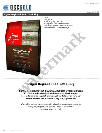 Informacje o produkcie Utworzono 07-03-2017 Orijen Regional Red Cat 6,8kg Cena : 269,99 zł at er m ar k Nr katalogowy : 12138 Dostępność : Na zamówienie Stan magazynowy : bardzo wysoki Średnia ocena : brak recenzji w Orijen Regional Red Cat 6,8kg Karma dla kotów ORIJEN REGIONAL RED jest wyprodukowana w 100% z najwyższej jakości wołowiny Black Angus, mięsa dzika oraz jagniąt chowanych na lokalnych farmach stanu Alberta w Kanadzie. Twój kot ją pokocha! Wszystkie koty są mięsożercami, naturalnie przystosowanymi do diety bogatej w różne gatunki mięs, z dodatkiem owoców, warzyw i ziół. Wygenerowano w programie www.oscGold.com er m ar k at Biologicznie odpowiednia karma ORIJEN REGIONAL RED pełna jest różnorodnych gatunków czerwonego mięsa - zawiera wołowinę Black Angus, mięso dzika, jagnięcinę, wieprzowinę oraz mięso bizona. Zwierzęta chowane są na wolnym wybiegu, a mięso dostarczane ŚWIEŻE, pełne wartości odżywczych. w Karma ORIJEN jest przygotowana z najlepszych i najświeższych kanadyjskich składników w jedynej na świecie, nagradzanej kuchni Champion Petfoods. Dzięki tej karmie Twój kot będzie zdrowy, szczęśliwy i silny. Przeczytaj skład naszej karmy, a z pewnością się z nami zgodzisz! SKŁADNIKI Świeże mięso dzika 6%, świeże mięso jagnięce 6%, świeże mięso wołowe 6%, świeża wątroba wołowa 6%, świeże mięso wieprzowe 6%, świeże mięso śledzia 6%, świeża wątroba wieprzowa 5%, dehydratyzowane mięso wołowe 5%, Informacje o produkcie er m ar k dehydratyzowane mięso jagnięce 5%, dehydratyzowane mięso śledzia 5%, dehydratyzowane mięso łososia 4%, dehydratyzowane mięso rdzawca 4%, tłuszcz jagnięcy 4%, zielona soczewica, ciecierzyca, czerwona soczewica, świeże mięso bizona 3%, świeże całe jaja 3%, żółty groszek, świeże żołądki wołowe 2%, olej ze śledzia 2%, świeża wątroba jagnięca 1%, świeże nerki wołowe 1%, lucerna, kelp, dynia, dynia piżmowa, szpinak, marchew, jabłka, gruszki, żurawina, korzeń cykorii, korzeń mniszka, rumianek, liście mięty pieprzowej, korzeń imbiru, kminek, kurkuma, owoce dzikiej róży, liofilizowana wątroba jagnięca, liofilizowana wątroba wołowa, liofilizowana wątroba dzika, liofilizowane żołądki + witaminy i minerały * DOSTARCZANE ŚWIEŻE - NIGDY NIE MROŻONE I WOLNE OD SZTUCZNYCH KONSERWANTÓW at GWARANTOWANA ANALIZA Białko 40.0% Tłuszcz 20.0% Włókno 3.0% Wapń 1.7% Fosfor 1.3% Oméga 6 2.4% Oméga-3 1.2% DHA 0.3% EPA 0.25% Tauryna 0.2% Popiół 9% Magnez 0.1% w SKŁADNIKI ROŚLINNE Korzeń cykorii Korzeń imbiru Kminek Kurkuma Owoce dzikiej róży Liście mięty pieprzowej Kwiat rumianku Korzeń mniszka Cząber WITAMINY Witamina A Witamina D3 Witamina E Witamina B1 Witamina B2 Witamina B3 Witamina B5 Witamina B6 Witamina B12 Kwas foliowy Cholina 52 kUI/kg 2850 kUI/kg 400 UI/kg 75 mg/kg 55 mg/kg 145 75 mg/kg 48 mg/kg 37 mg/kg 0.5 mg/kg 5,8 mg/kg 3740 mg/kg AMINOKWASY Tauryna 0.2% Wygenerowano w programie www.oscGold.com 2.8% 0.4% 1.6% 2,7% 1.2% 1.5% 2.8% 2.0% 2.6% 1.6% 0.9% 0.40% MINERAŁY Sód Chlorek Potas Magnez Mangan Selen Żelazo Cynk Miedź Jod 0.55% 0.8% 0.88% 0.10% 25 mg/kg 1.3 mg/kg 205 mg/kg 255 mg/kg 35 mg/kg 5.8 mg/kg er m ar k Lizyna Trytophane Treonina Tyrozyna Metionina Izoleucyna Leucyna Walina Arginina Fenyloalanina Histydyna Cystyna ROZKŁAD KALORII Energia metaboliczna 4060 kcal/kg (500 kcal na kubek 500ml). 40% energii pochodzi z białka, 42% z tłuszczów, 18% z węglowodanów. DAWKOWANIE 40 45 60 75 80 105 120 at 2 kg 3 kg 4 kg 5 kg 6 kg 8 kg 10 kg KOT DOROSŁY KOT SENIOR (g na dzień) (g na dzień) 30 30 60 60 60 90 105 w WAGA KOCIĘTA: od 5 tygodnia życia pół kubka na 1kg masy ciała. Od 20 tygodnia 1 i 1/4 kubka na 1kg masy ciała. Od 52 tygodnia dawkowanie jak dla dorosłego kota. CIĄŻA: zwiększyć dawkę o 25% KARMIENIE: bez ograniczeń.