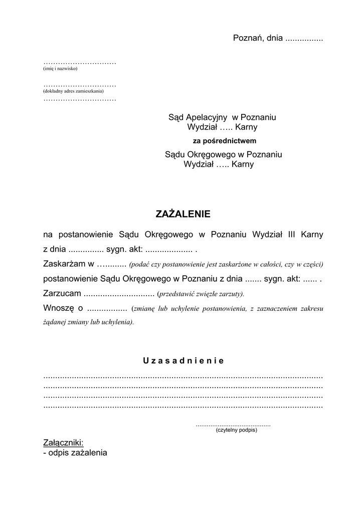 Poznań, dnia ................ ………………………… (imię i nazwisko) ………………………… (dokładny adres zamieszkania) ………………………… Sąd Apelacyjny w Poznaniu Wydział ….. Karny za pośrednictwem Sądu Okręgowego w Poznaniu Wydział ….. Karny ZAŻALENIE na postanowienie Sądu Okręgowego w Poznaniu Wydział III Karny z dnia ............... sygn. akt: .................... . Zaskarżam w …......... (podać czy postanowienie jest zaskarżone w całości, czy w części) postanowienie Sądu Okręgowego w Poznaniu z dnia ....... sygn. akt: ...... . Zarzucam .............................. (przedstawić zwięzłe zarzuty). Wnoszę o ................. (zmianę lub uchylenie postanowienia, z zaznaczeniem zakresu żądanej zmiany lub uchylenia). Uzasadnienie ...................................................................................................................... ...................................................................................................................... ...................................................................................................................... ...................................................................................................................... ......................................... (czytelny podpis) Załączniki: - odpis zażalenia