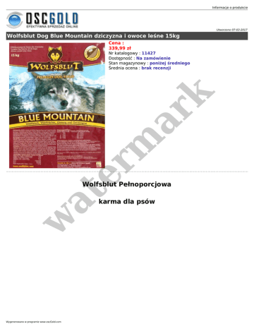 Informacje o produkcie Utworzono 07-03-2017 Wolfsblut Dog Blue Mountain dziczyzna i owoce leśne 15kg Cena : 339,99 zł er m ar k Nr katalogowy : 11427 Dostępność : Na zamówienie Stan magazynowy : poniżej średniego Średnia ocena : brak recenzji at Wolfsblut Pełnoporcjowa w karma dla psów Wygenerowano w programie www.oscGold.com er m ar k Składniki w at Suszona dziczyzna, ziemniaki, suszone mięso królicze, skrobia ziemniaczana, tłuszcz jagnięcy, siemię lniane, wątroba jagnięca, tymianek, majeranek, pietruszka, szałwia, oregano, miód, ekstrakt z pestek winogron, zielony groszek, jabłka, marchew, przecier pomidorowy, rośliny morskie, żurawina, kozieradka pospolita, anyż nasiona, mniszek lekarski, spirulina, marigolds, banany, pokrzywa, głóg, żeń-szeń, jeżyny, maliny, jagody, porzeczki, jagody bzu czarnego, owoce aronii, jęczmień, sól morska, tauryna, lizyna, minerały i witaminy (w tym. DL metionina, probiotyki fruktooligosacharydy i mannanoligosacharydy), juka Schidigera- ekstrakt, L-karnityna, beta-karoten Analiza składu Białko 30 % Tłuszcz 16 % Błonnik 2,5 % Popiół 10 % Wilgotność 8% Energia 3.600 kcal/kg Omega 6 3,1% Omega 3 1% Witamina A 12042 IU Witamina D 810 IU Informacje o produkcie Witamina E 110 IU Witamina B1 5,64 mg/kg Witamina B2 13 mg/kg Witamina B5 12 mg/kg Witamina B3 19 mg/kg Witamina B6 3,22 mg/kg Witamina B9 0,95 mg/kg Biotyna 177 µg/kg Cholina 2460 mg/kg Tauryna 1100 mg/kg Wapń 2,4 % Fosfor 1,4 % Potas 0,82 % Sód 0,4 % Magnez 0,14 % Żelazo 74 mg/kg Miedź 11 mg/kg Mangan 28 mg/kg Cynk 120 mg/kg Jod 0,3 mg/kg Selen 0,18 mg/kg Dawkowanie: Dawka dzienna 1 - 5 kg 30 - 100 g 5 -15 kg 100 - 225 g 15 - 25 kg 225 - 330 g 25 - 35 kg 330 - 425 g 35 - 50 kg 425 - 525 g 50 - 70 kg 525 - 650 g w at Waga psa er m ar k Witamina B 12 74,45 µg/kg Wygenerowano w programie www.oscGold.com
