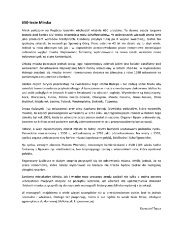 650-lecie Mirska Mirsk położony na Pogórzu Izerskim obchodził właśnie 650 urodziny. Ta dawna osada targowa została pod koniec XIV wieku własnością rodu Schaffgotschów. W późniejszych wiekach znana była jako producent wyrobów tekstylnych. Osadnicy przybyli tutaj po II wojnie światowej, zastali tak spokojny zakątek, że nazwali go Spokojną Górą. Przez ostatnie 40 lat nie działo się tu zbyt wiele. Jednak w roku obecnym tak jak i w poprzednim przeprowadzono prace remontowe zmieniające całkowicie wygląd miasta. Naprawiono fontanny, wybrukowano na nowo rynek, nałożono nowe kolorowe tynki na stare kamieniczki. Chlubą miasta pozostaje jednak wciąż jego najcenniejszy zabytek jakim jest kościół parafialny pod wezwaniem Zwiastowania Najświętszej Marii Panny wzniesiony w latach 1562-67, w wyposażeniu którego znajduje się między innymi renesansowa skrzynia na jałmużnę z roku 1580 ustawiona na kamiennym postumencie z herbem. Bardzo często turyści poprzestają na zwiedzeniu tego Domu Bożego i nie zadają sobie trudu aby zwiedzić teren cmentarza przykościelnego. A tymczasem w murze cmentarnym ulokowano tablice ku czci osób poległych w bitwach II wojny światowej i w obozach zagłady. Wymienione są tutaj nazwy: Kock, Warszawa, Kutno, Polska Poczta-Gdańsk, Oświęcim, Monte Cassino, Gross-Rossen, Obóz Stutthof, Majdanek, Lenino, Tobruk, Westerplatte, Siekierki, Toporów. Druga świątynia (już zniszczona) przy ulicy Kapitana Betleja (dowódca oddziałów, które wyzwoliły miasto), to kościół poewangelicki wzniesiony w 1757 roku. najtragiczniejszym rokiem w historii tego obiektu był rok 1958, kiedy to uderzony przez piorun został zniszczony. Organy i figury uratowały się, bowiem na krótko przed pożarem zostały zdemontowane w celu przeprowadzenia konserwacji. Ratusz, a więc najważniejszy obiekt miasta to ładny, czysty budynek usytuowany pośrodku rynku. Pierwotnie renesansowy z 1558 r., odbudowany w 1769 jako późnobarokowy. Na wieży z 1559, oprócz zegara umieszczono trzy herby: miasta (upolowany gołąb), Seidlitzów i Schaffgotschów. Na rynku, zwanym obecnie Placem Wolności, otoczonym kamieniczkami z XVIII i XIX wieku ładne fontanny z figurami np. niedźwiedzia, lwa trzymającego tarczę z wizerunkiem orła, który upolował gołębia. Tegoroczny jubileusz w dużym stopniu przyczynił się do odnowienia miasta. Myślę jednak, że na prace remontowe, które należy wykonywać na bieżąco nie trzeba będzie czekać do następnej okrągłej rocznicy. Zarówno mieszkańcy Mirska, jak i władze tego uroczego grodu zadbali nie tylko o godną oprawę uroczystości mających miejsce na początku września, ale również dla upamiętnienia dokonań i historii miasta przyczynili się do napisania monografii historycznej Mirska wydanej z tej okazji. W monografii znajdziemy o wiele więcej szczegółów niż w przedstawionym opisie. Jest to jednak normalne i właściwe, Dlatego też proponuję, mimo iż nie będzie to wcale takie łatwe, zdobycie egzemplarza do domowej biblioteczki krajoznawczej. Krzysztof Tęcza
