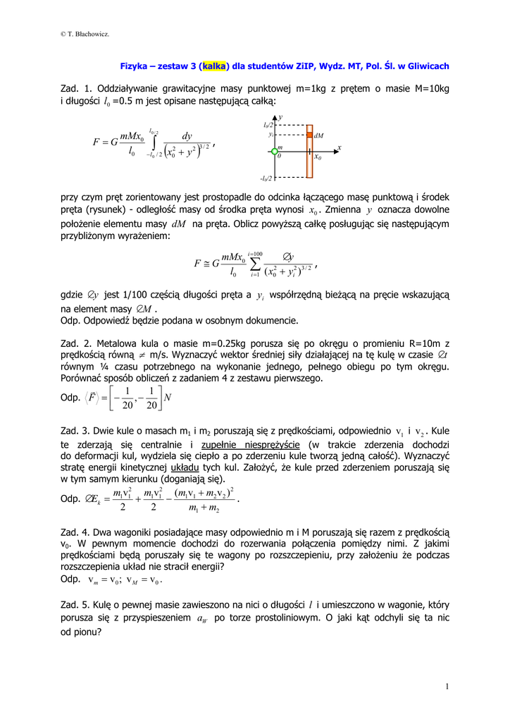 © T. Błachowicz. Fizyka – zestaw 3 (kalka) dla studentów ZiIP, Wydz. MT, Pol. Śl. w Gliwicach Zad. 1. Oddziaływanie grawitacyjne masy punktowej m=1kg z prętem o masie M=10kg i długości l0 =0.5 m jest opisane następującą całką: y l0/2 yi l mMx0 0 / 2 dy F =G ∫ 2 l0 − l 0 / 2 x0 + y 2 ( ) 3/ 2 , dM m 0 x x0 -l0/2 przy czym pręt zorientowany jest prostopadle do odcinka łączącego masę punktową i środek pręta (rysunek) - odległość masy od środka pręta wynosi x0 . Zmienna y oznacza dowolne połoŜenie elementu masy dM na pręta. Oblicz powyŜszą całkę posługując się następującym przybliŜonym wyraŜeniem: F ≅G ∆y mMx0 i =100 , ∑ 2 l0 i =1 ( x0 + yi2 )3 / 2 gdzie ∆y jest 1/100 częścią długości pręta a yi współrzędną bieŜącą na pręcie wskazującą na element masy ∆M . Odp. Odpowiedź będzie podana w osobnym dokumencie. Zad. 2. Metalowa kula o masie m=0.25kg porusza się po okręgu o promieniu R=10m z prędkością równą π m/s. Wyznaczyć wektor średniej siły działającej na tę kulę w czasie ∆t równym ¼ czasu potrzebnego na wykonanie jednego, pełnego obiegu po tym okręgu. Porównać sposób obliczeń z zadaniem 4 z zestawu pierwszego. r 1 1 Odp. F = − ,− N 20 20 Zad. 3. Dwie kule o masach m1 i m2 poruszają się z prędkościami, odpowiednio v1 i v 2 . Kule te zderzają się centralnie i zupełnie niespręŜyście (w trakcie zderzenia dochodzi do deformacji kul, wydziela się ciepło a po zderzeniu kule tworzą jedną całość). Wyznaczyć stratę energii kinetycznej układu tych kul. ZałoŜyć, Ŝe kule przed zderzeniem poruszają się w tym samym kierunku (doganiają się). Odp. ∆Ek = m1v12 m1v12 (m1v1 + m2 v 2 ) 2 + − . 2 2 m1 + m2 Zad. 4. Dwa wagoniki posiadające masy odpowiednio m i M poruszają się razem z prędkością v0. W pewnym momencie dochodzi do rozerwania połączenia pomiędzy nimi. Z jakimi prędkościami będą poruszały się te wagony po rozszczepieniu, przy załoŜeniu Ŝe podczas rozszczepienia układ nie stracił energii? Odp. v m = v 0 ; v M = v 0 . Zad. 5. Kulę o pewnej masie zawieszono na nici o długości l i umieszczono w wagonie, który porusza się z przyspieszeniem aW po torze prostoliniowym. O jaki kąt odchyli się ta nic od pionu? 1 © T. Błachowicz. Odp. tgα = m aW aW = (masa m nie jest potrzebna do podania poprawnej odpowiedzi). mg g Zad. 6. Dwa klocki, posiadające masy m i M, zsuwają się razem z równi pochyłej o kącie nachylenia α (rysunek). Obliczyć przyśpieszenie układu klocków i siłę wzajemnego nacisku klocków. Współczynniki tarcia dla klocków są róŜne i wynoszą odpowiednio: f m i f M . m M α Uwaga: do poprawnego rozwiązania zadania potrzebne jest zastosowanie III zasady dynamiki. Odp. sin α (m + M ) − cos α ( f m m + f M M ) ; m+M sin α (m + M ) − cos α ( f m m + f M M ) N = mg (sin α − f m cos α ) − mg . m+M a=g Zad. 7. Kula o masie m i promieniu R wtacza się bez poślizgu na równię pochyłą o kącie nachylenia α . Zapisać równania ruchu; postępowego i obrotowego, oraz wyznaczyć przyśpieszenie kątowe i liniowe walca. Odp. T − Q sin α = ma; − TR = 2 a 5 g sin α 5 mR 2 ; ε = − ; a = − g sin α . 5 R 7R 7 Zad. 8. Pierścień i walec o tych samych masach M i promieniach R staczają się bez poślizgu z równi pochyłej o kącie nachylenia α , z tej samej wysokości. Która z tych brył znajdzie się wcześniej u podstawy równi? Odp. Walec ( aw = 4 3 g sin α ; a p = g sin α ). 6 6 Uwaga: z równań ruchu naleŜy wyznaczyć przyspieszenia obu brył, a następnie z odpowiednich równań z kinematyki naleŜy wyznaczyć i porównać czasy staczania się. Zad. 9. Na pierścień o masie M i promieniu R nawinięto nić, którą zaczepiono u sufitu. Zapisać równanie ruchu postępowego i obrotowego pierścienia. Obliczyć, z jakim przyśpieszeniem będzie poruszał się poruszał środek masy pierścienia. Ruch odbywa się bez poślizgu. Odp. Q − N = ma; NR = mR 2 a 1 ; a = g. R 2 2