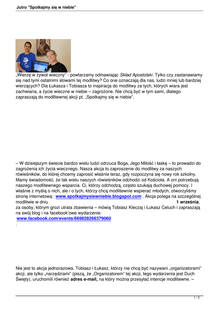 Jutro "Spotkajmy się w niebie" „Wierzę w żywot wieczny” - powtarzamy odmawiając Skład Apostolski. Tylko czy zastanawiamy się nad tymi ostatnimi słowami tej modlitwy? Co one oznaczają dla nas, ludzi mniej lub bardziej wierzących? Dla Łukasza i Tobiasza to inspiracja do modlitwy za tych, których wiara jest zachwiana, a życie wieczne w niebie – zagrożone. Nie chcą być w tym sami, dlatego zapraszają do modlitewnej akcji pt. „Spotkajmy się w niebie”. – W dzisiejszym świecie bardzo wielu ludzi odrzuca Boga, Jego Miłość i łaskę – to prowadzi do zagrożenia ich życia wiecznego. Nasza akcja to zaproszenie do modlitwy za naszych rówieśników, do której chcemy zaprosić właśnie teraz, gdy rozpoczyna się nowy rok szkolny. Mamy świadomość, że tak wielu naszych rówieśników odchodzi od Kościoła. A oni potrzebują naszego modlitewnego wsparcia. Ci, którzy odchodzą, często szukają duchowej pomocy. I właśnie z myślą o nich, ale i o tych, którzy chcą modlitewnie wspierać młodych, otworzyliśmy stronę internetową: www.spotkajmysiewniebie.blogspot.com . Akcja polega na szczególnej modlitwie w dniu 1 września, za osoby, którym grozi utrata zbawienia – mówią Tobiasz Kleczaj i Łukasz Celuch i zapraszają na swój blog i na facebook’owe wydarzenie: www.facebook.com/events/669828266379060 . Nie jest to akcja jednorazowa. Tobiasz i Łukasz, którzy nie chcą być nazywani „organizatorami” akcji, ale tylko „narzędziami” (piszą, że „Organizatorem” tej akcji, tego wydarzenia jest Duch Święty), uruchomili również adres e-mail, na który można przesyłać intencje modlitewne. – 1/3 Jutro "Spotkajmy się w niebie" Akcja, nie zakończy się z dniem 1 września, bo już 1 października planujemy następną edycję akcji „Spotkajmy się w niebie”. Tym razem będzie ona swoją modlitwą obejmowała narkomanów. – mówi Tobiasz. W przedstawianiu Bogu tych intencji nie będą sami. Wsparcie w modlitwie deklarują także zgromadzenia zakonne (m.in. Siostry Klaryski ze Skaryszewa i z Krakowa oraz Bernardynki z Checin, Niepokalanki z Szymanowa i Kapucynki) i Diakonia Modlitwy Ruchu Światło-Życie Diecezji Radomskiej. Do tej modlitwy dołączyć może każdy: – Bardzo wszystkich zachęcamy do tej naszej wspólnej modlitwy i prosimy: módlcie się o łaskę, udostępniajcie to wydarzenie, zapraszajcie na nie swoich znajomych, by działo się dobro – apelują Łukasza i Tobiasz. Również i nasza redakcja zaprasza do włączenia się do akcji, w której udział już zadeklarowało ponad 1.800 osób. Przypominamy ważne linki akcji: 1. Wydarzenie na Facebook’u, poprzez które „Zwołujemy się” na modlitwę: https://www.facebo ok.com/events/669828266379060/?fref=ts 2. Strona naszej akcji z informacjami, podziękowaniami, rozważaniami: http://spotkajmysiewni ebie.blogspot.com/ 2/3 Jutro "Spotkajmy się w niebie" 3. Adres e-mail na który można przesłać intencje modlitewne: [email protected] 3/3