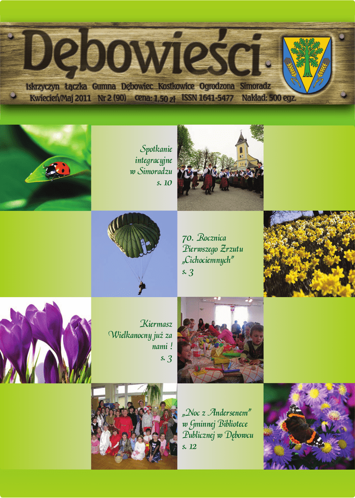 Spotkanie integracyjne w Simoradzu s. 10 70. Rocznica Pierwszego Zrzutu „Cichociemnych” s. 3 Kiermasz Wielkanocny już za nami ! s. 3 „Noc z Andersenem” w Gminnej Bibliotece Publicznej w Dębowcu s. 12 Dębowieści 70. rocznica pierwszego zrzutu „cichociemnych” Kiermasz wieLKanocny Strona 2 Informacje 70. rocznIca pIerwszego zrzutu „CiChoCiemnyCh” Nowy rozdział w historii wojskowości zapoczątkowało trzech polskich spadochroniarzy w osobach dwóch cichociemnych mjr Stanisława Krzymowskiego „Kostki”, rtm. Józefa Zabielskiego „Żbika” oraz kuriera bomb. Czesława Raczkowskiego „Orkana”. Przeprowadzili oni operację o kryptonimie „Adolphus”, której termin wyznaczono na noc z 15 na 16 lutego 1941 r. Skoczkowie wykonali ustne polecenie gen. Sosnowskiego, który pożegnał ich słowami „Idziecie jako straż przednia do kraju. Macie udowodnić, że łączność z krajem jest w naszych warunkach możliwa”. Ich cel stanowiła placówka odbiorcza położona 7,5 km na południe od Włoszczowej. Jednakże ze względu na błąd nawigatora, zbyt małą ilość paliwa albo, jak sądzą niektórzy, celowe d z i ałanie A ng likó w z rz u t u dokonano w Dębowcu. Od momentu pamiętnego pierwszego zrzutu cichociemnych w Dębowcu minęło prawie 70 lat, ale pamięć o tym wydarzeniu wciąż jest żywa wśród pasjonatów historii. Również środowiska kombatanckie wraz z władzami Gminy Dębowiec co roku organizują obchody upamiętniające to wydarzenie, a w bieżącym z okazji okrągłej rocznicy nadano tym uroczystościom szczególną rangę z odpowiednią dla miejsca, w którym „zaczęło się podpalanie Europy” oprawą. W dniu 12 lutego przy dźwiękach Hymnu Wojska Polskiego uroczyście wprowadzono Poczty sztandarowe przed głaz upamiętniający „Cichociemnych” w centrum D ę b o w c a . Ta k o t o ro z p o częły się oficjalne obchody 70. rocznicy pierwszego zrzutu „Cichociemnych” na okupowany kontynent. Gospodarz uroczystości, Wójt Gminy Dębowiec Tomasz Branny przywitał licznie przybyłych gości i mieszkańców. Przybliżył zebranym jak ważne znaczenie dla kształtu dzisiejszej wolnej ojczyzny miał ten pierwszy skok na dębowiecką Kiermasz wieLKanoCny JuŻ za nami ! ziemię. Również o gościnnej ziemi cieszyńskiej i bohaterskiej postawie jej mieszkańców wspomniał współorganizator uroczystości Starosta Cieszyński Czesław Gluza. Niezwykle ciekawie losy spadochroniarzy przybliżył płk Jerzy Gut dowódca jednostki wojskowej GROM, której patronami są legendarni Cichociemni Spadochroniarze Armii Krajowej. To właśnie GROM jest kontynuatorem tradycji Cichociemnych. Jak co roku przemawiał również Prezes Światowego Związku Żołnierzy Armii Krajowej Oddział Ziemi Cieszyńskiej Rudolf Golda. Wspomniał on zasługi władz samorządowych Gminy Dębowiec w utrwalaniu pamięci o ludziach i czynach w walce o niepodległość Polski podczas II wojny światowej i po jej zakończeniu, za co w roku 2010 został jej przyznany medal PRO MEMORIA. Po oficjalnych uroczystościach przyszedł czas na wyczekiwaną inscenizację zrzutu i podjęcia Cichociemnych w Dębowcu. Zrzutu zasobników ze sprzętem oraz skoku dokonali skoczkowie grupy rekonstrukcyjnej „Spadochroniarze 1939-45”. Duże wrażenie zrobiła również inscenizacja podjęcia skoczków przez partyzantów oraz partole niemieckie przeszukujące cywilną ludność Dębowca. Równolegle uczestnicy u ro c z y s t o ś c i n a s a l i g i m nastycznej w Dębowcu mogli podziwiać wystawę militarną i oglądać ciekawe prezentacje multimedialne oraz pokazy składania spadochronów. Dzięki wysiłkowi wielu ludzi udało się nadać odpowiednią rangę tak ważnemu wydarzeniu w dziejach Europy. Pozostaje nadzieja, że pamięć o pierwszych Cichociemnych zrzuconych na ziemie okupowanej Europy nie zostanie zatarta w świadomości mieszkańców naszej gminy i całej Polski. Wzorem lat ubiegłych Gminny Ośrodek Kultury wraz z Kołem G o s p o d y ń Wiejskich z Łączki zorganizowali już V Kiermasz Wielkanocnych Tradycji w Łączce. Cały tydzień Panie pieczołowicie piekły ciasta, d e k o r o w a ł y, a b y zadowolić podniebienia nawet najwybredniejszych klientów. Sto lukrowan y c h b a r a n k ó w, 40 smacznych m u r z y n ó w, 2 0 o l b r z y mich kołaczy, 60 barwnych mazurków, ponad 60 bab wielkanocnych i wiele innych smakołyków czekało, aby zawitać na wielkanocnych stołach. Oczywiście nie mogło zabraknąć oryginalnych, pięknie zdobionych pisanek i innych ozdób świątecznych, były i pisanki ze strusich jaj dekorowane w niepowtarzalne wzory, tak więc każdy mógł znaleźć coś dla siebie. Na kiermaszu w miłej, świątecznej atmosferze można było spokojnie usiąść, napić się kawy czy herbaty, spróbować pięknie pachnącego, świeżego, domowego chleba z masełkiem czy domowej buchty i choć na moment oderwać się od problemów dnia codziennego. Wspólne malowanie wielkanocnych pisanek wciągnęło nie tylko dzieci, ale również ro d z i c ó w. N a n a j z d o l n i e j szych „malowniczych” czekały nagrody, które przygotował Ośrodek Kultury, tak więc warto było się starć. Pierwsze miejsce w konkursie „Na Najpiękniejszą Pisankę” - zdobyła Paulina Chwastek z Łączki. GOKSiT pragnie serdecznie podziękować Kołu Gospodyń Wiejskich z Łączki za ciężką pracę, a w szczególności Pani Irenie Bączek, dzieciom z kółka plastycznego wraz z Panią Moniką Drozd. Dziękujemy także wszystkim tym, którzy zawitali na naszym Kiermaszu, mamy nadzieję, że spotkamy się znów za rok!!! Bogusz Karina Remigiusz Jankowski Błażej Żebrok Strona 3 Dębowieści Informacje z obrad rady gminy Na Sesjach Rady Gminy Dębowiec, które odbyły się 22 lutego 2011 oraz 29 marca 2011r. podjęto uchwały m.in. w następujących sprawach: 1. Zmiany budżetu gminy Dębowiec na 2011r. 2. Rozwiązania umowy użytkowania wieczystego. 3. Powołani