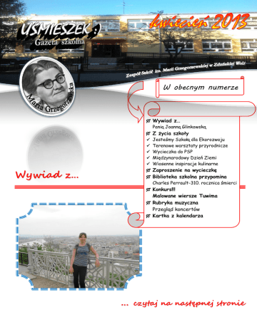 Re W obecnym numerze Wywiad z… Panią Joanną Glinkowską Z życia szkoły Jesteśmy Szkołą dla Ekorozwoju Terenowe warsztaty przyrodnicze Wycieczka do PSP Międzynarodowy Dzień Ziemi Wiosenne inspiracje kulinarne Zaproszenie na wycieczkę Biblioteka szkolna przypomina Wywiad z… Charles Perrault-310. rocznica śmierci Konkurs!!! Malowane wiersze Tuwima Rubryka muzyczna Przegląd koncertów Kartka z kalendarza … czytaj na następnej stronie Imię i nazwisko: Joanna Glinkowska Zajmowane stanowisko: Edukacja wczesnoszkolna, rewalidacja Znak zodiaku: Panna Ulubiony kolor: Niebieski i zielony Dlaczego została Pani nauczycielem? Zostałam nauczycielem, ponieważ jest to zawód działania – kreatywny i twórczy, dający ogromną satysfakcję i zadowolenie Gdzie Pani najchętniej spędza urlop? Częściej urlop spędzam nad polskim morzem Jakie są Pani zainteresowania? Kino - zwłaszcza komedie oraz gotowanie Gdyby mogła Pani wcielić się w jakąś słynną postać ze świata telewizji, filmu, muzyki, to którą chciałaby Pani być? Przyznam szczerze, że nigdy się nad tym nie zastanawiałam Jaką potrawę potrafi Pani najlepiej przyrządzić? Pierogi ruskie, spaghetti bolognese Dziękujemy za rozmowę Redakcja Jesteśmy SZKOŁĄ DLA EKOROZWOJU Klub Młodego Ekologa, w imieniu naszej Szkoły, przystąpił do Programu Fundacji „Partnerstwo dla Środowiska” pt: „Szkoły dla Ekorozwoju”. Koordynatorami realizacji Programu w naszej placówce są Panie Marta Pałuszyoska i Aneta Piontek – opiekunki Klubu. W imieniu Szkoły staramy się uzyskad certyfikaty ekologiczne: najpierw krajowy I stopnia – Lokalne Centrum Aktywności Ekologicznej, a następnie międzynarodowy II stopnia – Zielona Flaga. W ramach realizacji Programu, nasza Szkoła przystąpiła do „Sieci Przedszkoli i Szkół Ekologicznych”, której przewodniczy Dyrektor Miejskiego Przedszkola nr 208 w Łodzi. Sied posiada własne logo, którym oznakowane są placówki do niej należące oraz własny hymn. Koordynatorzy Programu spotykają się przynajmniej raz w miesiącu w Łodzi, by omawiad bieżące problemy i planowad wspólne działania. Wszelkie informacje o naszej działalności można znaleźd na stronie internetowej Szkoły, w zakładce „Klub Młodego Ekologa”, w szkolnej gazetce „Uśmieszek” oraz na ściennej gazetce Klubu. Jeszcze w bieżącym roku szkolnym będziemy współorganizatorami następujących działao łódzkiej sieci eko: 1. 2. Mini Maraton „Biegiem po zdrowie”, który odbędzie się w Łodzi, w Parku „Na Zdrowiu”, 18 maja (sobota); Majówka z Ogrodem Botanicznym, która odbędzie się w dniach 25-26 maja (sobota, niedziela). Wszystkich Uczniów Szkoły, Wychowawców, Nauczycieli, pozostałych Pracowników oraz Rodziców serdecznie zapraszamy i zachęcamy do wspólnego udziału w proponowanych akcjach ekologicznych. Wszelkie informacje nt. bieżących działao przekazują Wam członkowie szkolnego Klubu Młodego Ekologa. Terenowe warsztaty przyrodnicze „REWOLUCJA W PARKU KRAJOBRAZOWYM WZNIESIEO ŁÓDZKICH” Członkowie szkolnego Klubu Młodego Ekologa 10 kwietnia 2013 roku, pod kierunkiem opiekunek mgr Marty Pałuszyoskiej i mgr Anety Piontek oraz z opiekunem mgr Bogdanem Pawlakiem odbyli kolejne warsztaty terenowe. Tym razem odwiedziliśmy Park Krajobrazowy Wzniesieo Łódzkich. Mimo iż tego dnia aura była jeszcze iście zimowa i utrudniała nam nieco realizację zaplanowanego programu, ciekawa forma warsztatów przysporzyła nam wielu nowych, ciekawych informacji o środowisku przyrodniczym naszego regionu. Przewodnikiem dydaktycznym zajęd był „Pan Ludwik” – dr Ludwik Samosiej – starszy specjalista ds. ochrony przyrody z oddziału terenowego PKWŁ. Poznawanie Parku rozpoczęliśmy od wizyty w Dworze w Byszewie, należącym niegdyś do rodziny Plichtów. W podworskim parku, w polodowcowych dolinkach, żyją zwierzęta i rośliny, które występują tylko w górach. Obserwowaliśmy tu najstarszy dąb szypułkowy „Jarosław”, przez pracowników nazywany zwyczajnie „Jarek”. Następnie poznawaliśmy Las Łagiewnicki, tzw. Puszczę Łódzką. Położony jest on bardzo blisko centrum Łodzi, ok. 10-15 min. jazdy autobusem. Nie wiedzieliśmy wcześniej, że nie ma takiej niezmienionej formy środowiska jaką jest Las Łagiewnicki nigdzie indziej w całej Polsce, a tylko kilka takich występuje na świecie. W rezerwacie Las Łagiewnicki występują bardzo rzadkie gatunki roślin i zwierząt, które znalazły się w Polskiej Czerwonej Księdze. Przykładem są storczyki. Na terenie Parku znajdują się także Sady tradycyjne, tzn. takie w których rosną tradycyjne odmiany drzew owocowych, niewymagające oprysków. W Parku dominuje sosna, ale np. na terenie Parowów Janinowskich licznie występuje buk, o gładkiej, jasnoszarej korze, osiągający olbrzymie rozmiary, poza tym dąb szypułkowy o przyrośniętych żołędziach, świerk, w dolinach rzecznych, gdzie jest bardzo mokro – olcha czarna, topola. W Lesie Łagiewnickim żyje bardzo dużo dzików, które poszukując pożywienia ryją wokół dębów szypułkowych i bezszypułkowych, buków. Chętnie zjadają żołędzie, bukwie – kosmate owoce, podziemne grzyby, pędraki, larwy owadów. Wraz z Panem Ludwikiem tropiliśmy dziki poszukując ich tropów i śladów rycia. Obserwowaliśmy też inne zwierzęta w ich naturalnym środowisku, np. wiewiórki. Park zamieszkują też sarny, borsuki, bobry. Wśród ptaków Parku wyróżnia się czaple siwe, myszołowy, jastrzębie, puszczyki, sowy uszate, zimorodki. Park to również „raj” dla grzybiarzy. Bardzo zainteresowała nas informacja, którą podzielił się z nami Pan Ludwik, że niestety w Parku w przyszłym roku nastąpi „rewolucja” – rozpoczęto już budowę autostrady, a wzdłuż niej nici torów kolejowych dużych prędkości,. Podzielą one Park wzdłuż na dwie mniej więcej równe części – jedną od strony Brzezin, drugą od str
