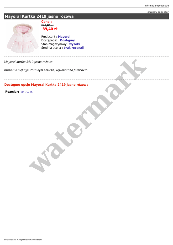Informacje o produkcie Utworzono 07-03-2017 Mayoral Kurtka 2419 jasno różowa Cena : 149,00 zł 89,40 zł Producent : Mayoral Dostępność : Dostępny Stan magazynowy : wysoki Średnia ocena : brak recenzji Mayoral kurtka 2419 jasno różowa er m ar k Kurtka w pięknym różowym kolorze, wykończona futerkiem. Dostępne opcje Mayoral Kurtka 2419 jasno różowa w at Rozmiar: 80, 70, 75. Wygenerowano w programie www.oscGold.com