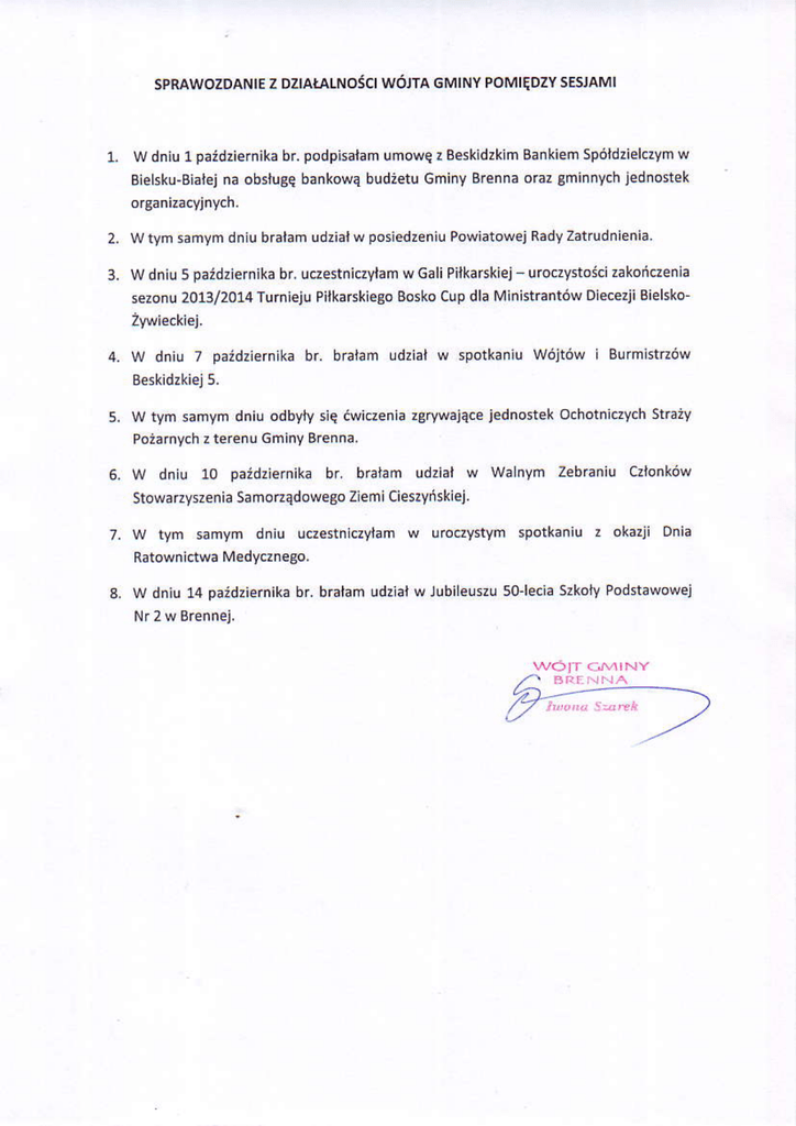 f DzlAŁALNosc| wo'TAGMllvYPoM|EozYsEslAMl SPRAWoZDAN|E w k]mBónkieńspó|dfie|cfym b|'podpisa|ań uńowĘ! Beskjdu 1. Wdniu1października budżetu GminyBr€ n na olaz Eńińntchjednostek ńa obslu8ębankową Bielsku.B]alej 2. W t y m s a m y m d n ] U b l a | a m u d z i a | w p Ó Ś ] r d f € n i u P o w i a t o w e j R a d V f a t r U d n i e n i a ' zakońĆfen]a Pi|ka6kiej uroczystości bl.ucfestniczt,łamwGaIi 3 . Wdni! 5paździe.nika Boskocup d|aMlnistrantówDiecefjiBie|sko Pilkarskieco sezonu2o13l2o14Turnieju W dńiu 7 paźdzl€ r nikab.' brałamUdfial w spotkan]uWójtów i BurmktrzÓw 5 . W iym samyń dniu odby]Y5ię ćwiczeniaz€ r Fvając€ jednosteko.hotn]cfy.hs|raży Poźa.nych z telenuGminyBrenna. W dniu 10 paźdfi.rnikabr. blałam Udfia| w wanym z€ b laniu c.lonków z]emicieszyń5k]ej' stowa2y5feńia5amorządow%o w tym samym dniu ucfestnlczyramw UrÓ.fystym 5potkóniu f okafji 0nia Medyczne8o. RalowniC.wa b|' bra|ań udzjalW ]ubieugu ss|ecja sfkoĘ Podstawowei 3 , W dnlu 14 paźdżiernika