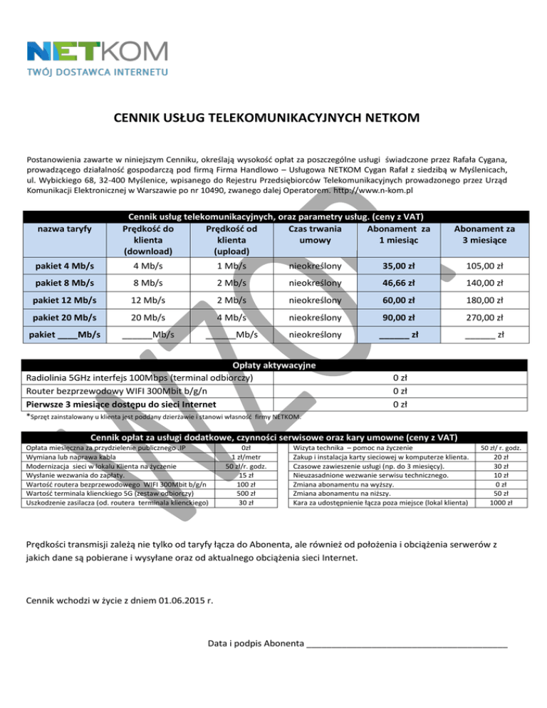CENNIK USŁUG TELEKOMUNIKACYJNYCH NETKOM Postanowienia zawarte w niniejszym Cenniku, określają wysokośd opłat za poszczególne usługi świadczone przez Rafała Cygana, prowadzącego działalnośd gospodarczą pod firmą Firma Handlowo – Usługowa NETKOM Cygan Rafał z siedzibą w Myślenicach, ul. Wybickiego 68, 32-400 Myślenice, wpisanego do Rejestru Przedsiębiorców Telekomunikacyjnych prowadzonego przez Urząd Komunikacji Elektronicznej w Warszawie po nr 10490, zwanego dalej Operatorem. http://www.n-kom.pl nazwa taryfy Cennik usług telekomunikacyjnych, oraz parametry usług. (ceny z VAT) Prędkość do Prędkość od Czas trwania Abonament za klienta klienta umowy 1 miesiąc (download) (upload) Abonament za 3 miesiące pakiet 4 Mb/s 4 Mb/s 1 Mb/s nieokreślony 35,00 zł 105,00 zł pakiet 8 Mb/s 8 Mb/s 2 Mb/s nieokreślony 46,66 zł 140,00 zł pakiet 12 Mb/s 12 Mb/s 2 Mb/s nieokreślony 60,00 zł 180,00 zł pakiet 20 Mb/s 20 Mb/s 4 Mb/s nieokreślony 90,00 zł 270,00 zł pakiet ____Mb/s ______Mb/s ______Mb/s nieokreślony ______ zł ______ zł Opłaty aktywacyjne Radiolinia 5GHz interfejs 100Mbps (terminal odbiorczy) Router bezprzewodowy WIFI 300Mbit b/g/n Pierwsze 3 miesiące dostępu do sieci Internet 0 zł 0 zł 0 zł *Sprzęt zainstalowany u klienta jest poddany dzierżawie i stanowi własnośd firmy NETKOM. Cennik opłat za usługi dodatkowe, czynności serwisowe oraz kary umowne (ceny z VAT) Opłata miesięczna za przydzielenie publicznego .IP Wymiana lub naprawa kabla Modernizacja sieci w lokalu Klienta na życzenie Wysłanie wezwania do zapłaty. Wartośd routera bezprzewodowego WIFI 300Mbit b/g/n Wartośd terminala klienckiego 5G (zestaw odbiorczy) Uszkodzenie zasilacza (od. routera terminala klienckiego) 0zł 1 zł/metr 50 zł/r. godz. 15 zł 100 zł 500 zł 30 zł Wizyta technika – pomoc na życzenie Zakup i instalacja karty sieciowej w komputerze klienta. Czasowe zawieszenie usługi (np. do 3 miesięcy). Nieuzasadnione wezwanie serwisu technicznego. Zmiana abonamentu na wyższy. Zmiana abonamentu na niższy. Kara za udostępnienie łącza poza miejsce (lokal klienta) 50 zł/ r. godz. 20 zł 30 zł 10 zł 0 zł 50 zł 1000 zł Prędkości transmisji zależą nie tylko od taryfy łącza do Abonenta, ale również od położenia i obciążenia serwerów z jakich dane są pobierane i wysyłane oraz od aktualnego obciążenia sieci Internet. Cennik wchodzi w życie z dniem 01.06.2015 r. Data i podpis Abonenta ________________________________________