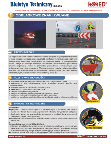 12/2003 33-170 Tuchów; ul. Tarnowska 48; tel. 014 65 25 247; fax. 014 65 25 276; Zakład Produkcji Znaków Drogowych www.wimed.pl; email: [email protected] ODBLASKOWE ZNAKI ZWIJANE PRZEZNACZENIE Za względu na swoje unikalne właściwości znaki drogowe zwijane przeznaczone są w takie miejsca na drodze, gdzie szybkość montażu i demontażu oraz możliwość łatwego przemieszczania oznakowania ma znaczący wpływ na bezpieczeństwo ruchu. Dlatego też znajdują one swoje priorytetowe zastosowanie w tymczasowej zmianie organizacji ruchu w przypadku prowadzenia krótkotrwałych prac wykonywanych w pasie drogowym. Oferowany system znaków zwijanych znajduje szerokie zastosowanie wśród przedsiębiorstw i firm drogowych, jednostek wodnokanalizacyjnych, telekomunikacji, straży pożarnej, policji itp. POZYTYWNE WŁASNOŚCI — — doskonale widoczne w każdych warunkach pogodowych i porach dnia, — wykonane z folii mikropryzmatycznej posiadają wysoki współczynnik — — — — — — odblaskowości, dostępne również w kolorach fluorescencyjnych, lekkie, łatwy i szybki montaż oraz demontaż, zajmują mało miejsca po złożeniu, estetyczne, odporne na silne napory wiatru oraz rozrywanie, możliwość cechowania znaków (logo lub adres nabywcy), możliwość kompletowania indywidualnych zestawów zgodnie z życzeniem klienta, PARAMETRY TECHNICZNE — Lico znaku: —wykonane z mikroryzmatycznych folii odblaskowych o współczynniku odbicia światła jak dla folii II generacji (współczynnik odblasku dla tychże folii jest ponad dwukrotnie wyższy od powszechnie stosowanej w produkcji konwencjonalnych znaków drogowych z folii I generacji), —symbol znaku wykonany metodą sitodruku przy użyciu specjalnych transparentnych farb do folii. — — Konstrukcje wsporcze do U20a-d i U3c-d: —wykonane z kształtowników stalowych o przekroju kwadratowym, ocynkowanych, lakierowanych proszkowo. Zastosowane specjalne blokady umożliwiają stabilne rozłożenie konstrukcji a po jej złożeniu utrzymują ją w zwartym gabarycie, —w nóżkach konstrukcji znajdują się specjalne otwory służące do zamontowania www.wimed.pl ZNAKI NA CZASIE 12/2003 Zakład Produkcji Znaków Drogowych 33-170 Tuchów; ul. Tarnowska 48; tel. 014 65 25 247; fax. 014 65 25 276; www.wimed.pl; email: [email protected] dodatkowych znaków drogowych typu A,B,C ,D rozpinanych na specjalnych stelażach wykonanych z włókna szklanego, — możliwość dodatkowego obciążenia zestawu poprzez zastosowanie worków z piaskiem wykonanych z odpornego na rozrywanie materiału plandekowego – waga worka wypełnionego piaskiem ok. 5 kg. PODSTAWOWY ASORTYMENT Tablica kierująca U3 c;d wraz ze składaną konstrukcją. Zapora drogowa U20 a;d wraz ze składaną konstrukcją. Znaki: A12a; A12b; A12c; A14; A20; A30; A34; B1; B2; B25; B31; B34; C1; C3; C9; C10; C11; D1; D2; D3; D4a; D5 oraz inne wykonywane na indywidualne zamówienie. Do samodzielnego ustawienia pojedynczego znaku stosuje się specjalne statywy wykonane ze stalowych kształtowników oraz elastyczne stelaże do naciągnięcia lica. STANDARDY WYMIAROWE Tablica U20a;d: stajak długość 1800/wysokość 1200 - lico 1800 x 300 Tablica U3c,d: stojak długość 1800/wysokość 1200 - lico 1800 x 600 Znaki A trójkąty – wielkość : 900, 1050, 1200 Znaki B,C koła – wielkość 800, 900, 1000 Znaki D kwadraty – wielkość 600 (podkład 800), 900 (podkład 1000) ZNAKI AUTOSTRADOWY - NOWY PRODUKT W OFERCIE ZNAKÓW ZWIJANYCH !!! PRZEZNACZENIE Znaki te zostały dostosowane do tymczasowego oznakowania na autostradach i drogach szybkiego ruchu. ZALETY — większa stabilność znaku i odporność na działanie wiatru dzięki regulowanej długości ramion w podstawie stojaka, — nowy, łatwy sposób mocowania lica znaku na stelażu, — możliwość ustawienia dwóch znaków na jednym statywie, — prosty i szybki montaż oraz demontaż znaku i statywu - małe gabaryty po złożeniu (możliwość przewożenia w samochodzie osobowym). PARAMETRY TECHNICZNE Stojak zbudowany jest z kształtownika stalowego o wymiarach 25mm x 25 mm x 1mm. Składa się z dwóch części: górnej i podstawy. Część dolna (podstawa składa się z czterech ramion o długości 600mm z możliwością wydłużenia o 400 mm w celu zwiększenia stabilności znaku. W części górnej montowane są znaki 1 lub 2 w zależności od potrzeby. Znaki mają wbudowany element usztywniający do którego są montowane uchwyty. Montaż znaku wykonuje się poprzez specjalny uchwyt nasuwany na konstrukcję i unieruchomiony śrubą motylkową dociskową z jednej strony. Z drugiej strony znak jest napinany uchwytem zatrzaskowym. Tak zmontowana część górna jest mocowana do podstawy znaku. www.wimed.pl ZNAKI NA CZASIE