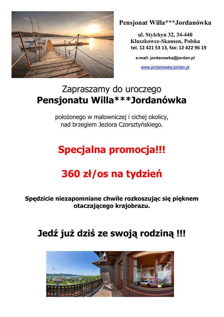 Pensjonat Willa***Jordanówka ul. Stylchyn 32, 34-440 Kluszkowce-Skansen, Polska tel. 12 421 53 13, fax: 12 422 96 19 e-mail: [email protected] www.jordanowka.jordan.pl Zapraszamy do uroczego Pensjonatu Willa***Jordanówka połoŜonego w malowniczej i cichej okolicy, nad brzegiem Jeziora Czorsztyńskiego. Specjalna promocja!!! 360 zł/os na tydzień Spędzicie niezapomniane chwile rozkoszując się pięknem otaczającego krajobrazu. Jedź juŜ dziś ze swoją rodziną !!!