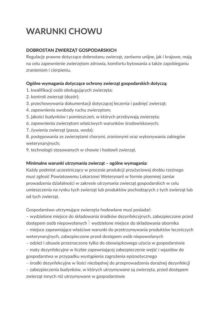 WARUNKI CHOWU DOBROSTAN ZWIERZĄT GOSPODARSKICH Regulacje prawne dotyczące dobrostanu zwierząt, zarówno unijne, jak i krajowe, mają na celu zapewnienie zwierzętom zdrowia, komfortu bytowania a także zapobieganiu zranieniom i cierpieniu. Ogólne wymagania dotyczące ochrony zwierząt gospodarskich dotyczą: 1. kwalifikacji osób obsługujących zwierzęta; 2. kontroli zwierząt (dozór); 3. przechowywania dokumentacji dotyczącej leczenia i padnięć zwierząt; 4. zapewnienia swobody ruchu zwierzętom; 5. jakości budynków i pomieszczeń, w których przebywają zwierzęta; 6. zapewnienia zwierzętom właściwych warunków środowiskowych; 7. żywienia zwierząt (pasza, woda); 8. postępowania ze zwierzętami chorymi, zranionymi oraz wykonywania zabiegów weterynaryjnych; 9. technologii stosowanych w chowie i hodowli zwierząt. Minimalne warunki utrzymania zwierząt – ogólne wymagania: Każdy podmiot uczestniczący w procesie produkcji przyżyciowej drobiu rzeźnego musi zgłosić Powiatowemu Lekarzowi Weterynarii w formie pisemnej zamiar prowadzenia działalności w zakresie utrzymania zwierząt gospodarskich w celu umieszczenia na rynku tych zwierząt lub produktów pochodzących z tych zwierząt lub od tych zwierząt. Gospodarstwo utrzymujące zwierzęta hodowlane musi posiadać: – wydzielone miejsce do składowania środków dezynfekcyjnych, zabezpieczone przed dostępem osób niepowołanych wydzielone miejsce do składowania obornika – miejsce zapewniające właściwe warunki do przetrzymywania produktów leczniczych weterynaryjnych, zabezpieczone przed dostępem osób niepowołanych – odzież i obuwie przeznaczone tylko do obowiązkowego użycia w gospodarstwie – maty dezynfekcyjne w liczbie zapewniającej zabezpieczenie wejść i wjazdów do gospodarstwa w przypadku wystąpienia zagrożenia epizootycznego – środki dezynfekcyjne w ilości niezbędnej do przeprowadzenia doraźnej dezynfekcji – zabezpieczenia budynków, w których utrzymywane są zwierzęta, przed dostępem zwierząt innych niż utrzymywane w gospodarstwie – oznakowania wejść do budynków, w których utrzymywane są zwierzęta tablicą „Osobom nieupoważnionym wstęp wzbroniony” – „ewidencję leczenia zwierząt gospodarskich oraz zwierząt, z których pozyskane tkanki lub produkty są przeznaczone do spożycia przez ludzi” Ponadto spełnione muszą być poniższe warunki: – w gospodarstwie zachowana jest odpowiednia czystość budynków, w których utrzymywane są zwierzęta – zwierzętom zapewniono opiekę i właściwe warunki utrzymywania, uwzględniając minimalne normy powierzchni w zależności od systemów utrzymywania, gatunku, wieku i stanu fizjologicznego zwierząt – zwierzęta utrzymywane są w warunkach nieszkodliwych dla ich zdrowia oraz nie powodujących urazów i uszkodzeń ciała lub cierpień – przestrzegany jest zakaz używania do przepędzania zwierząt przedmiotów lub narzędzi, które mogą spowodować ich okaleczenie – przestrzegany jest zakaz podawania zwierzętom gospodarskim: – substancji o działaniu tyreostatycznym, – stilbenów, pochodnych stilbenów, ich soli i estrów – substancji o działaniu beta–agonistycznym, – oestrabiolu 17ß i jego pochodnych estropodobnych, – substancji o działaniu estrogennym innych niż oestrabiol 17ß i jego pochodne estropodobne oraz o działaniu androgennym lub gestagennym w innym celu niż leczenie zwierząt, – W gospodarstwie nie są przetrzymywane produkty lecznicze weterynaryjne zawierające: – substancje o działaniu beta-agonistycznym, które mogą być stosowane w celu przyspieszenia porodu; – oestrabiolu 17ß i jego pochodnych estropodobnych – W przypadku prowadzenia w gospodarstwie dotychczas niestosowanej na terytorium Rzeczypospolitej Polskiej technologii chowu zwierząt, gospodarstwo posiada zezwolenie wojewody stwierdzające, że technologia spełnia wymogi określone ustawą o ochronie zwierząt – Zwierzęta mają zapewnioną swobodę ruchów, a w szczególności możliwość kładzenia się, wstawania oraz leżenia – Zwierzęta gospodarskie utrzymywane są w warunkach umożliwiających kontakt wzrokowy z innymi zwierzętami – Pomieszczenia inwentarskie dla zwierząt gospodarskich oświetlono przystosowanym dla danego gatunku zwierząt światłem sztucznym lub zapewniono dostęp światła naturalnego – Pomieszczenie inwentarskie wyposażono w stałe lub przenośne oświetlenie umożliwiające ich kontrolę i doglądanie zwierząt o każdej porze – Pomieszczenia dla zwierząt gospodarskich, ich wyposażenie oraz sprzęt używany przy utrzymywaniu zwierząt wykonane jest z materiałów nieszkodliwych dla zdrowia zwierząt, oraz nadających się do czyszczenia i dezynfekcji – Pomieszczenia dla zwierząt gospodarskich, ich wyposażenie oraz sprzęt używany przy utrzymywaniu zwierząt są czyszczone i dezynfekowane – Odchody zwierząt oraz nie zjedzone resztki pasz usuwane są z pomieszczeń inwentarskich tak często, aby uniknąć wydzielania się nieprzyjemnych woni, zanieczyszczenia paszy lub wody oraz zabezpieczono je przed muchami i gryzoniami – Wyposażenie i sprzęt przeznaczone do karmienia i pojenia zwierząt wykonane są i umieszczane w sposób minimalizujący możliwość zanieczyszczenia paszy lub wody oraz ułatwiający bezkonfliktowy dostęp zwierząt do paszy i wody – Wyposażenie i sprzęt w pomieszczeniach inwentarskich dla zwierząt gospodarskich sprawdzane są co najmniej raz dziennie, a wykryte usterki są niezwłocznie usuwane – Podłoga w pomieszczeniach inwentarskich dla zwierząt jest twarda, równa i stabilna, a jej powierzchnia gładka i nieśliska – Obieg powietrza, stopień zapylenia, temperatura, wilgotność względna powietrza i stężenie gazów są utrzymane na poziomie nieszkodliwym dla tych zwierząt – Przy zastosowaniu mechanicznego lub automatycznego systemu wentylacji pomieszczeń inwentarskich, system ten zaopatrzony jest
