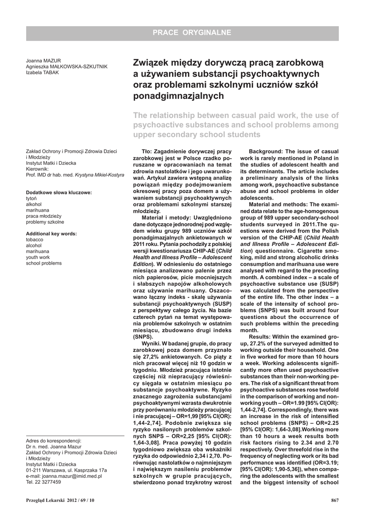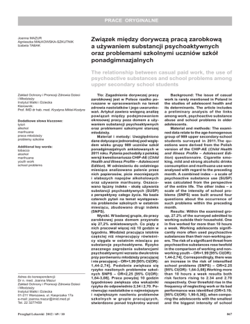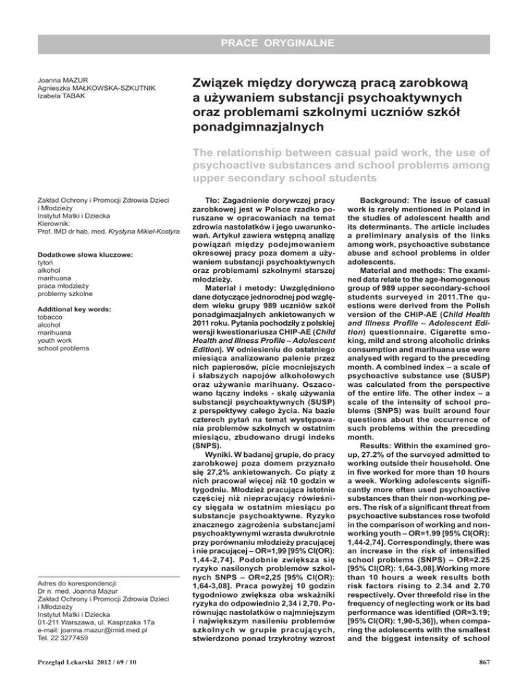 PRACE ORYGINALNE Joanna Mazur Agnieszka Małkowska-Szkutnik Izabela Tabak Związek między dorywczą pracą zarobkową a używaniem substancji psychoaktywnych oraz problemami szkolnymi uczniów szkół ponadgimnazjalnych The relationship between casual paid work, the use of psychoactive substances and school problems among upper secondary school students Zakład Ochrony i Promocji Zdrowia Dzieci i Młodzieży Instytut Matki i Dziecka Kierownik: Prof. IMD dr hab. med. Krystyna Mikiel-Kostyra Dodatkowe słowa kluczowe: tytoń alkohol marihuana praca młodzieży problemy szkolne Additional key words: tobacco alcohol marihuana youth work school problems Adres do korespondencji: Dr n. med. Joanna Mazur Zakład Ochrony i Promocji Zdrowia Dzieci i Młodzieży Instytut Matki i Dziecka 01-211 Warszawa, ul. Kasprzaka 17a e-mail: [email protected] Tel. 22 3277459 Przegląd Lekarski 2012 / 69 / 10 Tło: Zagadnienie dorywczej pracy zarobkowej jest w Polsce rzadko poruszane w opracowaniach na temat zdrowia nastolatków i jego uwarunkowań. Artykuł zawiera wstępną analizę powiązań między podejmowaniem okresowej pracy poza domem a używaniem substancji psychoaktywnych oraz problemami szkolnymi starszej młodzieży. Materiał i metody: Uwzględniono dane dotyczące jednorodnej pod względem wieku grupy 989 uczniów szkół ponadgimazjalnych ankietowanych w 2011 roku. Pytania pochodziły z polskiej wersji kwestionariusza CHIP-AE (Child Health and Illness Profile – Adolescent Edition). W odniesieniu do ostatniego miesiąca analizowano palenie przez nich papierosów, picie mocniejszych i słabszych napojów alkoholowych oraz używanie marihuany. Oszacowano łączny indeks - skalę używania substancji psychoaktywnych (SUSP) z perspektywy całego życia. Na bazie czterech pytań na temat występowania problemów szkolnych w ostatnim miesiącu, zbudowano drugi indeks (SNPS). Wyniki. W badanej grupie, do pracy zarobkowej poza domem przyznało się 27,2% ankietowanych. Co piąty z nich pracował więcej niż 10 godzin w tygodniu. Młodzież pracująca istotnie częściej niż niepracujący rówieśnicy sięgała w ostatnim miesiącu po substancje psychoaktywne. Ryzyko znacznego zagrożenia substancjami psychoaktywnymi wzrasta dwukrotnie przy porównaniu młodzieży pracującej i nie pracującej – OR=1,99 [95% CI(OR): 1,44-2,74]. Podobnie zwiększa się ryzyko nasilonych problemów szkolnych SNPS – OR=2,25 [95% CI(OR): 1,64-3,08]. Praca powyżej 10 godzin tygodniowo zwiększa oba wskaźniki ryzyka do odpowiednio 2,34 i 2,70. Porównując nastolatków o najmniejszym i największym nasileniu problemów szkolnych w grupie pracujących, stwierdzono ponad trzykrotny wzrost Background: The issue of casual work is rarely mentioned in Poland in the studies of adolescent health and its determinants. The article includes a preliminary analysis of the links among work, psychoactive substance abuse and school problems in older adolescents. Material and methods: The examined data relate to the age-homogenous group of 989 upper secondary-school students surveyed in 2011.The questions were derived from the Polish version of the CHIP-AE (Child Health and Illness Profile – Adolescent Edition) questionnaire. Cigarette smoking, mild and strong alcoholic drinks consumption and marihuana use were analysed with regard to the preceding month. A combined index – a scale of psychoactive substance use (SUSP) was calculated from the perspective of the entire life. The other index – a scale of the intensity of school problems (SNPS) was built around four questions about the occurrence of such problems within the preceding month. Results: Within the examined group, 27.2% of the surveyed admitted to working outside their household. One in five worked for more than 10 hours a week. Working adolescents significantly more often used psychoactive substances than their non-working peers. The risk of a significant threat from psychoactive substances rose twofold in the comparison of working and nonworking youth – OR=1.99 [95% CI(OR): 1,44-2,74]. Correspondingly, there was an increase in the risk of intensified school problems (SNPS) – OR=2.25 [95% CI(OR): 1,64-3,08].Working more than 10 hours a week results both risk factors rising to 2.34 and 2.70 respectively. Over threefold rise in the frequency of neglecting work or its bad performance was identified (OR=3.19; [95% CI(OR): 1,90-5,36]), when comparing the adolescents with the smallest and the biggest intensity of school 867 częstości zaniedbywania pracy – OR=3,19; [95% CI(OR): 1,90-5,36]. Wnioski: Uczniowie szkół ponadgimnazjalnych, którzy podejmują pracę zarobkową poza domem są w grupie ryzyka używania substancji psychoaktywnych i problemów szkolnych. Wskazane jest podjęcie pogłębionych badań (w tym długofalowych i jakościowych) nad rodzajem pracy i motywami jej podejmowania oraz nad wpływem pracy na rozwój nastolatków. Wstęp Problem dorywczej pracy zarobkowej jest w Polsce rzadko poruszany w opracowaniach na temat stylu życia i zachowań zdrowotnych nastolatków. Autorzy prac anglojęzycznych uważają, że ograniczona liczba godzin w tygodniu przeznaczanych na pracę może stymulować lepszy rozwój [20], kształtować umiejętności komunikacji, współpracy z ludźmi i poczucie własnej skuteczności [9]. Dopiero u młodzieży uczącej się i pracującej w większym wymiarze czasowym zauważa się negatywne konsekwencje pracy, a przede wszystkim pogorszenie wyników w nauce [14] oraz mniejsze szanse na kontynuowanie nauki i zdobycie wyższego wykształcenia [17]. Znaczne obciążenie pracą może negatywnie odbijać się na nauce z dwóch powodów. Po pierwsze, nastolatki mają mniej czasu na naukę, odrabianie lekcji i zajęcia pozalekcyjne [4,16]. Po drugie, mogą świadomie przedkładać pracę nad obowiązki szkolne, mieć inne dążenia i narastający brak motywacji do nauki [18]. Podjęcie pracy zarobkowej jest uważane za jeden z przeja