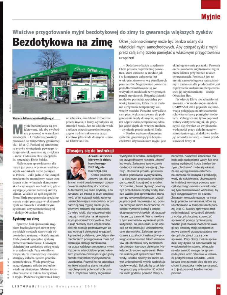 Myjnie W³aœciwe przygotowanie myjni bezdotykowej do zimy to gwarancja wiêkszych zysków fot. Ehrle Bezdotykowa na zimê Wojciech Jab³oñski [email protected] M yjnie bezdotykowe są projektowane, tak aby swobodnie pracować w warunkach zimowych. – Urządzenia powinny pracować do temperatury granicznej ok.- 15 st. C. Poniżej tej temperatury ryzyko wystąpienia pewnego rodzaju usterek znacznie się zwiększa – mówi Oktawian Hes, specjalista ds. sprzedaży Ehrle Polska. Najlepszym sprawdzianem dla myjni jest praca w jeszcze trudniejszych warunkach niż te panujące w Polsce. – Jako jedni z nielicznych producentów montujemy nasze urządzenia m.in. w krajach skandynawskich czy krajach wschodnich, gdzie występuje jeszcze bardziej surowy klimat. Właśnie do tych regionów firma Ehrle przygotowała specjalne wersje myjni pracujące w ekstremalnych warunkach z dodatkowymi systemami antyzamrożeniowymi – dodaje Oktawian Hes. R E K L A M A Systemy na zimê Sprawne funkcjonowanie myjniom bezdotykowych nawet przy wysokich mrozach zapewniają odpowiednie systemy. – Każda myjnia Ehrle posiada specjalne systemy przeciwzamrożeniowe. Głównym układem jest zamknięty obieg wody w urządzeniach. Przy określonej temperaturze zewnętrznej termostat sterujący załącza system przeciwzamrożeniowe. Woda przepływa przez elementy układu pod odpowiednim ciśnieniem. Można to zaobserwować w trakcie korzystania z myjni. Podczas wyjmowania lancy L I S T O P A D / S t a c j a ze schowka, nim klient rozpocznie proces mycia, z lancy wydobywa się strumień wody. Jest to właśnie woda z układu przeciwzamrożeniowego, często mylnie traktowana przez klientów jako woda do mycia – mówi Oktawian Hes. Okres jesienno-zimowy mo¿e byæ bardzo udany dla w³aœcicieli myjni samochodowych. Aby czerpaæ zyski z myjni przez ca³¹ zimê trzeba pamiêtaæ o w³aœciwym przygotowaniu urz¹dzeñ. – Dodatkowo każde urządzenie Ehrle posiada nagrzewnicę powietrza, która zarówno w module jak i w kontenerze załączona jest w okresie zimowym wg określonych parametrów. Nagrzewnice powietrza ponadto zainstalowane są we wszystkich modelach zewnętrznych paneli sterujących. Również ścianki modułów posiadają specjalną powłokę termiczną, która ma za zadanie utrzymanie temperatury wewnątrz modułu. Ponadto oczywiście sam piec, wykorzystywany do podgrzewania wody do mycia, wytwarza odpowiednią temperaturę oddając część ciepła do wnętrza modułu. – wymienia przedstawiciel Ehrle. – Bardzo ważnym elementem systemu, gwarantującym bezpieczeństwo użytkownikom myjni, jest układ ogrzewania posadzki. Pozwala on na swobodne użytkowanie myjni przez klienta przy bardzo niskich temperaturach. Ponieważ jest to myjnia samoobsługowa najważniejszym zadaniem dla producentów jest zapewnienie maksimum bezpieczeństwa jej użytkownikom – dodaje Oktawian Hes. W ofercie Ehrle nie zabrakło też nowości – W modułowym modelu CARWASH 2010 pojawiła się innowacja polegająca na umieszczeniu schowka na lancę pomiędzy modułami. Zabieg ten nie tylko poprawił walory estetyczne myjni, ale przyczynił się również do zwiększenia wydajności pracy układu przeciwzamrożeniowego, dodatkowo izolując schowki na lancę – mówi przedstawiciel firmy. ■ Stosujmy siê do instrukcji Arkadiusz Gohra kierownik działu handlowego BKF Myjnie Bezdotykowe Okres jesienno zimowy jest dla właścicieli myjni bezdotykowych zdecydowanie najbardziej dochodowy. Auta brudzą się dużo szybciej, a to oznacza, że trzeba je dużo częściej myć. W tej sytuacji każda usterka unieruchamiająca stanowisko, a tym bardziej całą myjnię skutkuje poważnymi stratami dla właściciela. Co więc robić, aby niezawodność naszej myjni była na jak najwyższym poziomie? Oczywiście dbać o nią! Niestety duża część właścicieli nie stosuje podstawowych zasad obsługi i pielęgnacji urządzeń. A przecież podstawą, „swoistym elementarzem” postępowania musi być instrukcja obsługi zamieszczana przez każdego producenta myjni. Każdemu właścicielowi przed okresem jesienno–zimowym sugerujemy przede wszystkim wyczyszczenie urządzenia. Pozwoli to na łatwiejszą kontrolę wizualną stanu instalacji i wychwycenie potencjalnych usterek. Urządzenie należy regularnie B e n z y n o w a 2 0 1 0 wyczyścić w środku, szczególnie po przypadkowym rozlaniu „chemii” lub wody. Zalecamy sprawdzenie drożności instalacji dozującej „chemię”. Dozownik proszku powinien zostać gruntownie wyczyszczony – w skrajnych przypadkach należy go rozkręcić i przejrzeć w środku. Dozowniki „chemii płynnej” powinny być przepłukane czystą wodą. Bardzo ważne jest sprawdzenie stanu pompy wysokociśnieniowej. Jeżeli jej praca jest niepokojąca np. pompa przerywa może to oznaczać, że trzeba wymienić którąś z części eksploatacyjnych takich jak uszczelniacze czy zaworki. Warto niektóre z tych elementów wymieniać profilaktycznie, co jakiś czas, a nie czekać aż się popsują i unieruchomią całe stanowisko. Zalecam sprawdzenie szczelności instalacji wysokiego ciśnienia oraz takich elementów jak obrotówki przy ramionach obrotowych czy przy pistolecie. Należy je okresowo wymieniać. Równie ważne jest sprawdzenie filtra wody. Bardzo brudny filtr może nawet unieruchomić myjnie (zablokuje dopływ wody). Szkoda by z tak błahej przyczyny unieruchomić obiekt na wiele godzin i ponieść straty fi- nansowe. Kluczowe znaczenie ma instalacja uzdatniania wody. Ma ona swoją wydajność i przy bardzo dużym „obłożeniu” może się okazać, że nie wyregulowana odwrócona osmoza nie nadąża z produkcją wody do spłukiwania. Uszkodzenie tej instalacji wymaga pomocy specjalistycznego serwisu – warto więc się tym zainteresować wcześniej, by być przygotowanym do sezonu Zwracam wreszcie uwagę na instalacje przeciw zamarzaniu, które są uruchamiane w temperaturach poniżej 0 st. C. Nal