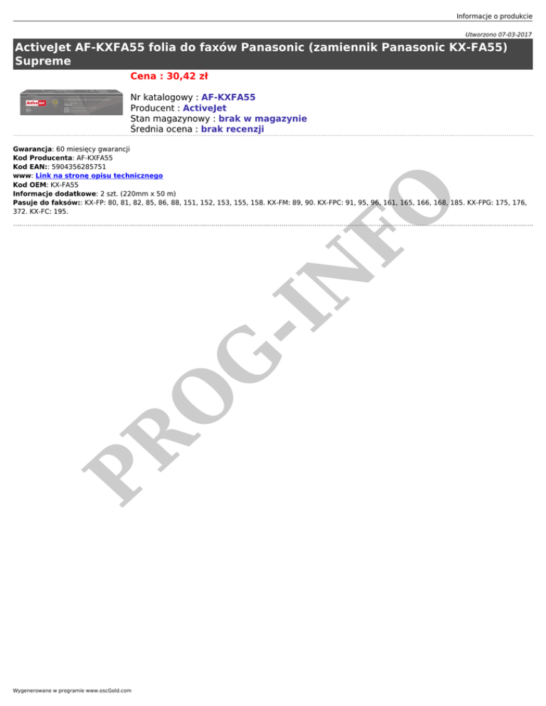 Informacje o produkcie Utworzono 07-03-2017 ActiveJet AF-KXFA55 folia do faxów Panasonic (zamiennik Panasonic KX-FA55) Supreme Cena : 30,42 zł Nr katalogowy : AF-KXFA55 Producent : ActiveJet Stan magazynowy : brak w magazynie Średnia ocena : brak recenzji PR O G -I N FO Gwarancja: 60 miesięcy gwarancji Kod Producenta: AF-KXFA55 Kod EAN:: 5904356285751 www: Link na stronę opisu technicznego Kod OEM: KX-FA55 Informacje dodatkowe: 2 szt. (220mm x 50 m) Pasuje do faksów:: KX-FP: 80, 81, 82, 85, 86, 88, 151, 152, 153, 155, 158. KX-FM: 89, 90. KX-FPC: 91, 95, 96, 161, 165, 166, 168, 185. KX-FPG: 175, 176, 372. KX-FC: 195. Wygenerowano w programie www.oscGold.com