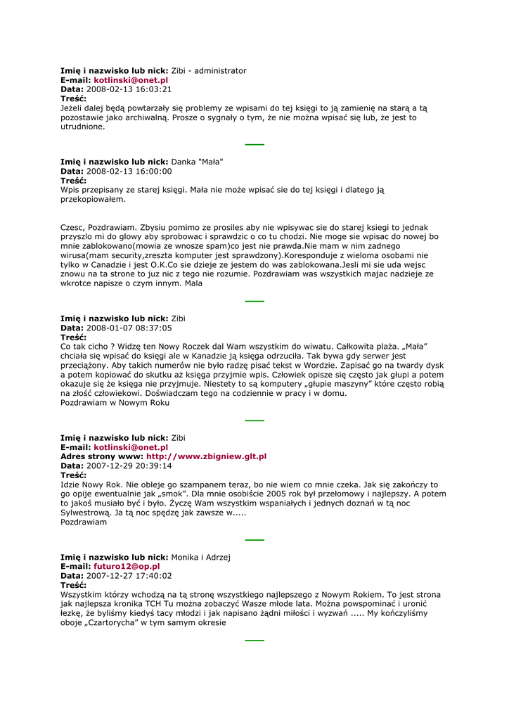 Imię i nazwisko lub nick: Zibi - administrator E-mail: [email protected] Data: 2008-02-13 16:03:21 Treść: JeŜeli dalej będą powtarzały się problemy ze wpisami do tej księgi to ją zamienię na starą a tą pozostawie jako archiwalną. Prosze o sygnały o tym, Ŝe nie moŜna wpisać się lub, Ŝe jest to utrudnione. Imię i nazwisko lub nick: Danka "Mała" Data: 2008-02-13 16:00:00 Treść: Wpis przepisany ze starej księgi. Mała nie moŜe wpisać sie do tej księgi i dlatego ją przekopiowałem. Czesc, Pozdrawiam. Zbysiu pomimo ze prosiles aby nie wpisywac sie do starej ksiegi to jednak przyszlo mi do glowy aby sprobowac i sprawdzic o co tu chodzi. Nie moge sie wpisac do nowej bo mnie zablokowano(mowia ze wnosze spam)co jest nie prawda.Nie mam w nim zadnego wirusa(mam security,zreszta komputer jest sprawdzony).Koresponduje z wieloma osobami nie tylko w Canadzie i jest O.K.Co sie dzieje ze jestem do was zablokowana.Jesli mi sie uda wejsc znowu na ta strone to juz nic z tego nie rozumie. Pozdrawiam was wszystkich majac nadzieje ze wkrotce napisze o czym innym. Mala Imię i nazwisko lub nick: Zibi Data: 2008-01-07 08:37:05 Treść: Co tak cicho ? Widzę ten Nowy Roczek dal Wam wszystkim do wiwatu. Całkowita plaŜa. „Mała” chciała się wpisać do księgi ale w Kanadzie ją księga odrzuciła. Tak bywa gdy serwer jest przeciąŜony. Aby takich numerów nie było radzę pisać tekst w Wordzie. Zapisać go na twardy dysk a potem kopiować do skutku aŜ księga przyjmie wpis. Człowiek opisze się często jak głupi a potem okazuje się Ŝe księga nie przyjmuje. Niestety to są komputery „głupie maszyny” które często robią na złość człowiekowi. Doświadczam tego na codziennie w pracy i w domu. Pozdrawiam w Nowym Roku Imię i nazwisko lub nick: Zibi E-mail: [email protected] Adres strony www: http://www.zbigniew.glt.pl Data: 2007-12-29 20:39:14 Treść: Idzie Nowy Rok. Nie obleje go szampanem teraz, bo nie wiem co mnie czeka. Jak się zakończy to go opije ewentualnie jak „smok”. Dla mnie osobiście 2005 rok był przełomowy i najlepszy. A potem to jakoś musiało być i było. śyczę Wam wszystkim wspaniałych i jednych doznań w tą noc Sylwestrową. Ja tą noc spędzę jak zawsze w..... Pozdrawiam Imię i nazwisko lub nick: Monika i Adrzej E-mail: [email protected] Data: 2007-12-27 17:40:02 Treść: Wszystkim którzy wchodzą na tą stronę wszystkiego najlepszego z Nowym Rokiem. To jest strona jak najlepsza kronika TCH Tu moŜna zobaczyć Wasze młode lata. MoŜna powspominać i uronić łezkę, Ŝe byliśmy kiedyś tacy młodzi i jak napisano Ŝądni miłości i wyzwań ..... My kończyliśmy oboje „Czartorycha” w tym samym okresie Imię i nazwisko lub nick: BACA E-mail: [email protected] Data: 2007-12-26 11:21:51 Treść: Wszystkim CT-owiczom i znajomym Szczęśliwego Nowego 2008 Roku. Spełnienia marzeń, wielkich dokonań, uśmiechu i radości z Ŝycia Imię i nazwisko lub nick: Ela Groszewska E-mail: [email protected] Data: 2007-12-25 18:54:11 Treść: Gdy przyjdą Święta w srebrnej bieli gdy Stary Rok w Nowy się zamieni przyjmijcie gorące me Ŝyczenia niech się Wam spełnią wszystkie marzenia. z okazji Świąt BoŜego Narodzenia Imię i nazwisko lub nick: Małgorzata Piskorska E-mail: [email protected] Data: 2007-12-24 23:02:05 Treść: Gwiazdki najjaśniejszej, choinki najpiękniejszej, prezentów wymarzonych, świąt mile spędzonych, karnawału szałowego i nowego roku bardzo udanego:-)))