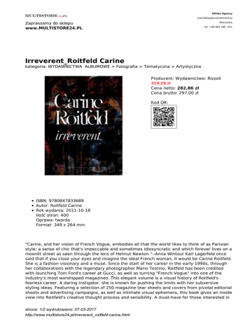 Glinka Agency mail;[email protected] Zapraszamy do sklepu www.MULTISTORE24.PL Warszawa tel. +48 602 395 051 Irreverent_Roitfeld Carine kategoria: WYDAWNICTWA ALBUMOWE > Fotografia > Tematyczna > Artystyczna Producent: Wydawnictwo: Rizzoli 314,29 zł Cena netto: 282,86 zł Cena brutto: 297,00 zł Kod QR: ISBN: 9780847833689 Autor: Roitfeld Carine Rok wydania: 2011-10-18 Ilość stron: 400 Oprawa: twarda Format: 349 x 264 mm "Carine, and her vision of French Vogue, embodies all that the world likes to think of as Parisian style: a sense of chic that's impeccable and sometimes idiosyncratic and which forever lives on a moonlit street as seen through the lens of Helmut Newton."--Anna Wintour Karl Lagerfeld once said that if you close your eyes and imagine the ideal French woman, it would be Carine Roitfeld. She is a fashion visionary and a muse. Since the start of her career in the early 1990s, through her collaborations with the legendary photographer Mario Testino, Roitfeld has been credited with launching Tom Ford's career at Gucci, as well as turning "French Vogue" into one of the industry's most worshipped magazines. This elegant volume is a visual history of Roitfeld's fearless career. A daring instigator, she is known for pushing the limits with her subversive styling ideas. Featuring a selection of 250 magazine tear sheets and covers from pivotal editorial shoots and advertising campaigns, as well as intimate visual ephemera, this book gives an inside view into Roitfeld's creative thought process and sensibility. A must-have for those interested in strona: 1/2 wydrukowano: 07-03-2017 http://www.multistore24.pl/irreverent_roitfeld-carine.html cutting-edge fashion and femininity, this book will empower women to follow Roitfeld's lead and take risks with their personal style. strona: 2/2 wydrukowano: 07-03-2017 http://www.multistore24.pl/irreverent_roitfeld-carine.html