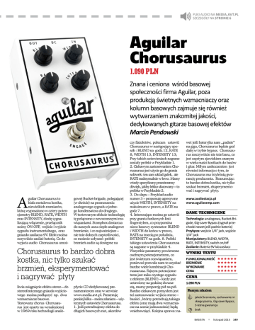 PLIKI AUDIO NA MEDIA.AVT.PL SZCZEGÓŁY NA STRONIE 6 Aguilar Chorusaurus 1.090 PLN Znana i ceniona wśród basowej społeczności firma Aguilar, poza produkcją świetnych wzmacniaczy oraz kolumn basowych zajmuje się również wytwarzaniem znakomitej jakości, dedykowanych gitarze basowej efektów Marcin Pendowski A guilar Chorusaurus to biała metalowa kostka, niewielkich rozmiarów, którą wyposażono w cztery potencjometry BLEND, RATE, WIDTH oraz INTENSITY, diodę sygnalizującą włączenie, przełącznik nożny ON-OFF, wejście i wyjście sygnału instrumentalnego, oraz gniazdo zasilacza 9V. Efekt można oczywiście zasilać baterią. Co do wyjscia audio Chorusaurus umoż- gowej Bucket-brigade, polegającej (w skrócie) na przenoszeniu analogowego sygnału z jednego kondensatora do drugiego. W testowanym efekcie technologię tę połączono z nowoczesnymi rozwiązaniami. Stompbox dostarcza do naszych uszu ciepłe analogowe brzmienie, i co najważniejsze – nie tnie dolnych częstotliwości, co możecie usłyszeć: próbki brzmień audio są dostępne na Chorusaurus to bardzo dobra kostka, nic tylko szukać brzmień, eksperymentować i nagrywać płyty liwia osiągnięcie efektu stereo – do stereofonicznego gniazda wyjściowego można podłączyć np. dwa wzmacniacze basowe. Testowany chorus Chorusaurus jest oparty na wynalezionej w 1969 roku technologii analo- płycie CD dedykowanej prenumeratorom oraz w serwisie www.media.avt.pl. Prezentuję poniżej kilka – moim zdaniem – użytecznych ustawień Chorusaurusa. 1. Jeśli potrzebujemy efektu do długich basowych nut, akordów czy flażoletów, polecam ustawić Chorusaurus w następujący sposób : BLEND na godz.12, RATE 8, WIDTH 13, INTENSITY 13; Przy takich ustawieniach nagrane zostały próbki w Przykładzie 1. 2. Ciekawym zastosowaniem Chorusaurusa jest użycie go do grania solówek: ten sam układ gałek, ale RATE maksymalnie w lewo. Mamy wtedy specyficzny przestrzenny dźwięk, jakby lekko sfazowany – to próbka w Przykładzie 2. 3. Do slapu – Przykład audio numer 3 – proponuję agresywne użycie WIDTH, INTENSITY na maksimum w prawo, a RATE na godz 7. 4. Interesująco można go ustawić przy graniu funkowych linii fingerstylem, co przypomina nieco basowy syntezator: BLEND i WIDTH do końca w prawo, RATE na trzecią po południu, INTENSITY na godz. 8. Próbki takiego ustawienia Chorusaurusa są nagrane w przykładzie 4. Wszystkie parametry powierzono osobnym potencjometrom, co jest świetnym rozwiązaniem, ponieważ pozwala nam to uzyskać bardzo wiele kombinacji Chorusaurusa. Fajnym potencjometrem jest miks czystego sygnału z efektem (BLEND) – kiedy jest ustawiony na godzinę dwunastą, mamy proporcję pół na pół. Bardzo ciekawym pomysłem jest też zastosowanie wyjścia stereo – basiści , którzy potrzebują takiego efektu (oraz mają dwa wzmacniacze na scenie jednocześnie) będą wniebowzięci. Kolejna sprawa: na- wet jeśli bateryjka nam „padnie” na gigu, Chorusaurus będzie grał dalej w trybie bypass. Chorusaurus rzeczywiście nie tnie basu, co jest częstym zjawiskiem znanym w wielu maści kostkach do basów i gitar. Miłym zaskoczeniem jest również informacja o tym, że Chorusaurus ma trzyletnią gwarancję producenta. Reasumując: to bardzo dobra kostka, nic tylko szukać brzmień, eksperymentować i nagrywać płyty. www.audiostacja.pl www.aguilaramp.com DANE TECHNICZNE Technologia: analogowa, Bucket-Brigade, Gig-saver Bypass (sygnał przechodzi nawet jeśli padnie bateria) Przyłącza: wejście 1/4” jack, wyjście 1/4” jack Manipulatory: BLEND, WIDTH, RATE, INTENSITY, switch on/off Zasilanie: Bateria 9V lub zasilacz WYNIKI TESTU FUNKCJONALNOŚĆ BRZMIENIE WYKONANIE CENA [][][][][][] [][][][][][] [][][][][}[] [][][][][}[] CENA 1.090 PLN Naszym zdaniem jakość brzmienia, zachowanie ni skiego pasma, Gig-saver Bypass, 3-letnia gwarancja brak BASISTA listopad 2015 149