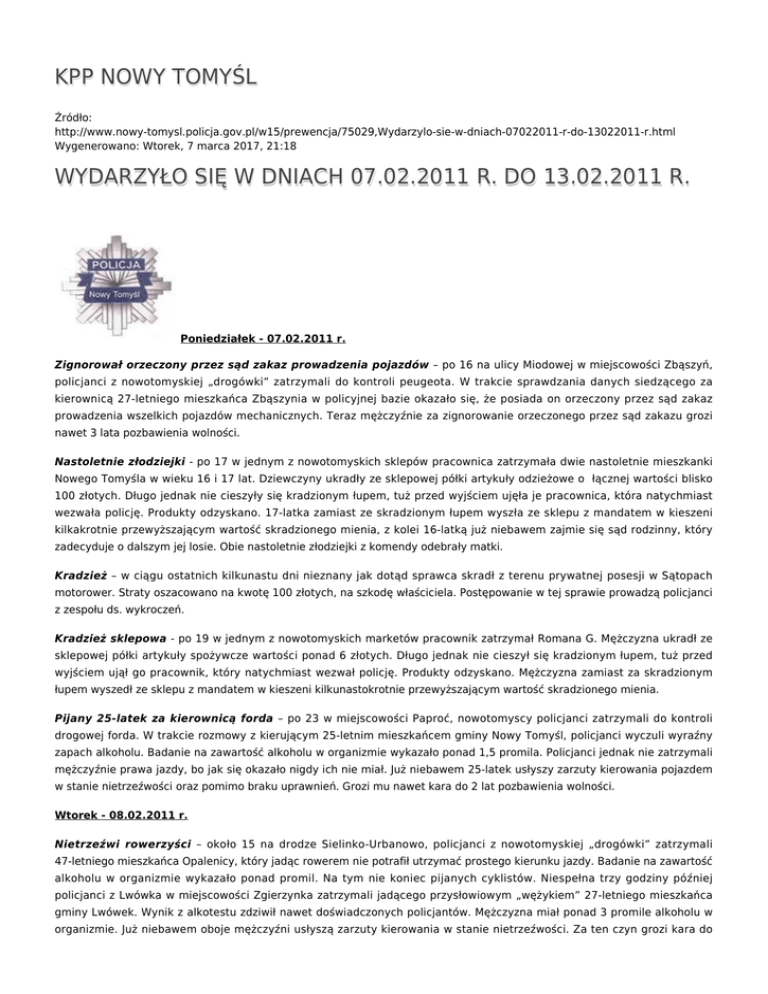 KPP NOWY TOMYŚL Źródło: http://www.nowy-tomysl.policja.gov.pl/w15/prewencja/75029,Wydarzylo-sie-w-dniach-07022011-r-do-13022011-r.html Wygenerowano: Wtorek, 7 marca 2017, 21:18 WYDARZYŁO SIĘ W DNIACH 07.02.2011 R. DO 13.02.2011 R. Poniedziałek - 07.02.2011 r. Zignorował orzeczony przez sąd zakaz prowadzenia pojazdów – po 16 na ulicy Miodowej w miejscowości Zbąszyń, policjanci z nowotomyskiej „drogówki” zatrzymali do kontroli peugeota. W trakcie sprawdzania danych siedzącego za kierownicą 27-letniego mieszkańca Zbąszynia w policyjnej bazie okazało się, że posiada on orzeczony przez sąd zakaz prowadzenia wszelkich pojazdów mechanicznych. Teraz mężczyźnie za zignorowanie orzeczonego przez sąd zakazu grozi nawet 3 lata pozbawienia wolności. Nastoletnie złodziejki - po 17 w jednym z nowotomyskich sklepów pracownica zatrzymała dwie nastoletnie mieszkanki Nowego Tomyśla w wieku 16 i 17 lat. Dziewczyny ukradły ze sklepowej półki artykuły odzieżowe o łącznej wartości blisko 100 złotych. Długo jednak nie cieszyły się kradzionym łupem, tuż przed wyjściem ujęła je pracownica, która natychmiast wezwała policję. Produkty odzyskano. 17-latka zamiast ze skradzionym łupem wyszła ze sklepu z mandatem w kieszeni kilkakrotnie przewyższającym wartość skradzionego mienia, z kolei 16-latką już niebawem zajmie się sąd rodzinny, który zadecyduje o dalszym jej losie. Obie nastoletnie złodziejki z komendy odebrały matki. Kradzież – w ciągu ostatnich kilkunastu dni nieznany jak dotąd sprawca skradł z terenu prywatnej posesji w Sątopach motorower. Straty oszacowano na kwotę 100 złotych, na szkodę właściciela. Postępowanie w tej sprawie prowadzą policjanci z zespołu ds. wykroczeń. Kradzież sklepowa - po 19 w jednym z nowotomyskich marketów pracownik zatrzymał Romana G. Mężczyzna ukradł ze sklepowej półki artykuły spożywcze wartości ponad 6 złotych. Długo jednak nie cieszył się kradzionym łupem, tuż przed wyjściem ujął go pracownik, który natychmiast wezwał policję. Produkty odzyskano. Mężczyzna zamiast za skradzionym łupem wyszedł ze sklepu z mandatem w kieszeni kilkunastokrotnie przewyższającym wartość skradzionego mienia. Pijany 25-latek za kierownicą forda – po 23 w miejscowości Paproć, nowotomyscy policjanci zatrzymali do kontroli drogowej forda. W trakcie rozmowy z kierującym 25-letnim mieszkańcem gminy Nowy Tomyśl, policjanci wyczuli wyraźny zapach alkoholu. Badanie na zawartość alkoholu w organizmie wykazało ponad 1,5 promila. Policjanci jednak nie zatrzymali mężczyźnie prawa jazdy, bo jak się okazało nigdy ich nie miał. Już niebawem 25-latek usłyszy zarzuty kierowania pojazdem w stanie nietrzeźwości oraz pomimo braku uprawnień. Grozi mu nawet kara do 2 lat pozbawienia wolności. Wtorek - 08.02.2011 r. Nietrzeźwi rowerzyści – około 15 na drodze Sielinko-Urbanowo, policjanci z nowotomyskiej „drogówki” zatrzymali 47-letniego mieszkańca Opalenicy, który jadąc rowerem nie potrafił utrzymać prostego kierunku jazdy. Badanie na zawartość alkoholu w organizmie wykazało ponad promil. Na tym nie koniec pijanych cyklistów. Niespełna trzy godziny później policjanci z Lwówka w miejscowości Zgierzynka zatrzymali jadącego przysłowiowym „wężykiem” 27-letniego mieszkańca gminy Lwówek. Wynik z alkotestu zdziwił nawet doświadczonych policjantów. Mężczyzna miał ponad 3 promile alkoholu w organizmie. Już niebawem oboje mężczyźni usłyszą zarzuty kierowania w stanie nietrzeźwości. Za ten czyn grozi kara do roku pozbawienia wolności, utrata prawa jazdy oraz wysoka grzywna. Prowadził fiata mając ponad 0,5 promila – po 17 w miejscowości Trzcianka, dzielnicowy z Kuślina zatrzymał do kontroli drogowej fiata. W trakcie rozmowy z kierującym 43-letnim mieszkańcem gminy Kuślin, policjanci wyczuli wyraźny zapach alkoholu. Badanie na zawartość alkoholu w organizmie wykazało ponad 0,5 promila. Postępowanie w tej sprawie prowadzą śledczy z Kuślina. Za ten czyn grozi kara do 2 lat pozbawienia wolności, utrata prawa jazdy oraz wysoka grzywna. Środa – 09.02.2011 r. Kradzież – w ciągu minionych kilku tygodni nieznani jak dotąd sprawcy z dachu kaplicy w miejscowości Brody skradli 13 m2 blachy miedzianej i około 7 m2 opierzenia. Straty oszacowano na kwotę około 6 tysięcy złotych, ma szkodę właściciela. Postępowanie w tej sprawie prowadzą nowotomyscy śledczy. Kradzież – około 2 w nocy w miejscowości Lubień nieznany jak dotąd sprawca skradł sześć pluszowych maskotek z punktu handlowego mieszczącego się przy drodze krajowej. Straty oszacowano na kwotę 600 złotych, na szkodę właściciela. Postępowanie w tej sprawie prowadzą śledczy z Miedzichowa. Ukradł drewno z lasu – po 16 w miejscowości Chojniki w ręce nowotomyskich policjantów wpadł mieszkaniec gminy Nowy Tomyśl, który ukradł z lasu drewno brzozowe. Wartość kradzionego mienia wyceniono na 50 złotych. Mężczyznę za popełnione wykroczenie ukarano mandatem karnym w wysokości 200 złotych. Kradzież sklepowa - około 19 w jednym ze zbąszyńskich marketów pracownik zatrzymał Józefa P. mieszkańca gminy Zbąszynek. Mężczyzna ukradł ze sklepowej półki artykuły chemiczne wartości ponad 30 złotych. Długo jednak nie cieszył się kradzionym łupem, tuż przed wyjściem ujął go pracownik, który natychmiast wezwał policję. Produkty odzyskano. Mężczyzna zamiast za skradzionym łupem wyszedł ze sklepu z mandatem w kieszeni kilkakrotnie przewyższającym wartość skradzionego mienia. Piątek - 11.02.2011 r. Oszustwo internetowe– mieszkaniec Zbąszynia zgłosił, że na początku stycznia tego roku dwukrotnie zakupił poprzez portal internetowy Allegro doładowanie do telefonu komórkowego, za które zapłacił przelewem na wskazany numer konta i do chwili obecnej nie otrzymał zakupionego towaru, a kontakt ze sprzedającymi urwał s
