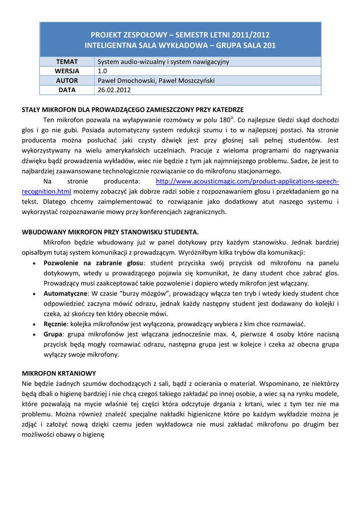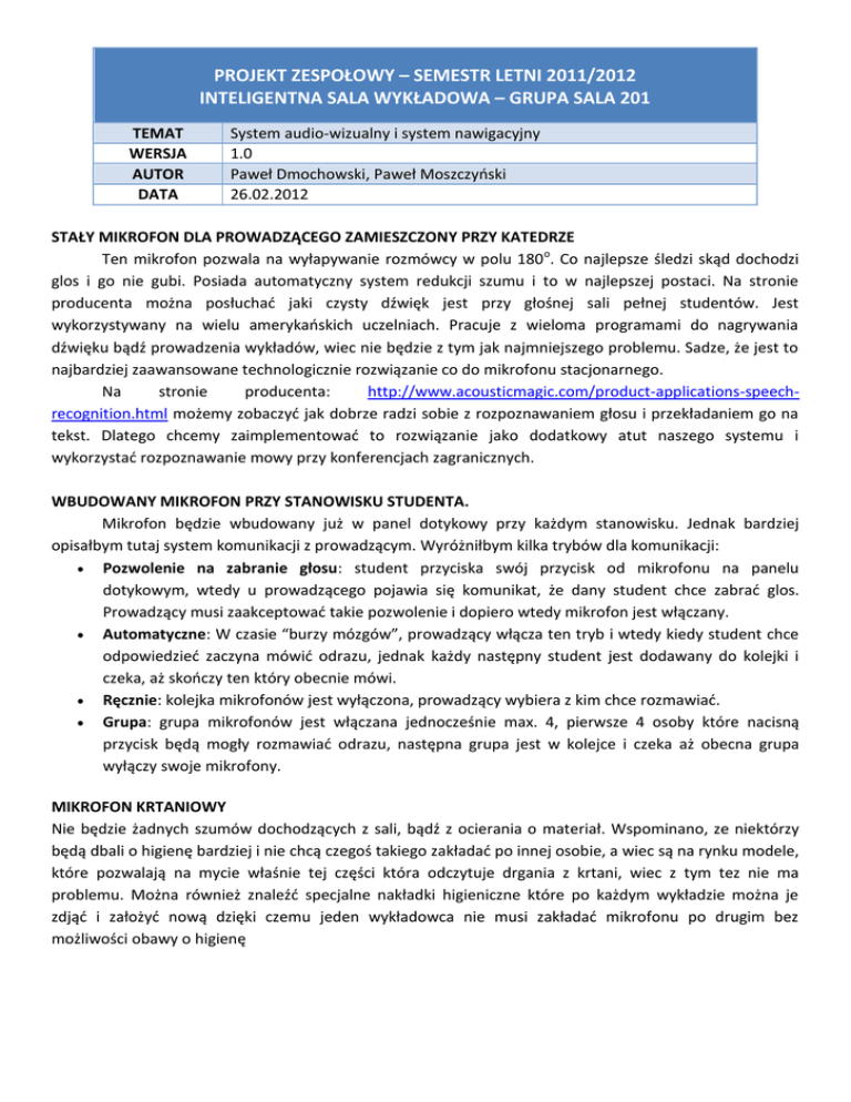 PROJEKT ZESPOŁOWY – SEMESTR LETNI 2011/2012 INTELIGENTNA SALA WYKŁADOWA – GRUPA SALA 201 TEMAT WERSJA AUTOR DATA System audio-wizualny i system nawigacyjny 1.0 Paweł Dmochowski, Paweł Moszczyoski 26.02.2012 STAŁY MIKROFON DLA PROWADZĄCEGO ZAMIESZCZONY PRZY KATEDRZE Ten mikrofon pozwala na wyłapywanie rozmówcy w polu 180 o. Co najlepsze śledzi skąd dochodzi glos i go nie gubi. Posiada automatyczny system redukcji szumu i to w najlepszej postaci. Na stronie producenta można posłuchad jaki czysty dźwięk jest przy głośnej sali pełnej studentów. Jest wykorzystywany na wielu amerykaoskich uczelniach. Pracuje z wieloma programami do nagrywania dźwięku bądź prowadzenia wykładów, wiec nie będzie z tym jak najmniejszego problemu. Sadze, że jest to najbardziej zaawansowane technologicznie rozwiązanie co do mikrofonu stacjonarnego. Na stronie producenta: http://www.acousticmagic.com/product-applications-speechrecognition.html możemy zobaczyd jak dobrze radzi sobie z rozpoznawaniem głosu i przekładaniem go na tekst. Dlatego chcemy zaimplementowad to rozwiązanie jako dodatkowy atut naszego systemu i wykorzystad rozpoznawanie mowy przy konferencjach zagranicznych. WBUDOWANY MIKROFON PRZY STANOWISKU STUDENTA. Mikrofon będzie wbudowany już w panel dotykowy przy każdym stanowisku. Jednak bardziej opisałbym tutaj system komunikacji z prowadzącym. Wyróżniłbym kilka trybów dla komunikacji: Pozwolenie na zabranie głosu: student przyciska swój przycisk od mikrofonu na panelu dotykowym, wtedy u prowadzącego pojawia się komunikat, że dany student chce zabrad glos. Prowadzący musi zaakceptowad takie pozwolenie i dopiero wtedy mikrofon jest włączany. Automatyczne: W czasie “burzy mózgów”, prowadzący włącza ten tryb i wtedy kiedy student chce odpowiedzied zaczyna mówid odrazu, jednak każdy następny student jest dodawany do kolejki i czeka, aż skooczy ten który obecnie mówi. Ręcznie: kolejka mikrofonów jest wyłączona, prowadzący wybiera z kim chce rozmawiad. Grupa: grupa mikrofonów jest włączana jednocześnie max. 4, pierwsze 4 osoby które nacisną przycisk będą mogły rozmawiad odrazu, następna grupa jest w kolejce i czeka aż obecna grupa wyłączy swoje mikrofony. MIKROFON KRTANIOWY Nie będzie żadnych szumów dochodzących z sali, bądź z ocierania o materiał. Wspominano, ze niektórzy będą dbali o higienę bardziej i nie chcą czegoś takiego zakładad po innej osobie, a wiec są na rynku modele, które pozwalają na mycie właśnie tej części która odczytuje drgania z krtani, wiec z tym tez nie ma problemu. Można również znaleźd specjalne nakładki higieniczne które po każdym wykładzie można je zdjąd i założyd nową dzięki czemu jeden wykładowca nie musi zakładad mikrofonu po drugim bez możliwości obawy o higienę SYSTEM NAWIGACYJNY Sterowanie wszystkimi systemami dostępnymi na sali z panelu prowadzącego Wizualizacja stanu wszystkich czujników i odczytów na Sali Najbardziej zaawansowany system jaki znalazłem, ma trochę zastosowao na które wpadliśmy: Dwie możliwości startu: Rozpoczęcie prezentacji Po naciśnięciu przycisku, opuszcza się ekran dla projektora Następuje uruchomienie projektora Poziomy głosu oraz mikrofony się kalibrują Uruchamiane są panele dotykowe które wyświetlają już pierwszy slajd z wykładu Rozpoczęcie wideo konferencji Uruchamiany jest system dla wideo konferencji Wybór źródła obrazu: Możliwośd podłączenia komputera Obraz ze skanera Obraz z odtwarzacza Blu-Ray bądź DVD Wybór przesyłania obrazu (lewy/prawy ekran) Zarządzanie mikrofonami Zarządzanie oświetleniem Skanowanie legitymacji Zarządzanie klimatyzacją i ogrzewaniem PANEL DOTYKOWY Hitachi T-19WX 19-calowy ekran LCD; Rozdzielczośd WXGA+ (1440 x 900) dla doskonałego przedstawiania kolorów i szczegółów; Płaski ekran zapewnia intuicyjną i dokładną obsługę; Rozpoznawanie pisma ręcznego; Szeroki wybór atramentów do pisania; Wyjście sygnału pozwala na komfortowe podłączenie projektora multimedialnego lub dalszych ekranów; Pióro bezprzewodowe; Import plików Microsoft Office; Eksport notatek do różnych formatów plików; Listwa funkcyjna z ikonami pozwala na szybką zmianę pomiędzy uruchomionymi aplikacjami; Umożliwia szybkie odtwarzanie materiałów multimedialnych i wprowadzanie notatek i spostrzeżeo do prezentowanych materiałów; Możliwośd pełnej integracji z inteligentną tablicą za pomocą oprogramowania StarBoard 9.0. TABLICA INTERAKTYWNA HITACHI FX DUO Główne zalety: Intensywna eksploatacja dzięki wytrzymałej powierzchni gwarantującej długą żywotnośd urządzenia; Możliwośd pisania palcem oraz piórem interaktywnym; Możliwośd równoczesnej pracy dwóch osób; Guziki skrótowe umieszczone po obu stronach tablicy; Specjalna antyodblaskowa powierzchnia tablicy idealna do projekcji; Oprogramowanie starboard zawierające ponad 5000 clipartów, a także plików flash; Oprogramowanie starboard umożliwia również pełna integrację z innymi urządzeniami multimedialnymi jak np. Panel dotykowy; Bezpłatna aktualizacja oprogramowania; Rozpoznawanie pisma, w tym polskie znaki fonetyczne. Do tablicy interaktywnej możemy również dodad przenośny panel Hitachi WT-1 dla prowadzącego dzięki któremu, prowadzący będzie mógł pisad na tablicy interaktywnej nie zasłaniając przy tym studentom. Główne zalety: import plików Microsoft Office; rozpoznawanie pisma ręcznego; eksport notatek do różnych formatów plików; dodatkowe materiały dla nauczyciela; pełna integracja z tablicą oraz panelami dotykowymi za pomocą oprogramowania StarBoard. PROJEKTOR MULTIMEDIALNY Projektor multimedialny który wybraliśmy to ProjectionDesign (model F32 1080p), jest to obecnie jeden z najlepszych projektorów który jest dostępny na rynku, projektory tej firmy są używane chociażby w toruoskim planetarium. Główne zalety: Wyświetlanie obrazu w jakości Full HD (1920x