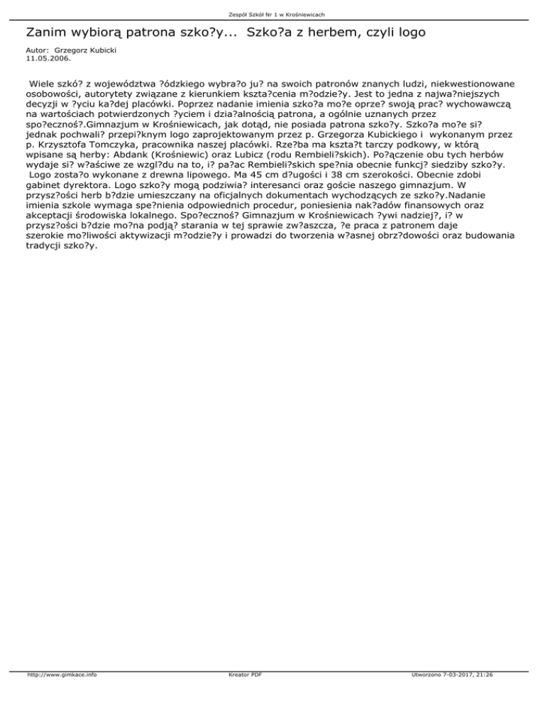Zespół Szkół Nr 1 w Krośniewicach Zanim wybiorą patrona szko?y... Szko?a z herbem, czyli logo Autor: Grzegorz Kubicki 11.05.2006. Wiele szkó? z województwa ?ódzkiego wybra?o ju? na swoich patronów znanych ludzi, niekwestionowane osobowości, autorytety związane z kierunkiem kszta?cenia m?odzie?y. Jest to jedna z najwa?niejszych decyzji w ?yciu ka?dej placówki. Poprzez nadanie imienia szko?a mo?e oprze? swoją prac? wychowawczą na wartościach potwierdzonych ?yciem i dzia?alnością patrona, a ogólnie uznanych przez spo?ecznoś?.Gimnazjum w Krośniewicach, jak dotąd, nie posiada patrona szko?y. Szko?a mo?e si? jednak pochwali? przepi?knym logo zaprojektowanym przez p. Grzegorza Kubickiego i wykonanym przez p. Krzysztofa Tomczyka, pracownika naszej placówki. Rze?ba ma kszta?t tarczy podkowy, w którą wpisane są herby: Abdank (Krośniewic) oraz Lubicz (rodu Rembieli?skich). Po?ączenie obu tych herbów wydaje si? w?aściwe ze wzgl?du na to, i? pa?ac Rembieli?skich spe?nia obecnie funkcj? siedziby szko?y. Logo zosta?o wykonane z drewna lipowego. Ma 45 cm d?ugości i 38 cm szerokości. Obecnie zdobi gabinet dyrektora. Logo szko?y mogą podziwia? interesanci oraz goście naszego gimnazjum. W przysz?ości herb b?dzie umieszczany na oficjalnych dokumentach wychodzących ze szko?y.Nadanie imienia szkole wymaga spe?nienia odpowiednich procedur, poniesienia nak?adów finansowych oraz akceptacji środowiska lokalnego. Spo?ecznoś? Gimnazjum w Krośniewicach ?ywi nadziej?, i? w przysz?ości b?dzie mo?na podją? starania w tej sprawie zw?aszcza, ?e praca z patronem daje szerokie mo?liwości aktywizacji m?odzie?y i prowadzi do tworzenia w?asnej obrz?dowości oraz budowania tradycji szko?y. http://www.gimkace.info Kreator PDF Utworzono 7-03-2017, 21:26