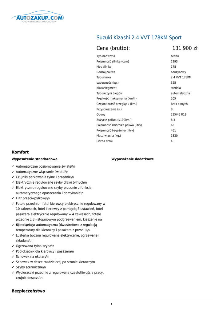 Suzuki Kizashi 2.4 VVT 178KM Sport Cena (brutto): 131 900 zł Typ nadwozia sedan Pojemność silnika (ccm) 2393 Moc silnika 178 Rodzaj paliwa benzynowy Typ silnika 2.4 VVT 178KM Ładowność (kg.) 525 Klasa/segment średnia Typ skrzyni biegów automatyczna Prędkość maksymalna (km/h) 205 Częstotliwość przeglądu (km.) Brak danych Przyspieszenie (s.) 8 Opony 235/45 R18 Zużycie paliwa (l/100km.) 8.3 Pojemność zbiornika paliwa (litry) 63 Pojemność bagażnika (litry) 461 Masa własna (kg.) 1530 Liczba drzwi 4 Komfort Wyposażenie standardowe Wyposażenie dodatkowe ✓ Automatyczne poziomowanie świateł\n ✓ Automatyczne włączanie świateł\n ✓ Czujniki parkowania tylne i przednie\n ✓ Elektrycznie regulowane szyby drzwi tylnych\n ✓ Elektrycznie regulowane szyby przednie z funkcją automatycznego opuszczania i domykania\n ✓ Filtr przeciwpyłkowy\n ✓ Fotele przednie - fotel kierowcy elektrycznie regulowany w 10 zakresach, fotel kierowcy z pamięcią 3 ustawień, fotel pasażera elektrycznie regulowany w 4 zakresach, fotele przednie z 3 - stopniowym podgrzewaniem, kieszenie na ✓ Klimatyzacja oparciach\n automatyczna (dwustrefowa z regulacją temperatury dla kierowcy i pasażera z przodu)\n ✓ Lusterka boczne regulowane elektrycznie, ogrzewane i składane\n ✓ Ogrzewana tylna szyba\n ✓ Podłokietnik dla kierowcy i pasażera\n ✓ Schowek na okulary\n ✓ Schowek w desce rozdzielczej po stronie kierowcy\n ✓ Szyby atermiczne\n ✓ Wycieraczki przednie z regulowaną częstotliwością pracy, czujnik deszczu\n Bezpieczeństwo 1 Wyposażenie standardowe Wyposażenie dodatkowe ✓ ABS + EBD\n ✓ Boczne poduszki powietrzne SRS (dla kierowcy i pasażera z przodu)\n ✓ Czołowe poduszki powietrzne SRS\n ✓ ESP\n ✓ Kontrolka niezapiętych pasów kierowcy i pasażera\n ✓ Kurtynowe poduszki powietrzne\n ✓ Ochrona nóg kierowcy - bezpieczny pedał hamulca i sprzęgła (zapadający się w przypadku zderzenia czołowego)\n ✓ Pasy bezpieczeństwa - 3 - punktowe pasy ELR: z przodu x 2, z tyłu x 3, napinacze przednich pasów bezpieczeństwa z ogranicznikiem siły napinającej i regulacją wysokości ✓ Poduszka mocowania\n powietrzna kolanowa dla kierowcy\n ✓ Reflektory ksenonowe typu HID\n ✓ Sportowy zderzak przedni + chromowane nakładki świateł przeciwmgłowych\n ✓ Światła przeciwmgielne przednie i tylne\n ✓ System ryglowania zamków\n ✓ Wspomaganie hamowania awaryjnego BAS\n ✓ Wyłącznik przedniej poduszki powietrznej pasażera\n ✓ Zabezpieczenia otwarcia tylnych drzwi przez dzieci\n ✓ Zamek centralny\n Dodatki Wyposażenie standardowe Wyposażenie dodatkowe ✓ 3 - ramienne koło kierownicy ✕ Lakier metalizowany 2500 PLN ✓ Alarm otwartych drzwi (kontrolka)\n ✓ Alarm poziomu paliwa (kontrolka)\n ✓ Alarm włączonych świateł (sygnał dźwiękowy)\n ✓ Dodatkowe światło stop\n ✓ Dźwignie zmiany biegów i hamulca ręcznego obszyte skórą\n ✓ Elektrochromatyczne lusterko wewnętrzne\n ✓ Gniazda 12 V: z przodu, z tyłu, w bagażniku\n ✓ Głośniki szerokopasmowe x 4 (w drzwiach przednich / tylnych), głośniki wysoko tonowe x 2, subwoofer w tylnej półce x 1, głośnik centralny w desce rozdzielczej x 1, radioodtwarzacz CD/ MP3, system bezprzewodowej komunikacji pokładowej Bluetooth(R)\n ✓ Hill Holder (sterowany elektronicznie)\n ✓ Immobiliser\n ✓ Lampki do czytania z przodu i z tyłu\n ✓ Lusterka boczne w kolorze nadwozia\n ✓ Okno dachowe otwierane elektrycznie\n ✓ Osłony progowe + chromowane listwy drzwiowe\n ✓ Osłony przeciwsłoneczne z podświetlanym lusterkiem\n ✓ 2 Podwójna końcówka rury wydechowej\n 3 ✓ Przyciemniana szyba tylna i tylne szyby boczne\n ✓ Spojler na pokrywie bagażnika\n ✓ Sportowe pokryte skórą, przyciski sterowania systemem audio, przyciski sterowania komputerem pokładowym, przyciski sterowania tempomatem, przyciski sterowania systemem obsługi telefonu (zestaw głośnomówiący)\n ✓ Spryskiwacze reflektorów\n ✓ System mocowania fotelika dla dziecka Isofix na bocznych miejscach w drugim rzędzie\n ✓ Tapicerka skórzana\n ✓ Tylne nawiewy wentylacyjne\n ✓ Uchwyt do mocowania bagażu\n ✓ Uchwyty na napoje z przodu i z tyłu\n ✓ Wejście USB\n ✓ Wieszaki na tylnej części oparć\n ✓ Wyświetlacz wielofunkcyjny zintegrowany z zestawem wskaźników, zegar cyfrowy, temperatura zewnętrzna, zużycie paliwa (chwilowe / przeciętne), zasięg jazdy, średnia ✓ Zdalne prędkość\n sterowanie zamkiem centralnym (funkcja potwierdzenia sygnałem świetlnym, funkcja otwierania ✓ Zestaw bagażnika)\n naprawczy do kół\n Doprecyzowanie oferty Kontakt: Nazwa użytkownika: admin Nazwa firmy: qqq Adres: qqq 12, 41-706 qqq1, NIP: 954 REGON: 1 Telefon: 123, 1 Fax: 1 Email: 1 www: 4