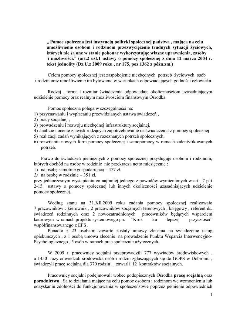 „ Pomoc społeczna jest instytucją polityki społecznej państwa , mającą na celu umożliwienie osobom i rodzinom przezwyciężenie trudnych sytuacji życiowych, których nie są one w stanie pokonać wykorzystując własne uprawnienia, zasoby i możliwości.” (art.2 ust.1 ustawy o pomocy społecznej z dnia 12 marca 2004 r. tekst jednolity (Dz.U.z 2009 roku , nr 175, poz.1362 z późn.zm.) Celem pomocy społecznej jest zaspokojenie niezbędnych potrzeb życiowych osób i rodzin oraz umożliwienie im bytowania w warunkach odpowiadających godności człowieka. Rodzaj , forma i rozmiar świadczenia odpowiadają okolicznościom uzasadniającym udzielenie pomocy oraz realnym możliwościom finansowym Ośrodka. 1) 2) 3) 4) 5) 6) Pomoc społeczna polega w szczególności na: przyznawaniu i wypłacaniu przewidzianych ustawa świadczeń , pracy socjalnej , prowadzeniu i rozwoju niezbędnej infrastruktury socjalnej, analizie i ocenie zjawisk rodzących zapotrzebowanie na świadczenia z pomocy społecznej realizacji zadań wynikających z rozeznanych potrzeb społecznych, rozwijaniu nowych form pomocy społecznej i samopomocy w ramach zidentyfikowanych potrzeb. Prawo do świadczeń pieniężnych z pomocy społecznej przysługuje osobom i rodzinom, których dochód na osobę w rodzinie nie przekracza netto miesięcznie : 1) na osobę samotnie gospodarującą – 477 zł, 2) na osobę w rodzinie – 351 zł, przy jednoczesnym wystąpieniu co najmniej jednego z powodów wymienionych w art. 7 pkt 2-15 ustawy o pomocy społecznej lub innych okoliczności uzasadniających udzielenie pomocy społecznej. Według stanu na 31.XII.2009 roku zadania pomocy społecznej realizowało 7 pracowników : kierownik , 2 pracowników socjalnych terenowych , księgowy , referent ds. świadczeń rodzinnych oraz 2 nowozatrudnionych pracowników będących wsparciem kadrowym w ramach projektu systemowego pn. ”Krok ku lepszej przyszłości” współfinansowanego z EFS . Ponadto z 23 osobami zawarte zostały umowy zlecenia na świadczenie usług opiekuńczych , z 1 osobą umowa zlecenie na prowadzenie Punktu Wsparcia InterwencyjnoPsychologicznego , 5 osób w ramach prac społecznie użytecznych. W 2009 r. pracownicy socjalni przeprowadzili 777 wywiadów środowiskowych , a 1450 razy odwiedzali środowiska osób i rodzin zgłaszających się do GOPS w Dobroniu , świadczyli pracę socjalną dla 370 rodzin , zawarli 12 kontraktów socjalnych. Pracownicy socjalni podejmowali wobec podopiecznych Ośrodka pracę socjalną oraz poradnictwo . Są to działania mające na celu pomoc osobom i rodzinom we wzmocnieniu lub odzyskaniu zdolności do funkcjonowania w społeczeństwie poprzez pełnienie odpowiednich 1 rół społecznych oraz tworzenie warunków sprzyjających temu celowi. Praca socjalna podejmowna jest praktycznie podczas każdego bezpośredniego kontaktu pracowników socjalnych z podopiecznymi , zarówno w środowisku domowym , jak i w siedzibie Ośrodka . W 2008 r. objęto pomocą i wsparciem 362 rodziny , a w 2009 roku 370 rodzin wobec których praca socjalna podejmowana była co najmniej raz . Najczęściej jednak następują kilkakrotne spotkania z osobami zwracającymi się o pomoc i z członkami ich rodzin. Wydano w zakresie pomocy społecznej 501 decyzji administracyjnych, w tym decyzji odmownych 16, od wydanych decyzji nie złożono żadnego odwołania do SKO w Łodzi . Łącznie ze świadczeń w ramach zadań własnych i zleconych w 2008 i w 2009 roku skorzystało : 2008 r. 167 rodzin, liczba osób w rodzinie 524, liczba osób którym przyznano decyzją świadczenie – 324 . 2009 r. 156 rodzin liczba osób w rodzinie 441 liczba osób którym decyzją przyznano świadczenie – 278 . W Gminie Dobroń według danych z Urzędu Gminy w Dobroniu na 31.XII.2009 r. mieszkało 6.944 osób , spośród nich system pomocy społecznej objął wsparciem 441 osób w rodzinach . Analizując te dane , 6,35 % mieszkańców zostało objętych pomocą w stosunku do ogółu mieszkańców gminy. Na 31 grudnia 2009r. w gminie Dobroń było ogółem 317 osób bezrobotnych zarejestrowanych w Powiatowym Urzędzie Pracy w Pabianicach, z tego 150 kobiet, 167 mężczyzn, co stnowi 4,56 % osób bezrobotnych w stosunku do ogółu mieszkańców gminy. Stopa bezrobocia na 31 grudnia 2009r. w Polsce wynosiła 11,9 % , w woj. łódzkim 11,6%, w powiecie pabianickim 13,2 % , w gminie Dobroń 7 %. Głównym powodem przyznania pomocy biorąc pod uwagę trudną sytuację życiową podopiecznych było 2008 r. i w 2009 r.: 2008 r. ubóstwo - 75 rodzin, sieroctwo - 33 rodziny, bezdomność - 1 rodzina , bezradność w sprawach opiekuńczo-wychowawczych – 69 rodzin w tym : rodziny niepełne - 10 rodzin, rodziny wielodzietne - 12 rodzin, niepełnosprawność bezrobocie alkoholizm - 71 rodzin, - 52 rodziny, - 43 rodziny, 2009 r. 64 rodziny 28 rodzin 0 50 rodzin 10 rodzin 6 rodzin 72 rodziny 45 rodzin 43 rodziny 2 trudności w przystosowaniu do życia po opuszczeniu zakładu karnego - 1 rodzina zdarzenia losowe - 2 rodziny sytuacja kryzysowa - 18 rodzin 1 rodzina 0 30 rodzin Gminny Ośrodek Pomocy Społecznej w Dobroniu realizuje od 2006 roku formę pomocy niefinansowej , jest to wydawanie żywności w ramach Programu PEAD (Dostarczanie Żywności dla Najuboższej Ludności Unii Europejskiej), w 2008 roku skorzystały 64 rodziny ( 173 osoby ), wydano 8.000 kg żywności (mąka, cukier, ryż , kasza, makaron , mleko, sery żółte i topione, płatki owsiane, płatki kukurydziane,konserwy,dżemy). W 2009 roku skorzystały 74 rodziny ( 175 osób), wydano 11.213 kg żywności , asortyment ubiegłoroczny został wzbogacony dodatkowo o następujące produkty: masło, musli,mleko w proszku dla małych dzieci , kawa zbożowa, herbatniki, wyroby gotowe (zupa krupnik , gulasz z kaszą). Podstawą gospodarki finansowej Ośrodka stanowi plan finansowy opracowany na każdy rok finansowy. Plan budżetu w roku 2009 w dziale 852- pomoc społeczna – wynosił 2
