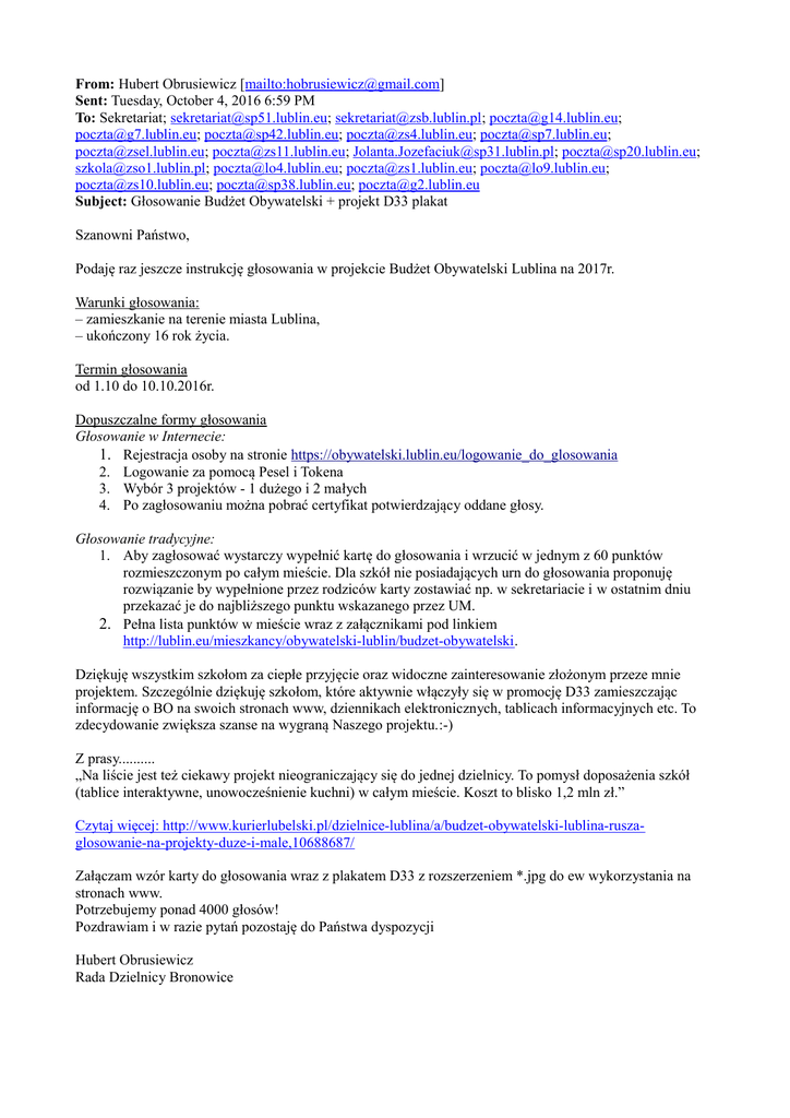 From: Hubert Obrusiewicz [mailto:[email protected]] Sent: Tuesday, October 4, 2016 6:59 PM To: Sekretariat; [email protected]; [email protected]; [email protected]; [email protected]; [email protected]; [email protected]; [email protected]; [email protected]; [email protected]; [email protected]; [email protected]; [email protected]; [email protected]; [email protected]; [email protected]; [email protected]; [email protected]; [email protected] Subject: Głosowanie Budżet Obywatelski + projekt D33 plakat Szanowni Państwo, Podaję raz jeszcze instrukcję głosowania w projekcie Budżet Obywatelski Lublina na 2017r. Warunki głosowania: – zamieszkanie na terenie miasta Lublina, – ukończony 16 rok życia. Termin głosowania od 1.10 do 10.10.2016r. Dopuszczalne formy głosowania Głosowanie w Internecie: 1. Rejestracja osoby na stronie https://obywatelski.lublin.eu/logowanie_do_glosowania 2. Logowanie za pomocą Pesel i Tokena 3. Wybór 3 projektów - 1 dużego i 2 małych 4. Po zagłosowaniu można pobrać certyfikat potwierdzający oddane głosy. Głosowanie tradycyjne: 1. Aby zagłosować wystarczy wypełnić kartę do głosowania i wrzucić w jednym z 60 punktów rozmieszczonym po całym mieście. Dla szkół nie posiadających urn do głosowania proponuję rozwiązanie by wypełnione przez rodziców karty zostawiać np. w sekretariacie i w ostatnim dniu przekazać je do najbliższego punktu wskazanego przez UM. 2. Pełna lista punktów w mieście wraz z załącznikami pod linkiem http://lublin.eu/mieszkancy/obywatelski-lublin/budzet-obywatelski. Dziękuję wszystkim szkołom za ciepłe przyjęcie oraz widoczne zainteresowanie złożonym przeze mnie projektem. Szczególnie dziękuję szkołom, które aktywnie włączyły się w promocję D33 zamieszczając informację o BO na swoich stronach www, dziennikach elektronicznych, tablicach informacyjnych etc. To zdecydowanie zwiększa szanse na wygraną Naszego projektu.:-) Z prasy.......... „Na liście jest też ciekawy projekt nieograniczający się do jednej dzielnicy. To pomysł doposażenia szkół (tablice interaktywne, unowocześnienie kuchni) w całym mieście. Koszt to blisko 1,2 mln zł.” Czytaj więcej: http://www.kurierlubelski.pl/dzielnice-lublina/a/budzet-obywatelski-lublina-ruszaglosowanie-na-projekty-duze-i-male,10688687/ Załączam wzór karty do głosowania wraz z plakatem D33 z rozszerzeniem *.jpg do ew wykorzystania na stronach www. Potrzebujemy ponad 4000 głosów! Pozdrawiam i w razie pytań pozostaję do Państwa dyspozycji Hubert Obrusiewicz Rada Dzielnicy Bronowice