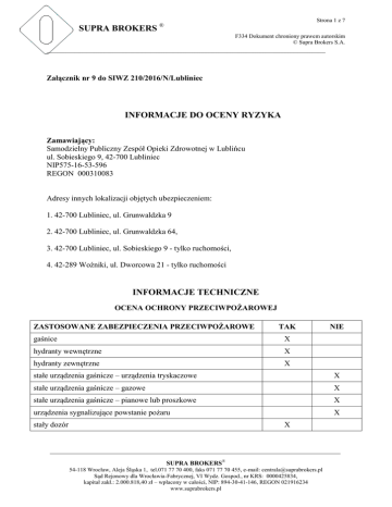 Strona 1 z 7 SUPRA BROKERS ® F334 Dokument chroniony prawem autorskim © Supra Brokers S.A. _____________________________________________________________________________ Załącznik nr 9 do SIWZ 210/2016/N/Lubliniec INFORMACJE DO OCENY RYZYKA Zamawiający: Samodzielny Publiczny Zespół Opieki Zdrowotnej w Lublińcu ul. Sobieskiego 9, 42-700 Lubliniec NIP575-16-53-596 REGON 000310083 Adresy innych lokalizacji objętych ubezpieczeniem: 1. 42-700 Lubliniec, ul. Grunwaldzka 9 2. 42-700 Lubliniec, ul. Grunwaldzka 64, 3. 42-700 Lubliniec, ul. Sobieskiego 9 - tylko ruchomości, 4. 42-289 Woźniki, ul. Dworcowa 21 - tylko ruchomości INFORMACJE TECHNICZNE OCENA OCHRONY PRZECIWPOŻAROWEJ ZASTOSOWANE ZABEZPIECZENIA PRZECIWPOŻAROWE TAK gaśnice X hydranty wewnętrzne X hydranty zewnętrzne X NIE stałe urządzenia gaśnicze – urządzenia tryskaczowe X stałe urządzenia gaśnicze – gazowe X stałe urządzenia gaśnicze – pianowe lub proszkowe X urządzenia sygnalizujące powstanie pożaru X stały dozór X SUPRA BROKERS® 54-118 Wrocław, Aleja Śląska 1, tel.071 77 70 400, faks 071 77 70 455, e-mail: [email protected] Sąd Rejonowy dla Wrocławia-Fabrycznej, VI Wydz. Gospod., nr KRS: 0000425834, kapitał zakł.: 2.000.818,40 zł – wpłacony w całości, NIP: 894-30-41-146, REGON 021916234 www.suprabrokers.pl Strona 2 z 7 SUPRA BROKERS ® F334 Dokument chroniony prawem autorskim © Supra Brokers S.A. _____________________________________________________________________________ OCENA BUDYNKÓW I BUDOWLI TAK XLubliniec, ul. Grunwaldzka 9 X Lubliniec ul. Grunwaldzka 64 X Budynki stoją w zabudowie zwartej Budynki stoją na posesji ogrodzonej Posesja jest oświetlona NIE XLubliniec, ul. Grunwaldzka 64, XLubliniec, ul. Grunwaldzka 9, Konstrukcja budynków: materiały palne X materiały niepalne X materiały mieszane Budynki są wykonane z płyt warstwowych z palnym wypełnieniem np. styropianem lub pianką poliuretanową. Ściany działowe wykonane są z: X X materiałów palnych X materiałów palnych zabezpieczonych ognioodpornie X materiałów niepalnych X Wystrój wnętrz budynków wykonany jest z materiałów: materiałów palnych X materiałów palnych zabezpieczonych ognioodpornie X materiałów niepalnych X Ogniomury X Obiekty posiadają wymaganą i sprawną instalację odgromową Istnieją centralne wyłączniki prądu odcinające dopływ energii do wszystkich urządzeń Rodzaj istniejącej instalacji grzewczej: X ogrzewanie wodne X X ogrzewanie wodno-parowe X ogrzewanie elektryczne X SUPRA BROKERS® 54-118 Wrocław, Aleja Śląska 1, tel.071 77 70 400, faks 071 77 70 455, e-mail: [email protected] Sąd Rejonowy dla Wrocławia-Fabrycznej, VI Wydz. Gospod., nr KRS: 0000425834, kapitał zakł.: 2.000.818,40 zł – wpłacony w całości, NIP: 894-30-41-146, REGON 021916234 www.suprabrokers.pl Strona 3 z 7 SUPRA BROKERS ® F334 Dokument chroniony prawem autorskim © Supra Brokers S.A. _____________________________________________________________________________ OCENA OCHRONY PRZECIWPOŻAROWEJ TAK Odległość od najbliższej jednostki straży pożarnej 2 km Czas dojazdu jednostek straży pożarnej 5 min Istnieje możliwość dojazdu jednostek straży pożarnej o każdej porze roku NIE X Oznakowane są: drogi pożarowe X drogi i wyjścia ewakuacyjne X lokalizacje sprzętu ppoż. Budynki są wyposażone w sprzęt ratowniczo-gaśniczy zgodnie z wymaganiami Instrukcja bezpieczeństwa pożarowego Pracownicy przechodzą szkolenie na wypadek pożaru i prowadzenia akcji gaśniczej Na terenie zakładu istnieje zakaz palenia X Zatrudniony jest specjalista z zakresu ochrony ppoż. X X X X X Istnieje zakładowa straż pożarna X Przeprowadzane są regularne kontrole z ramienia straży pożarnej X Prowadzi się kontrole sprzętu ratowniczo-gaśniczego X Na terenie zakładu znajdują się zbiorniki z wodą Woda do gaszenia pożaru dostarczana jest przy użyciu pomp Źródła dostarczenia wody X X Hydranty zewnętrzne INFORMACJE DODATKOWE 1 2 3 4 Wykazane w arkuszu technicznym lokalizacje znajdują się na terenie zalewowym Na terenie wymienionych w arkuszu technicznym lokalizacji począwszy od 1997 r. wystąpiła powódź W odniesieniu do obiektów posiadających w swej konstrukcji elementy drewniane – instalacja elektryczna prowadzona jest w niepalnych peszlach W odniesieniu do obiektów zawierających w konstrukcji elementy drewniane TAK NIE X X X X SUPRA BROKERS® 54-118 Wrocław, Aleja Śląska 1, tel.071 77 70 400, faks 071 77 70 455, e-mail: [email protected] Sąd Rejonowy dla Wrocławia-Fabrycznej, VI Wydz. Gospod., nr KRS: 0000425834, kapitał zakł.: 2.000.818,40 zł – wpłacony w całości, NIP: 894-30-41-146, REGON 021916234 www.suprabrokers.pl Strona 4 z 7 SUPRA BROKERS ® F334 Dokument chroniony prawem autorskim © Supra Brokers S.A. _____________________________________________________________________________ 5 6 7 8 – elementy te zostały zaimpregnowane ognioochronnie (impregnacja wykonana przez wyspecjalizowane firmy posiadające odpowiednie certyfikaty) Mienie będące przedmiotem ubezpieczenia lub pozostające w związku z ubezpieczeniem odpowiedzialności cywilnej jest zabezpieczone w sposób przewidziany obowiązującymi przepisami aktów prawnych w zakresie ochrony przeciwpożarowej, w szczególności: Ustawą z dnia 24.08.1991 r. o ochronie przeciwpożarowej (Dz.U. z 2016 r. poz. 191 z późn. zm.) Rozporządzeniem Ministra Infrastruktury z dnia 12.04.2002 r. w sprawie warunków technicznych, jakimi powinny odpowiadać budynki i ich usytuowanie (Dz.U. z 2015 r. poz. 1422) Rozporządzeniem Ministra Spraw Wewnętrznych i Administracji z dnia 7.06.2010 r. w sprawie ochrony przeciwpożarowej budynków, innych obiektów budowlanych i terenów (Dz.U z 2015 r. poz. 1422) Stanowiska pracy spełniają wymagania dotyczące bezpieczeństwa i higieny pracy w środowisku pracy, w szczególności zapisane w Rozporządzeniu Ministra Gospodarki z dnia 8.07.2010 r. w sprawie minimalnych w