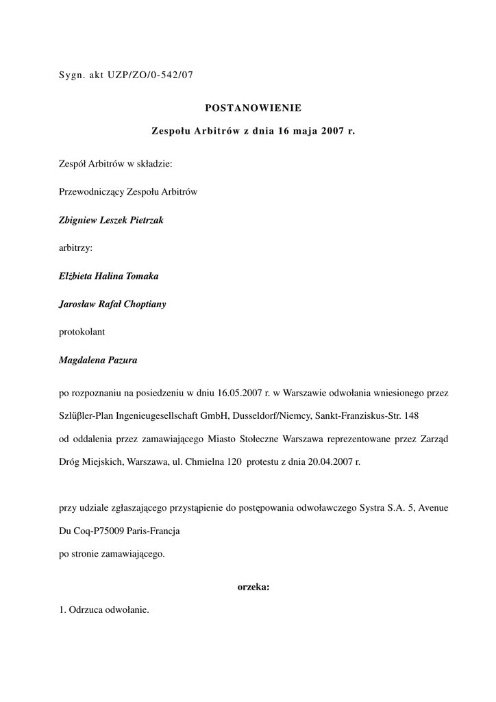 Sygn. akt UZP/ZO/0-542/07 POSTANOWIENIE Zespołu Arbitrów z dnia 16 maja 2007 r. Zespół Arbitrów w składzie: Przewodniczący Zespołu Arbitrów Zbigniew Leszek Pietrzak arbitrzy: Elżbieta Halina Tomaka Jarosław Rafał Choptiany protokolant Magdalena Pazura po rozpoznaniu na posiedzeniu w dniu 16.05.2007 r. w Warszawie odwołania wniesionego przez Szlűβler-Plan Ingenieugesellschaft GmbH, Dusseldorf/Niemcy, Sankt-Franziskus-Str. 148 od oddalenia przez zamawiającego Miasto Stołeczne Warszawa reprezentowane przez Zarząd Dróg Miejskich, Warszawa, ul. Chmielna 120 protestu z dnia 20.04.2007 r. przy udziale zgłaszającego przystąpienie do postępowania odwoławczego Systra S.A. 5, Avenue Du Coq-P75009 Paris-Francja po stronie zamawiającego. orzeka: 1. Odrzuca odwołanie. 2. Kosztami postępowania obciąża Szlűβler-Plan Ingenieugesellschaft GmbH, Dusseldorf/Niemcy, Sankt-Franziskus-Str. 148 i nakazuje: 1) zaliczyć na rzecz Urzędu Zamówień Publicznych koszty w wysokości 4638 zł 78 gr (słownie: cztery tysiące sześćset trzydzieści osiem złotych siedemdziesiąt osiem groszy) z kwoty wpisu uiszczonego przez Szlűβler-Plan Ingenieugesellschaft GmbH, Dusseldorf/Niemcy, Sankt-Franziskus-Str. 148 2) dokonać wpłaty kwoty 1000 zł 0 gr (słownie: jeden tysiąc złotych zero groszy) przez Szlűβler-Plan Ingenieugesellschaft GmbH, Dusseldorf/Niemcy, Sankt-Franziskus- Str. 148 na rzecz Miasta Stołecznego Warszawa reprezentowanego przez Zarząd Dróg Miejskich, Warszawa, ul. Chmielna 120 , stanowiącej uzasadnione koszty uczestnika postępowania odwoławczego poniesione z tytułu zastępstwa prawnego. 3) dokonać wpłaty kwoty 0 zł 0 gr (słownie: xxx) przez xxx na rzecz Urzędu Zamówień Publicznych na rachunek dochodów własnych UZP 4) dokonać zwrotu kwoty 15361 zł 22 gr (słownie: piętnaście tysięcy trzysta sześćdziesiąt jeden złotych dwadzieścia dwa grosze) z rachunku dochodów własnych Urzędu Zamówień Publicznych na rzecz Szlűβler-Plan Ingenieugesellschaft GmbH, Dusseldorf/Niemcy, Sankt-Franziskus-Str. 148 . 3. Uzasadnienie Zamawiający Miasto Stołeczne Warszawa reprezentowane przez Zarząd Dróg Miejskich w toku postępowania o udzielenie zamówienia publicznego prowadzonego w trybie przetargu ograniczonego na opracowanie Kompletnej Dokumentacji Projektowej dla Zadania: Budowa Trasy „Krasińskiego” na odc. Pl. Wilsona - ul. Budowlana wraz z Przeprawą Mostową i Torowiskiem Budowlanym dokonał oceny i wyboru najkorzystniejszej oferty Wykonawcy, Strona 2 z 6 Szlűβler-Plan. Czynność tę w drodze protestu z dnia 20.04.2007r. zaskarżył inny wykonawca SYSTRA z Francji, zarzucając Zamawiającemu, poprzez wybór tej oferty jako najkorzystniejszej, naruszenie przepisu art. 7, art. 89 ustawy Prawo zamówień publicznych, wskazując, że oferta Szlűβler-Plan nie powinna w ogóle być rozpatrywana i winna być odrzucona, jako że osoba podpisująca tę ofertę w imieniu firmy Szlűβler-Plan nie miała pełnomocnictwa do reprezentowania jej w tym przedmiotowym postępowaniu. Pełnomocnictwo to dotyczy zamówienia publicznego udzielanego przez Miasto Warszawa reprezentowane przez Zarząd Transportu Miejskiego, w imieniu którego i na rzecz którego, jako Zamawiającego, ma działać Metro Warszawskie Sp. z o.o. A ponieważ Zamawiającym jest Miasto Stołeczne Warszawa, w imieniu którego działa Zarząd Dróg Miejskich i w postępowaniu nie bierze udziału Metro Warszawskie Sp. z o.o., to należy stwierdzić, że owo pełnomocnictwo nie dotyczy tego postępowania o udzielenie zamówienie publicznego. Ponadto Wykonawca ten podał błędnie cenę oferty zawierający 22% podatek VAT, który nie dotyczy podmiotów nie mających siedziby w Polsce, jak też cena oferty jest rażąco niska. Do postępowania protestacyjnego po stronie Zamawiającego pismem z dnia 23.04.2007r. przystąpił Szlűβler-Plan w dniu 25.05.2007r., który wskazał, że przedstawione pełnomocnictwo jest prawidłowe, gdyż zostało udzielone Thomasowi Stein przez osoby umocowane do tego rodzaju czynności, odnosi się ono do tego postępowania, gdyż zawiera nr postępowania i nazwę zamówienia. Wskazał, że w cenie zawarty jest podatek VAT, gdyż po uzyskaniu zamówienia firma dokona rejestracji w Polsce, zaś wysokość ceny została bardzo dokładnie obliczona i jest wynikiem wieloletnich doświadczeń podczas prac projektowych. Pismem z dnia 27.04.2007r. Zamawiający uwzględnił protest w zakresie zarzutu braku należytego umocowania, zaś co do pozostałych zarzutów protest uznał za nieuzasadniony. W rozstrzygnięciu protestu Zamawiający wskazał, że w tym postępowaniu w jego imieniu działa Zarząd Dróg Miejskich, a nie Zarząd Transportu Miejskiego w imieniu którego działać ma Metro Warszawskie Sp. z o.o. Strona 3 z 6 Uwzględniając protest Zamawiający oświadczył, że powtórzy czynność badania ofert i wyboru najkorzystniejszej oferty. Pismem z dnia 2.05.2007r. firma Szlűβler-Plan złożyła od rozstrzygnięcia protestu odwołanie, w którym wniosła o unieważnienie czynności rozstrzygnięcia protestu i nakazanie Zamawiającemu dokonania czynności odrzucenia protestu firmy SYSTRA S.A. lub jego oddalenie w całości. W uzasadnieniu odwołania uzasadnił na swój interes prawny i jednocześnie wskazał, że przedmiotowe pełnomocnictwo zostało złożone do wniosku o dopuszczenie do udziału w postępowania prowadzonym w trybie przetargu ograniczonego. Żaden wykonawca nie zaskarżył czynności dopuszczenia do udziału w postępowaniu, ze względu na treść pełnomocnictwa, a więc termin do oprotestowania tego elementu już minął. Biorąc powyższe po uwagę, skoro na kolejnym etapie postępowania, gdzie pomiędzy złożeniem pełnomocnictwa (wystąpieniem ewentualnej podstawy do dokonania czynności wykluczenia Odwołującego się), a złożeniem protestu minął czas powyżej 7 dni i to niezależnie od tego czy pełnomocnictwo tożsamej treści z