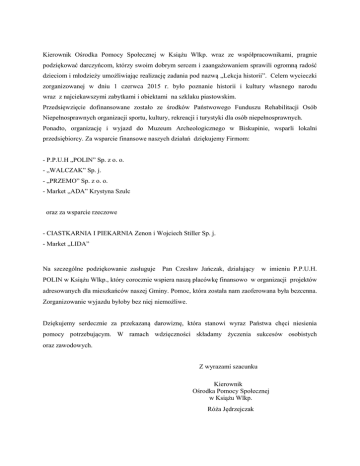 Kierownik Ośrodka Pomocy Społecznej w Książu Wlkp. wraz ze współpracownikami, pragnie podziękować darczyńcom, którzy swoim dobrym sercem i zaangażowaniem sprawili ogromną radość dzieciom i młodzieży umożliwiając realizację zadania pod nazwą „Lekcja historii”. Celem wycieczki zorganizowanej w dniu 1 czerwca 2015 r. było poznanie historii i kultury własnego narodu wraz z najciekawszymi zabytkami i obiektami na szklaku piastowskim. Przedsięwzięcie dofinansowane zostało ze środków Państwowego Funduszu Rehabilitacji Osób Niepełnosprawnych organizacji sportu, kultury, rekreacji i turystyki dla osób niepełnosprawnych. Ponadto, organizację i wyjazd do Muzeum Archeologicznego w Biskupinie, wsparli lokalni przedsiębiorcy. Za wsparcie finansowe naszych działań dziękujemy Firmom: - P.P.U.H „POLIN” Sp. z o. o. - „WALCZAK” Sp. j. - „PRZEMO” Sp. z o. o. - Market „ADA” Krystyna Szulc oraz za wsparcie rzeczowe - CIASTKARNIA I PIEKARNIA Zenon i Wojciech Stiller Sp. j. - Market „LIDA” Na szczególne podziękowanie zasługuje Pan Czesław Jańczak, działający w imieniu P.P.U.H. POLIN w Książu Wlkp., który corocznie wspiera naszą placówkę finansowo w organizacji projektów adresowanych dla mieszkańców naszej Gminy. Pomoc, która została nam zaoferowana była bezcenna. Zorganizowanie wyjazdu byłoby bez niej niemożliwe. Dziękujemy serdecznie za przekazaną darowiznę, która stanowi wyraz Państwa chęci niesienia pomocy potrzebującym. W ramach wdzięczności składamy życzenia sukcesów osobistych oraz zawodowych. Z wyrazami szacunku Kierownik Ośrodka Pomocy Społecznej w Książu Wlkp. Róża Jędrzejczak D