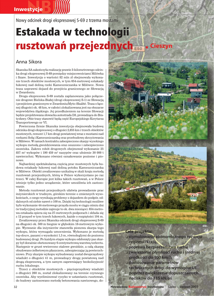 NBI N BII B Inwestycje Nowy odcinek drogi ekspresowej S-69 z trzema mostami Estakada w technologii rusztowań przejezdnych Anna Sikora Skanska SA zakończyła realizację prawie 3-kilometrowego odcinka drogi ekspresowej S-69 pomiędzy miejscowościami Milówka i Szare. Inwestycja o wartości 82 mln zł obejmowała wykonanie trzech obiektów mostowych, w tym 654-metrowej estakady łukowej nad doliną rzeki Kameszniczanka w Milówce. Nowa trasa usprawni dojazd do przejścia granicznego ze Słowacją w Zwardoniu. Droga ekspresowa S-69 została zaplanowana jako połączenie drogowe Bielska-Białej (drogi ekspresowej S-1) ze Słowacją i przejściem granicznym w Zwardoniu/Myto-Skalité. Trasa o łącznej długości ok. 48 km, w całości zlokalizowana jest na obszarze województwa śląskiego. Jej przedłużeniem na terenie Słowacji będzie projektowana słowacka autostrada D3, prowadząca do Bratysławy. Obie trasy stanowić będą część Europejskiego Korytarza Transportowego nr VI. Powierzona firmie Skanska inwestycja obejmowała budowę odcinka drogi ekspresowej o długości 2,855 km i trzech obiektów mostowych, remont 1,7 km drogi powiatowej wraz z mostami nad rzekami Sołą i Kameszniczanką oraz przebudowę skrzyżowania w Milówce. W ramach kontraktu zabezpieczono skarpy wysokiego wykopu metodą gwoździowania oraz osuszono i zabezpieczono osuwiska. Zakres robót drogowych obejmował wykonanie 25 857 m3 wykopów i 190 459 m3 nasypów oraz ułożenie 30 000 t nawierzchni. Wykonano również oznakowanie poziome i pionowe. Najbardziej spektakularną częścią prac mostowych była budowa estakady łukowej nad doliną potoku Kameszniczanka w Milówce. Obiekt zrealizowano unikalną w skali kraju metodą rusztowań przejezdnych, którą w Polsce wykorzystano po raz trzeci. W całej Europie jest kilka takich rusztowań, a w Polsce istnieje tylko jedno urządzenie, które umożliwia ich zastosowanie. Metoda rusztowań przejezdnych ułatwia prowadzenie prac inżynierskich w trudnym, górskim terenie o zmiennych wysokościach, z czego wynikają problemy z dojazdem do podpór, oddalonych od siebie nawet o 100 m. Dzięki tej technologii możliwe było wykonanie 44-metrowego przęsła mostu w ciągu ośmiu dni (w tradycyjnej metodzie zajmuje to ok. dwa miesiące). 654-metrowa estakada opiera się na 27-metrowych podporach i składa się z 12 przęseł w tym trzech łukowych, każde o rozpiętości 104 m. Zrealizowany przez Skanska odcinek drogi ekspresowej S-69 na długości ok. 500 m biegnie w głębokim 18-metrowym wykopie. Wyzwanie dla inżynierów stanowiła pionowa skarpa tego wykopu, która wymagała umocnienia. Wykonano je metodą top-down, pasami o wysokości 1,5 m, równoległymi do poziomu budowanej drogi. Po każdym etapie wykopu odsłonięty pas skarpy był doraźnie obetonowany 6-centymetrową warstwą torkretu. Następnie w grunt wwiercono stalowe gwoździe, a całą skarpę obudowano żelbetowym płaszczem, zabezpieczając ją powierzchniowo. Przy skarpie wykopu wybudowany został dwuprzęsłowy wiadukt o długości 41 m, prowadzący drogę powiatową nad drogą ekspresową, a tym samym zapewniający bezkolizyjność ruchu lokalnego. Trzeci z obiektów mostowych – pięcioprzęsłowy wiadukt o długości 260 m, został zlokalizowany na terenie czynnego osuwiska. Aby wyeliminować ryzyko w ustawianiu rusztowań, do budowy zastosowano metodę betonowania nawisowego, do- 32 Nowoczesne Budownictwo Inżynieryjne Lipiec – Sierpień 2007 33 można przemieścić rusztowania na wcześniej wykonany segment i rozpocząć prace nad kolejnymi. Dzięki inwestycji poprawi się bezpieczeństwo podróżnych oraz komfort jazdy, a poprzez zwiększenie średniej prędkości do 100 km/h zostanie skrócony czas dojazdu do południowej granicy Polski. Parametry techniczne drogi ekspresowej: ❑ kategoria ruchu: KR 5 (bardzo ciężki) ❑ nośność: 115 kn/oś ❑ prędkość projektowa drogi: 80 km/h ❑ szerokość jezdni: 10–10,5 m ❑ szerokość poboczy: 0,75–1,76 m tychczas zarezerwowaną wyłącznie dla przepraw mostowych nad takimi przeszkodami, jak rzeka. Dzięki tej nowoczesnej metodzie zaoszczędzono wiele czasu. W metodzie nawisowej najpierw powstaje zalążek mostu, tzw. segment startowy o długości 8 m, podparty dodatkową podporą tymczasową. Od niego, w obie strony równocześnie, buduje się most. Na segmencie startowym kotwi się pierwszy trawller z podwieszonym deskowaniem właściwych segmentów o długości 4,8 m. Drugi trawller montuje się z drugiej strony segmentu startowego i buduje segmenty w drugą stronę tak, aby obie strony równo obciążać i zachować równowagę konstrukcji o długości docelowej 82 m. Po zazbrojeniu, zabetonowaniu i sprężeniu każdego segmentu 34 Parametry estakady: ❑ kubatura betonowej konstrukcji: 12,4 tys. m3 ❑ zbrojenie stalowe: 1291,8 t ❑ masa stalowych kabli sprężających ustrój nośny: 212,7 t ❑ długość odcinka prostego: ok. 430 m ❑ długość odcinka w łuku : ok. 230 m ❑ promień zakrętu (między przyczółkiem żywieckim i czwartą podporą): 300 m ❑ liczba podpór (bez przyczółków): 11 ❑ liczba podpór wraz z przyczółkiem, które są posadowione bezpośrednio na ławach fundamentowych (licząc kolejno od strony Żywca): 7 ❑ liczba podpór wraz z przyczółkiem, które są posadowione na palach (od strony Zwardonia): 6 ❑ wysokość najniższej podpory: 7,2 m ❑ liczba słupków między ustrojem nośnym i podtrzymującymi go łukami: 12 ❑ rozpiętość każdego przęsła łukowego: 103,8 m ❑ liczba przęseł belkowych: 9 ❑ rozpiętość większości przęseł belkowych: 41 m ❑ rozpiętość najkrótszych przęseł belkowych (przy przyczółkach): 32 m ❑ szerokość całkowita obiektu: 12,9 m ❑ różnica wysokości między przyczółkami:12,4 m ❑ maksymalny spadek podłużny (tylko na przęśle przy przyczółku zwardońskim): 7,5% ❑ pochylenie poprzeczne jezdni na łuku: 7% ❑ poch