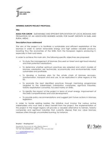 INTERREG EUROPE PROJECT PROPOSAL Title MASS-FOR-GROW - SUSTAINABLE AND EFFICIENT EXPLOITATION OF LOCAL BIOMASS AND PROMOTION OF AN ASSOCIATED BUSINESS MODEL FOR SMART GROWTH IN SMEs AND RURAL AREAS Description/Issue addressed The aim of the project is to facilitate a sustainable and efficient exploitation of the biomass in order to obtain renewable energy and high added valuable products, boosting thus the economies of the SMEs from the European regions producing it, especially in their rural areas. In order to achieve this main aim, the following specific objectives are proposed: • To study the management of biomass (focused on forest and agri-food industry) and their potential valorizations. • To determine whether optimum practices are adopted and which models of biomass valorization are technically, economically and environmentally more sustainable and profitable. • To develop a business plan for the whole chain of biomass recovery, transformation, transport and end use, to be replicated in other regions of the EU. • To promote the best identified practices through mentoring programmes targeted to the stakeholders (valorization companies, agri-food industries, forestry exploitation consortia), focused mainly on SMEs. • To identify the impact of the project in terms of smart energy, improvement of the SMEs competitiveness and rural development. • To provide policy recommendations and suggest joint future actions in biomass legislation. In order to tackle existing barriers the initiative must involve the various active stakeholders who must take a direct benefit from the project. The implementation of this project in the target regions will provide a valuable alternative to farmers, forestry companies and agri-food industries that currently dispose their low value biomass residues often through uncontrolled burning, for instance. Empleo - Employment Diputación Provincial de Jaén, España (Spain) Plaza de San Francisco, 2 – 23071 Jaén Tel. +34 953 248000, ext. 1052 Fax. +34 953 248 030 C-e.: [email protected] www.dipujaen.es 1 Andalusian Region In Mediterranean countries, a major contribution in biomass is originated from the olive trees cultivation and olive oil processing (pruning, leaves, two-phase olive wastewater TPOMW-, three-phase pomace,…etc.). According to the Spanish Agency for Food Information and Control, an area greater than 60% of total Spanish olive grove is located in Andalusia. In the current model of Andalusian olive exploitation the only product on the market and therefore the only source of income for farmers is olive oil. However, the process of growing and olive oil extraction generates large amounts of biomass that are currently treated in most cases as a waste, not bringing in any profit for the farmer and even assuming a cost. This situation requires a new orientation of the olive grove to maintain its competitiveness. Forests are another important source of biomass in Andalusia. According to Andalusian Forestry Plan 2015, the forest represents more than 50% of the land surface in this region. For that reason, biomass is one of exploitations with the most future perspective in Mediterranean areas, combining economic interest with aspects such as the environmental benefits involving its use as a source of renewable energy, its impact on improving the forest fire prevention and the boost on the economy and industrial companies related to forest. The available biomass potential in Andalusia can be valued in 3,327 ktoe/year (Andalusian Sustainable Energy Plan -PASENER- 2007-2013), distributed among farming waste (43%), energy crops (17%), forestry waste (4%) and industrial waste (18%), but only 30% of them are exploited. Of the various renewable energies, biomass comes to 6.3% of the total primary energy consumption and 78.7% of the renewable energy consumption (García- Maraver et al., 2012). This potential allows the region to opt for a scientific and industrial leadership and become a model for the development of technologies for renewable energies. (Provisional; an update is required with latest data) The integrated use of biomass as a renewable energy source would result in a reduced dependence on foreign energy and emissions of greenhouse gases from fossil fuel use. Also, the advantage of the appreciation for other purposes such as obtaining high value added products would improve environmental aspects and would increase exploitation profit. In both cases this use can boost job creation, especially in rural areas of Andalusia. Thereby, the rural economic development would be one of the major benefits of the exploitation of the biomass, in addition to the increase of incomes and market diversification, enhancement of the competitiveness, revitalization of retarded rural economies and the reduction of negative environmental impacts. The new incomes for SMEs and rural population would improve the material welfare of rural communities and this might result in a further activation of the local economy. At the end, this will mean a Empleo - Employment Diputación Provincial de Jaén, España (Spain) Plaza de San Francisco, 2 – 23071 Jaén Tel. +34 953 248000, ext. 1052 Fax. +34 953 248 030 C-e.: [email protected] www.dipujaen.es 2 reduction in the emigration rates to urban environments, considering the current economical crisis that forces many people to leave the rural areas where the job opportunities are scarce. Finally, other advantages would be providing farmers stable income, new market diversification and strengthening the local economy. D.1 PHASE 1 ‘Interregional learning’ Detailed work plan per period a) Exchange of experience -Analysis of existent technologies in biomass recovery. Identification of previous developed technologies (with special focus on public funded projects) and those currently in use for biomass recovery. Likewise, regional and national plans, projects, programs and activities related to biomass recovery in the re