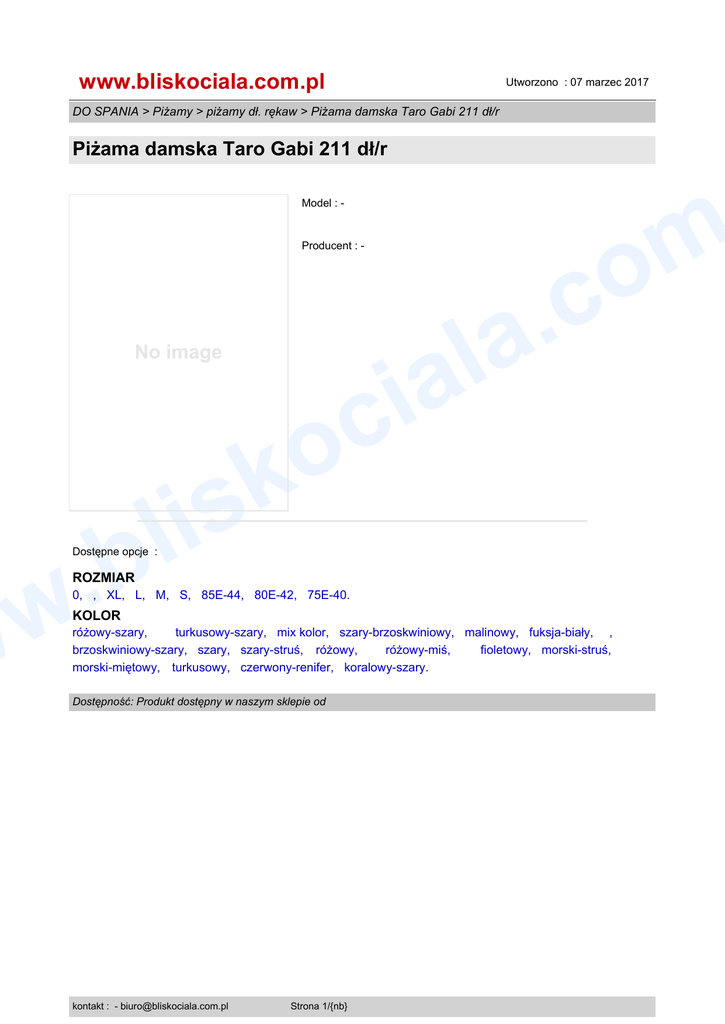 www.bliskociala.com.pl Utworzono : 07 marzec 2017 DO SPANIA > Piżamy > piżamy dł. rękaw > Piżama damska Taro Gabi 211 dł/r Piżama damska Taro Gabi 211 dł/r m o c . a l a Model : - Producent : - No image i c o k il s w b . w Dostępne opcje : ROZMIAR 0, , XL, L, M, S, 85E-44, 80E-42, 75E-40. KOLOR różowy-szary, turkusowy-szary, mix kolor, szary-brzoskwiniowy, malinowy, fuksja-biały, , brzoskwiniowy-szary, szary, szary-struś, różowy, różowy-miś, fioletowy, morski-struś, morski-miętowy, turkusowy, czerwony-renifer, koralowy-szary. Dostępność: Produkt dostępny w naszym sklepie od kontakt : - [email protected] Strona 1/{nb}