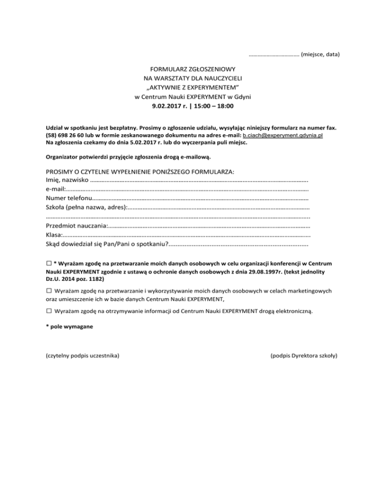 ……………………………. (miejsce, data) FORMULARZ ZGŁOSZENIOWY NA WARSZTATY DLA NAUCZYCIELI „AKTYWNIE Z EXPERYMENTEM” w Centrum Nauki EXPERYMENT w Gdyni 9.02.2017 r. | 15:00 – 18:00 Udział w spotkaniu jest bezpłatny. Prosimy o zgłoszenie udziału, wysyłając niniejszy formularz na numer fax. (58) 698 26 60 lub w formie zeskanowanego dokumentu na adres e-mail: [email protected] Na zgłoszenia czekamy do dnia 5.02.2017 r. lub do wyczerpania puli miejsc. Organizator potwierdzi przyjęcie zgłoszenia drogą e-mailową. PROSIMY O CZYTELNE WYPEŁNIENIE PONIŻSZEGO FORMULARZA: Imię, nazwisko ……………………………………………………………………………………………………………………. e-mail:…………………………………………………………………………………………………………………………………. Numer telefonu…………………………………………………………………………………………………………………… Szkoła (pełna nazwa, adres):………………………………………………………………………………………………… …………………………………………………………………………………………………………………………………………….. Przedmiot nauczania:……………………...…………………………………………………………………………………… Klasa:……………………………………………………………………………………………………………………………………. Skąd dowiedział się Pan/Pani o spotkaniu?.............................................................................. □ * Wyrażam zgodę na przetwarzanie moich danych osobowych w celu organizacji konferencji w Centrum Nauki EXPERYMENT zgodnie z ustawą o ochronie danych osobowych z dnia 29.08.1997r. (tekst jednolity Dz.U. 2014 poz. 1182) □ Wyrażam zgodę na przetwarzanie i wykorzystywanie moich danych osobowych w celach marketingowych oraz umieszczenie ich w bazie danych Centrum Nauki EXPERYMENT, □ Wyrażam zgodę na otrzymywanie informacji od Centrum Nauki EXPERYMENT drogą elektroniczną. * pole wymagane (czytelny podpis uczestnika) (podpis Dyrektora szkoły)