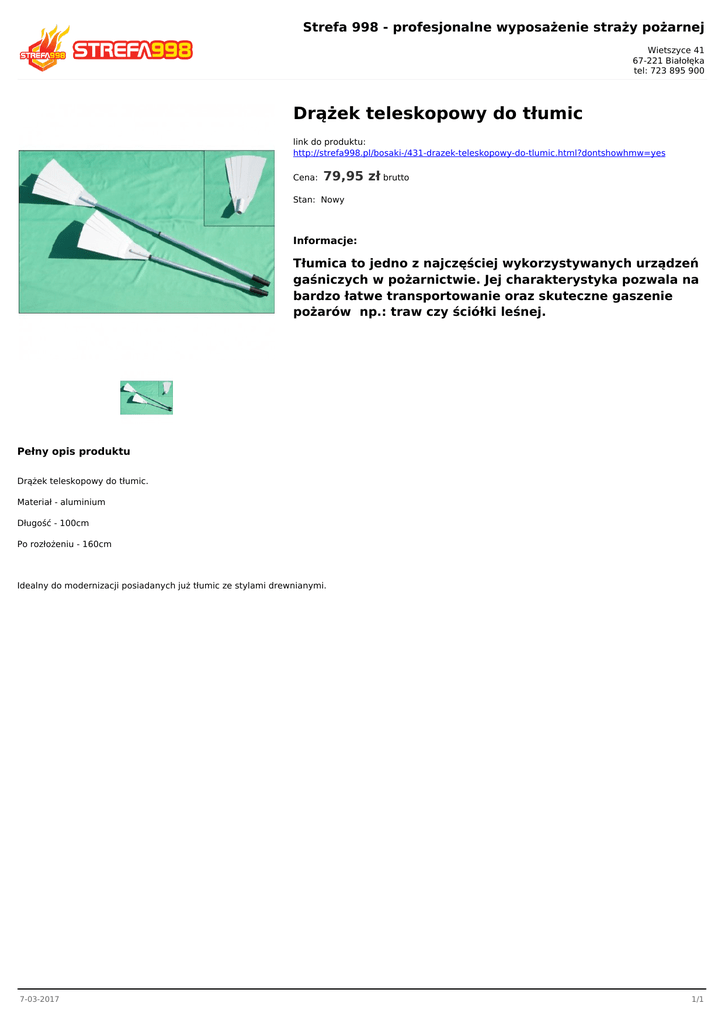 Strefa 998 - profesjonalne wyposażenie straży pożarnej Wietszyce 41 67-221 Białołęka tel: 723 895 900 Drążek teleskopowy do tłumic link do produktu: http://strefa998.pl/bosaki-/431-drazek-teleskopowy-do-tlumic.html?dontshowhmw=yes Cena: 79,95 zł brutto Stan: Nowy Informacje: Tłumica to jedno z najczęściej wykorzystywanych urządzeń gaśniczych w pożarnictwie. Jej charakterystyka pozwala na bardzo łatwe transportowanie oraz skuteczne gaszenie pożarów np.: traw czy ściółki leśnej. Pełny opis produktu Drążek teleskopowy do tłumic. Materiał - aluminium Długość - 100cm Po rozłożeniu - 160cm Idealny do modernizacji posiadanych już tłumic ze stylami drewnianymi. 7-03-2017 1/1