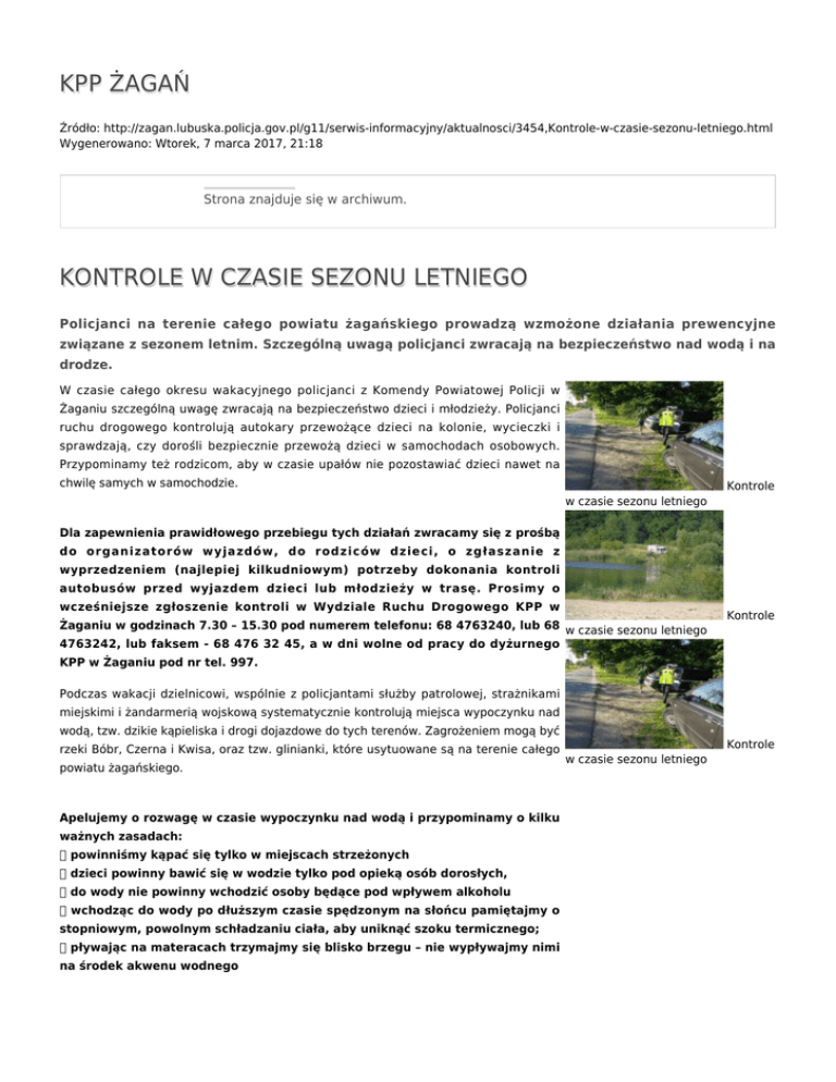 KPP ŻAGAŃ Źródło: http://zagan.lubuska.policja.gov.pl/g11/serwis-informacyjny/aktualnosci/3454,Kontrole-w-czasie-sezonu-letniego.html Wygenerowano: Wtorek, 7 marca 2017, 21:18 Strona znajduje się w archiwum. KONTROLE W CZASIE SEZONU LETNIEGO Policjanci na terenie całego powiatu żagańskiego prowadzą wzmożone działania prewencyjne związane z sezonem letnim. Szczególną uwagą policjanci zwracają na bezpieczeństwo nad wodą i na drodze. W czasie całego okresu wakacyjnego policjanci z Komendy Powiatowej Policji w Żaganiu szczególną uwagę zwracają na bezpieczeństwo dzieci i młodzieży. Policjanci ruchu drogowego kontrolują autokary przewożące dzieci na kolonie, wycieczki i sprawdzają, czy dorośli bezpiecznie przewożą dzieci w samochodach osobowych. Przypominamy też rodzicom, aby w czasie upałów nie pozostawiać dzieci nawet na chwilę samych w samochodzie. Kontrole w czasie sezonu letniego Dla zapewnienia prawidłowego przebiegu tych działań zwracamy się z prośbą do organizatorów wyjazdów, do rodziców dzieci, o zgłaszanie z wyprzedzeniem (najlepiej kilkudniowym) potrzeby dokonania kontroli autobusów przed wyjazdem dzieci lub młodzieży w trasę. Prosimy o wcześniejsze zgłoszenie kontroli w Wydziale Ruchu Drogowego KPP w Żaganiu w godzinach 7.30 – 15.30 pod numerem telefonu: 68 4763240, lub 68 w czasie sezonu letniego 4763242, lub faksem - 68 476 32 45, a w dni wolne od pracy do dyżurnego Kontrole KPP w Żaganiu pod nr tel. 997. Podczas wakacji dzielnicowi, wspólnie z policjantami służby patrolowej, strażnikami miejskimi i żandarmerią wojskową systematycznie kontrolują miejsca wypoczynku nad wodą, tzw. dzikie kąpieliska i drogi dojazdowe do tych terenów. Zagrożeniem mogą być rzeki Bóbr, Czerna i Kwisa, oraz tzw. glinianki, które usytuowane są na terenie całego powiatu żagańskiego. Apelujemy o rozwagę w czasie wypoczynku nad wodą i przypominamy o kilku ważnych zasadach: powinniśmy kąpać się tylko w miejscach strzeżonych dzieci powinny bawić się w wodzie tylko pod opieką osób dorosłych, do wody nie powinny wchodzić osoby będące pod wpływem alkoholu wchodząc do wody po dłuższym czasie spędzonym na słońcu pamiętajmy o stopniowym, powolnym schładzaniu ciała, aby uniknąć szoku termicznego; pływając na materacach trzymajmy się blisko brzegu – nie wypływajmy nimi na środek akwenu wodnego Kontrole w czasie sezonu letniego Ocena: 0/5 (0) Tweetnij