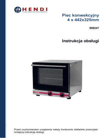 Piec konwekcyjny 4 x 442x325mm 999247 Instrukcja obsługi I Przed uruchomieniem urządzenia naleŜy koniecznie dokładnie przeczytać niniejszą instrukcję obsługi. POLSKI | 1 20-02-2013 POLSKI (Tłumaczenie oryginalnej instrukcji) SPIS TREŚCI: str. INSTRUKCJE DLA INSTALATORA I. II. III. IV. V. VI. VII. OSTRZEśENIA CZYNNOŚCI WSTĘPNE MIEJSCE INSTALACJI PRZYGOTOWANIE DO INSTALACJI PRZYŁĄCZE ELEKTRYCZNE PODŁĄCZENIE ODPŁYWÓW DANE TECHNICZNE 2 2 2 3 3 4 4 INSTRUKCJE DLA UśYTKOWNIKA I. II. III. IV. V. VI. VII. OSTRZEśENIA PIERWSZE UśYTKOWANIE KONSERWACJA ZWYCZAJNA KONSERWACJA NADZWYCZAJNA KONSERWACJA W PRZYPADKU AWARII PORADY DOTYCZĄCE UśYTKOWANIA MECHANICZNY PANEL STEROWANIA 5 6 7 8 9 10 11 POLSKI | 2 WSTĘP Szanowny Kliencie, pragniemy Ci podziękować i pogratulować zakupu; Ŝyczymy sobie, by to był nowy początek pozytywnej i trwałej współpracy. W niniejszym podręczniku zawarto wszelkie informacje niezbędne do poprawnego uŜytkowania, konserwacji i instalacji urządzenia. Celem instrukcji jest umoŜliwienie technikowi – montaŜyście, a przede wszystkim uŜytkownikowi, zaznajomienie się wszystkimi wskazówkami niezbędnymi do bezpiecznego, trwałego i bezawaryjnego funkcjonowania urządzenia. Podręcznik naleŜy przechowywać przez cały cykl Ŝywotności urządzenia. UmoŜliwi się tym samym dostęp do informacji kolejnym uŜytkownikom i technikom. W przypadku jego zagubienia lub zniszczenia, o kopię naleŜy poprosić bezpośrednio producenta lub autoryzowanego sprzedawcę. Producent nie ponosi jakiejkolwiek odpowiedzialności za szkody wyrządzone w mieniu i na osobach powstałe na skutek nieprawidłowego uŜytkowania urządzenia, jego modyfikacji lub napraw przeprowadzonych przez nieupowaŜniony personel oraz w przypadku instalacji nieoryginalnych części wymiennych lub części nieodpowiednich dla przedmiotowego modelu pieca. Urządzenie zgodne jest z dyrektywami CEE. INSTRUKCJE DLA INSTALATORA I. OSTRZEśENIA Przed rozpoczęciem instalacji i pierwszym uruchomieniem naleŜy zapoznać się z treścią niniejszej instrukcji obsługi. Wszystkie czynności związane z instalacją, montaŜem, serwisem i konserwacją nadzwyczajną powinny być wykonywane przez przeszkolony personel, posiadający odpowiednie kwalifikacje (upowaŜniony przez producenta lub autoryzowanego sprzedawcę), w poszanowaniu norm obowiązujących w kraju, w którym instalowane jest urządzenie oraz przepisów odnoszących się do bezpieczeństwa urządzeń i miejsca pracy. Nieprawidłowa instalacja, serwis, konserwacja, czyszczenie lub ewentualne modyfikacje mogą spowodować awarie, szkody i obraŜenia. Urządzenie powinno być uŜywane wyłącznie do gotowania lub odgrzewania potraw w kuchniach przemysłowych. Wszelkie inne sposoby jego uŜytkowania uznaje się za niewłaściwe i tym samym niebezpieczne. II. CZYNNOŚCI WSTĘPNE Po otrzymaniu produktu naleŜy upewnić się, Ŝe nie został on uszkodzony podczas transportu oraz Ŝe opakowanie nie zostało naruszone. W przypadku uszkodzeń lub braku części, natychmiast skontaktować się z przewoźnikiem oraz sprzedawcą/producentem, wskazując kode (Art.) i numer seryjny (Ser N°) oraz dołączając dokumentację fotograficzną. Skontrolować, czy miejsce instalacji jest w pełni dostępne, czy nie zostało zastawione przejście do drzwi, korytarzy i innych wyjść. UWAGA: podczas transportu urządzenie moŜe się przewrócić, naraŜając się tym samym na uszkodzenia oraz powodując szkody materialne i osobowe. Aby tego uniknąć, transport winien być przeprowadzany przy uŜyciu stosowych środków, uwzględniając równieŜ cięŜar urządzenia. Pod Ŝadnym pozorem nie naleŜy go ciągnąć i przechylać. Urządzenie naleŜy podnieść równolegle do podłoŜa, a następnie przenosić w poziomie. III. MIEJSCE INSTALACJI Pomieszczenia zamknięte z dobrą wentylację (instalacji nie naleŜy dokonywać na zewnętrz). Przed ustaleniem pozycji urządzenia, skontrolować jego wymiary oraz pozycję łączy elektrycznych. POLSKI | 3 Zaleca się umieszczenie piekarnika pod okapem kuchennym lub zagwarantowanie odprowadzania gorących oparów i zapachów na zewnątrz. Piekarnik naleŜy umieścić na płaskiej powierzchni, unikając tym samym jego ześlizgnięcia i przewrócenia. Miejsce, w którym będzie instalowane urządzenie powinno wytrzymać jego cięŜar i maksymalne obciąŜenie. W celu uzyskania niezbędnych danych patrz: Tabliczka Znamionowa na tylnej części pieca. NaleŜy zwrócić szczególną uwagę na to, by usytuowanie urządzenia pozwalało na całkowite otworzenie jego drzwiczek. Tylnia część piekarnika powinna był łatwo dostępna, umoŜliwiając tym samym wykonanie podłączeń elektrycznych, oraz czynności związanych z konserwacją. Urządzenie nie jest przystosowane do zabudowy. Wokół całego jego korpusu naleŜy zostawić wolną przestrzeń (5 cm). Odradza się umieszczanie urządzenia w pobliŜu źródeł ciepła, frytkownic i innych zbiorników z gorącymi płynami; jeśli nie jest to moŜliwe naleŜy przestrzegać następujących odległości bezpieczeństwa: 50 cm po bokach i nad piekarnikiem, 70 cm z tyłu urządzenia. W Ŝadnym wypadku urządzenia nie naleŜy stawiać w pobliŜu materiałów lub zbiorników z materiałami łatwopalnymi (ściany, meble, parawany, butle z gazem): istnieje ryzyko wzniecenia poŜaru. Jeśli nie jest to moŜliwe, części łatwopalne naleŜy zabezpieczyć materiałem izolacyjnym, zwracając szczególną uwagę na normy dotyczące ochrony przeciwpoŜarowej. IV. PRZYGOTOWANIE DO INSTALACJI Usunąć opakowanie (drewniana skrzynia/karton) i zutylizować zgodnie z normami obowiązującymi w kraju, w którym instalowane jest urządzenie. USUWANIE FOLII OCHRONNEJ I INNE CZYNNOŚCI Całkowicie usunąć folię ochronną z zewnętrznych i +wewnętrznych ścianek urządzenia (patrz: ilustracja). Z wnętrza urządzenia usunąć materiały informacyjne i ewentualne plastikowe woreczki. REGULA