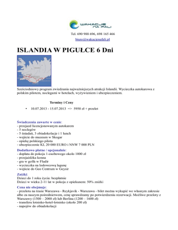 Tel. 690 988 696, 698 165 466 [email protected] ISLANDIA W PIGUŁCE 6 Dni Sześciodniowy program zwiedzania najważniejszych atrakcji Islandii. Wycieczka autokarowa z polskim pilotem, noclegami w hotelach, wyżywieniem i ubezpieczeniem. Terminy i Ceny • 10.07.2013 - 15.07.2013 => 5950 zł + przelot Świadczenia zawarte w cenie: - przejazd licencjonowanym autokarem - 5 noclegów - 5 śniadań, 3 obiadokolacje i 1 lunch - wejście do muzeum w Skogar - opiekę polskiego pilota - ubezpieczenie KL 20 000 EURO i NNW 7 000 PLN Dodatkowo płatne / opcjonalnie: - dopłata do pokoju 1-osobowego około 1000 zł - przejażdżka konna - gra w golfa w Fludir - wycieczka na lodowcową lagunę - wejście do Geo Centrum w Geysir Zniżki: Dzieci do 1 roku życia: bezpłatnie Dzieci w wieku 2-11 lat w pokoju z opiekunem: 50% zniżki Cena nie obejmuje: - przelotu na trasie Warszawa - Reykjavik - Warszawa - bilet można wykupić we własnym zakresie albo za naszym pośrednictwem, cenę sprawdzamy po potwierdzeniu rezerwacji. Możliwe przeloty z Warszawy (1500 – 2000 zł) lub Berlina (1200 – 1600 zł) - transferu lotnisko-hotel-lotnisko (około 200 zł) - napojów do obiadokolacji Program Największe atrakcje Islandii w 6 dni. 1 dzień Wylot z Polski i przylot do Reykjaviku. Przejazd do hotelu i zakwaterowanie. 2 dzień Po śniadaniu wyruszymy z Reykiaviku przez miasto Hveragerdi i dotrzemy do Skogar. Następnie do rezerwatu Dyrholaey*, gdzie w Kirkjubaejarklaustur znajduje się XII - wieczny klasztor katolicki. 3 dzień Podróż z Kirkjubaejarklaustur do Parku Narodowego Skaftafell, gdzie znajduje się największy lodowiec w Europie, Vatnajokull. Następnie do laguny lodowcowej Jokulsarlon. 4 dzień Przez Fjallabaksleid wewnętrznym szlakiem dotrzemy do Landmannalaugar, wspaniałego regionu otoczonego kolorowymi górami, gdzie będzie można skorzystać z kąpieli w naturalnie ciepłym basenie. Jest to doskonały sposób aby ożywić ciało i duszę. Zobaczymy imponującą Heklę - ikonę islandzkich wulkanów, następnie dotrzemy do doliny Thjorsardalur. Uwaga: Jeśli trasa do Landmannalaugar jest zamknięta z powodu warunków drogowych (wiosna lub wczesne lato) wycieczka odbędzie się przez pole pokryte lawą i piaskiem uformowanym przez napływy od lodowca. Następnie pokonamy dwa piękne wodospady i dolinę Þjórsárdalur. 5 dzień Przejazd na obszar gejzerów, zobaczymy wspaniały Geysir i Strokkur, woda z gorących źródeł jest tutaj wyrzucana co kilka minut. Dalej na Gullfoss - jeden z najbardziej imponujących islandzkich wodospadów. Następnie zatrzymamy się w Parku Narodowym Pingvellir, gdzie od starożytności przez wieki nad brzegiem największego Islandzkiego jeziora spotykali się parlamentarzyści. W tym miejscu zakończymy naszą podróż i wrócimy do Reykiaviku. 6 dzień Transfer na lotnisko i powrót do Polski. Dodatkowe Informacje *Dyrholaey jest zamknięte w sezonie wiosennym, od połowy maja do 23 czerwca.