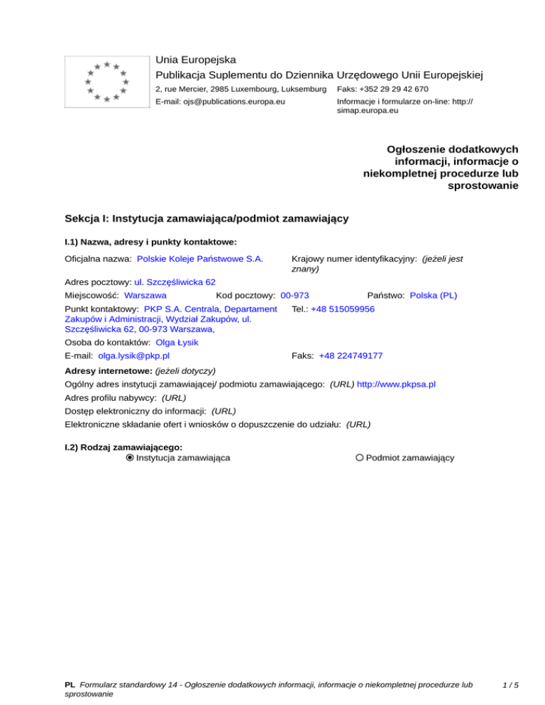 Unia Europejska Publikacja Suplementu do Dziennika Urzędowego Unii Europejskiej 2, rue Mercier, 2985 Luxembourg, Luksemburg Faks: +352 29 29 42 670 E-mail: [email protected] Informacje i formularze on-line: http:// simap.europa.eu Ogłoszenie dodatkowych informacji, informacje o niekompletnej procedurze lub sprostowanie Sekcja I: Instytucja zamawiająca/podmiot zamawiający I.1) Nazwa, adresy i punkty kontaktowe: Oficjalna nazwa: Polskie Koleje Państwowe S.A. Krajowy numer identyfikacyjny: (jeżeli jest znany) _____ Adres pocztowy: ul. Szczęśliwicka 62 Miejscowość: Warszawa Kod pocztowy: 00-973 Punkt kontaktowy: PKP S.A. Centrala, Departament Zakupów i Administracji, Wydział Zakupów, ul. Szczęśliwicka 62, 00-973 Warszawa, Państwo: Polska (PL) Tel.: +48 515059956 Osoba do kontaktów: Olga Łysik E-mail: [email protected] Faks: +48 224749177 Adresy internetowe: (jeżeli dotyczy) Ogólny adres instytucji zamawiającej/ podmiotu zamawiającego: (URL) http://www.pkpsa.pl Adres profilu nabywcy: (URL) _____ Dostęp elektroniczny do informacji: (URL) _____ Elektroniczne składanie ofert i wniosków o dopuszczenie do udziału: (URL) _____ I.2) Rodzaj zamawiającego: Instytucja zamawiająca Podmiot zamawiający PL Formularz standardowy 14 - Ogłoszenie dodatkowych informacji, informacje o niekompletnej procedurze lub sprostowanie 1/5 Sekcja II: Przedmiot zamówienia II.1.1) Nazwa nadana zamówieniu: Pełnienie funkcji Koordynatora prac i Inspektora Nadzoru Inwestorskiego dla zadań inwestycyjnych realizowanych na dworcu kolejowym Warszawa Centralna II.1.2) Krótki opis zamówienia lub zakupu: (podano w pierwotnym ogłoszeniu) Przedmiotem zamówienia jest świadczenie usług zarządzania, koordynacji i nadzoru inwestorskiego dla zadań inwestycyjnych planowanych do realizacji na dworcu kolejowym Warszawa Centralna. Usługi objęte przedmiotem zamówienia świadczone będą dla zadań inwestycyjnych: 1) Przebudowa systemu izolacji termicznej i ogrzewania oraz stropu dworca kolejowego Warszawa Centralna: a) Wykonanie dokumentacji wymiany fasady szklanej, okien, wiatrołapów z drzwiami automatycznymi oraz drzwi rozwiernych dworca kolejowego Warszawa Centralna oraz wykonanie na jej podstawie robót budowlanych; b) Wykonanie izolacji termicznej stropodachu Dworca Kolejowego Warszawa Centralna; c) Wykonanie systemu Ogrzewania hali głównej dworca Warszawa Centralna; 2) Estetyzacja Hali głównej, galerii zachodniej wraz z WKD oraz galerii północnej; 3) Wykonanie systemów i rozwiązań ppoż. w tym systemu oddymiania dla dworca kolejowego Warszawa Centralna. II.1.3) Wspólny Słownik Zamówień (CPV) Główny przedmiot Dodatkowe przedmioty Słownik główny 71000000 71500000 71300000 71600000 71247000 71248000 71520000 Słownik uzupełniający (jeżeli dotyczy) PL Formularz standardowy 14 - Ogłoszenie dodatkowych informacji, informacje o niekompletnej procedurze lub sprostowanie 2/5 Sekcja IV: Procedura IV.1)Rodzaj procedury (podano w pierwotnym ogłoszeniu) Otwarta Ograniczona Ograniczona przyspieszona Negocjacyjna Negocjacyjna przyspieszona Dialog konkurencyjny Negocjacyjna z uprzednim ogłoszeniem Negocjacyjna bez uprzedniego ogłoszenia Negocjacyjna z publikacją ogłoszenia o zamówieniu Negocjacyjna bez publikacji ogłoszenia o zamówieniu Udzielenie zamówienia bez uprzedniej publikacji ogłoszenia o zamówieniu w Dzienniku Urzędowym Unii Europejskiej IV.2)Informacje administracyjne IV.2.1)Numer referencyjny: (podano w pierwotnym ogłoszeniu) Numer postępowania: WNP-001168 IV.2.2)Dane referencyjne ogłoszenia w przypadku ogłoszeń przesłanych drogą elektroniczną: Pierwotne ogłoszenie przesłane przez eNotices TED eSender Login: ENOTICES_ania Dane referencyjne ogłoszenia: 2014-112620 rok i numer dokumentu IV.2.3)Ogłoszenie, którego dotyczy niniejsza publikacja: Numer ogłoszenia w Dz.U.: 2014/S 164-293725 z dnia: 28/08/2014 (dd/mm/rrrr) IV.2.4)Data wysłania pierwotnego ogłoszenia: 26/08/2014 (dd/mm/rrrr) PL Formularz standardowy 14 - Ogłoszenie dodatkowych informacji, informacje o niekompletnej procedurze lub sprostowanie 3/5 Sekcja VI: Informacje uzupełniające VI.1) Ogłoszenie dotyczy: Procedury niepełnej Sprostowania Informacji dodatkowych VI.2) Informacje na temat niepełnej procedury udzielenia zamówienia: Postępowanie o udzielenie zamówienia zostało przerwane Postępowanie o udzielenie zamówienia uznano za nieskuteczne Zamówienia nie udzielono Zamówienie może być przedmiotem ponownej publikacji VI.3) Informacje do poprawienia lub dodania : VI.3.1) Zmiana oryginalnej informacji podanej przez instytucję zamawiającą Publikacja w witrynie TED niezgodna z oryginalną informacją, przekazaną przez instytucję zamawiającą Oba przypadki VI.3.2) W ogłoszeniu pierwotnym W odpowiedniej dokumentacji przetargowej (więcej informacji w odpowiedniej dokumentacji przetargowej) W obu przypadkach (więcej informacji w odpowiedniej dokumentacji przetargowej) VI.3.3) Tekst, który należy poprawić w pierwotnym ogłoszeniu Miejsce, w którym znajduje się Zamiast: Powinno być: zmieniany tekst: 1) posiadania wiedzy i 1) posiadania wiedzy i III.2.3) Kwalifikacje techniczne ust. 1 doświadczenia: Wykonawca musi doświadczenia: Wykonawca musi wykazać się, że w okresie ostatnich wykazać się, że w okresie ostatnich pkt 1 trzech lat przed upływem terminu trzech lat przed upływem terminu składania ofert, a jeżeli okres składania ofert, a jeżeli okres prowadzenia działalności jest prowadzenia działalności jest krótszy – w tym okresie, wykonał krótszy – w tym okresie, wykonał należycie minimum dwa odrębne należycie minimum dwa odrębne zamówienia (umowy) na pełnienie zamówienia (umowy) na pełnienie Kompleksowej Usługi Nadzoru Kompleksowej Usługi Nadzoru Inwestorskiego nad realizacją Inwestorskiego nad realizacją robót budowlanych obejmujących robót budowlanych obejmujących budynek użyteczności publicznej, budynek użyteczności publ