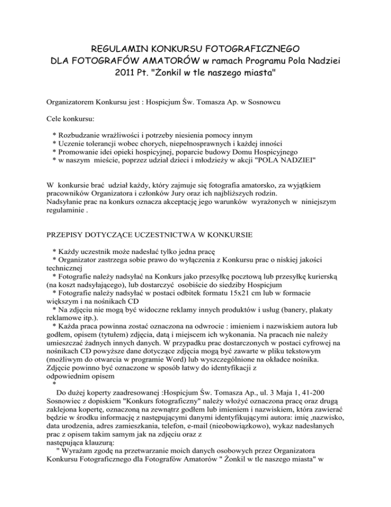 REGULAMIN KONKURSU FOTOGRAFICZNEGO DLA FOTOGRAFÓW AMATORÓW w ramach Programu Pola Nadziei 2011 Pt. "śonkil w tle naszego miasta" Organizatorem Konkursu jest : Hospicjum Św. Tomasza Ap. w Sosnowcu Cele konkursu: * Rozbudzanie wraŜliwości i potrzeby niesienia pomocy innym * Uczenie tolerancji wobec chorych, niepełnosprawnych i kaŜdej inności * Promowanie idei opieki hospicyjnej, poparcie budowy Domu Hospicyjnego * w naszym mieście, poprzez udział dzieci i młodzieŜy w akcji "POLA NADZIEI" W konkursie brać udział kaŜdy, który zajmuje się fotografia amatorsko, za wyjątkiem pracowników Organizatora i członków Jury oraz ich najbliŜszych rodzin. Nadsyłanie prac na konkurs oznacza akceptację jego warunków wyraŜonych w niniejszym regulaminie . PRZEPISY DOTYCZĄCE UCZESTNICTWA W KONKURSIE * KaŜdy uczestnik moŜe nadesłać tylko jedna pracę * Organizator zastrzega sobie prawo do wyłączenia z Konkursu prac o niskiej jakości technicznej * Fotografie naleŜy nadsyłać na Konkurs jako przesyłkę pocztową lub przesyłkę kurierską (na koszt nadsyłającego), lub dostarczyć osobiście do siedziby Hospicjum * Fotografie naleŜy nadsyłać w postaci odbitek formatu 15x21 cm lub w formacie większym i na nośnikach CD * Na zdjęciu nie mogą być widoczne reklamy innych produktów i usług (banery, plakaty reklamowe itp.). * KaŜda praca powinna zostać oznaczona na odwrocie : imieniem i nazwiskiem autora lub godłem, opisem (tytułem) zdjęcia, datą i miejscem ich wykonania. Na pracach nie naleŜy umieszczać Ŝadnych innych danych. W przypadku prac dostarczonych w postaci cyfrowej na nośnikach CD powyŜsze dane dotyczące zdjęcia mogą być zawarte w pliku tekstowym (moŜliwym do otwarcia w programie Word) lub wyszczególnione na okładce nośnika. Zdjęcie powinno być oznaczone w sposób łatwy do identyfikacji z odpowiednim opisem * Do duŜej koperty zaadresowanej :Hospicjum Św. Tomasza Ap., ul. 3 Maja 1, 41-200 Sosnowiec z dopiskiem "Konkurs fotograficzny" naleŜy włoŜyć oznaczona pracę oraz drugą zaklejona kopertę, oznaczoną na zewnątrz godłem lub imieniem i nazwiskiem, która zawierać będzie w środku informację z następującymi danymi identyfikującymi autora: imię ,nazwisko, data urodzenia, adres zamieszkania, telefon, e-mail (nieobowiązkowo), wykaz nadesłanych prac z opisem takim samym jak na zdjęciu oraz z następująca klauzurą: " WyraŜam zgodę na przetwarzanie moich danych osobowych przez Organizatora Konkursu Fotograficznego dla Fotografów Amatorów " śonkil w tle naszego miasta" w celach wynikających z regulaminu tego Konkursu, zgodnie z ustawą z dnia 29 sierpnia 1997 o ochronie danych osobowych(Dz. U. z 1997 r., nr 133, poz. 883 z późniejszymi zmianami). Poprzez wysyłanie zdjęć na Konkurs nieodpłatnie przenoszę na Organizatora wszelkie autorskie prawa majątkowe do nich, na wszystkich polach eksploatacji, o których mowa w art. 50 Ustawy z dnia 4 lutego 1994 roku o prawie autorskim i prawach pokrewnych (Dz. U . z 2000 roku Nr 80, poz. 904 z późniejszymi zmianami)." * Osoby niepełnoletnie dołączają w zaklejonej kopercie pisemną zgodę rodziców lub opiekunów prawnych na udział w Konkursie * W Konkursie mogą brać udział jedynie te prace, które nie zostały nigdzie publikowane, ani nie brały udziału w Ŝadnym konkursie * Organizator zastrzega sobie prawo do dyskwalifikowania prac nie spełniających wymienionych wyŜej wymogów * Organizator nie zwraca prac biorących udział w konkursie, prac zdyskwalifikowanych jak równieŜ z niego wyłączonych TERMINARZ Konkurs trwa do 15 kwietnia 2011 roku. Fotografie nadesłane po terminie nie będą brane pod uwagę w Konkursie. Organizator powołuje Jury Konkursu w składzie 3 osobowym. Wyniki Konkursu zostaną podane na stronie internetowej Organizatora. Ogłoszenie wyników dotyczących nagrody głównej nastąpi w czasie finału kampanii, a nagrody zostaną wręczone podczas finałowego festynu. Zwycięzca otrzyma telefoniczne i listowne powiadomienie. NAGRODY I WYRÓZNIENIA Organizator przewiduje nagrody : * Za I, * Za II, * Za III miejsce, * WyróŜnienia WYKORZYSTANIE PRAC NADESŁANYCH NA KONKURS Organizator uzyskuje prawo do umieszczania nadsyłanych na Konkurs prac (oznaczonych imieniem i nazwiskiem autora) w lokalnej prasie, a takŜe do wielokrotnej ekspozycji prac nadesłanych na Konkurs w róŜnych miejscach. Organizator uzyskuje prawo do wielokrotnego umieszczania prac nadesłanych na Konkurs (oznaczonych imieniem i nazwiskiem) na wydawanych przez siebie materiałach.